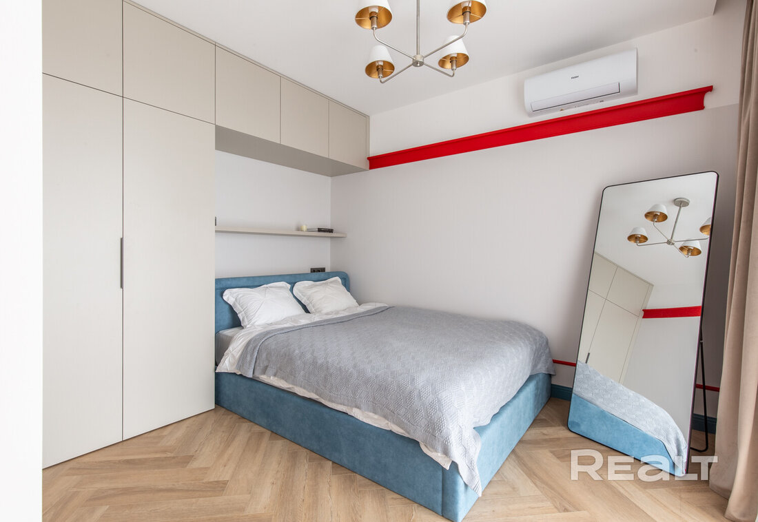 В изолированной комнате оборудована спальня. Здесь стоит большая кровать, есть зеркало, шкаф и закрытые полки. Установлен кондиционер. Интерьер поддерживается теми же цветами — красным и нежно-голубым.