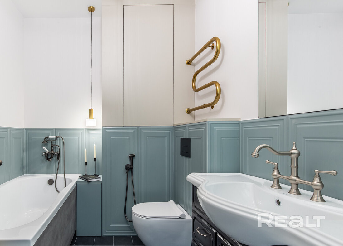 В совмещенном санузле установлена ванна, инсталляция и гигиенический душ. Подключена стирально-сушильная машина. Пол с подогревом.