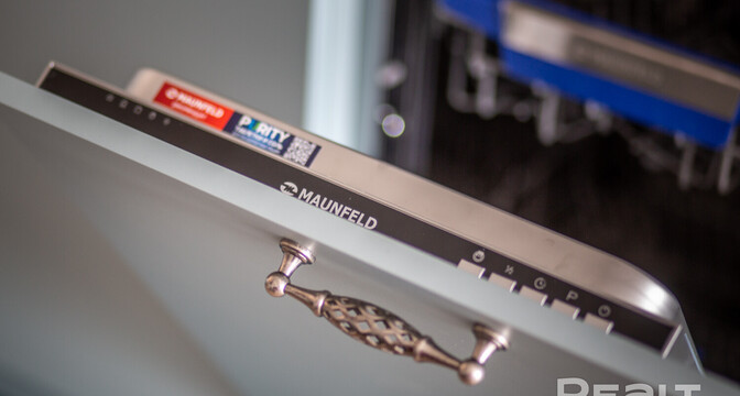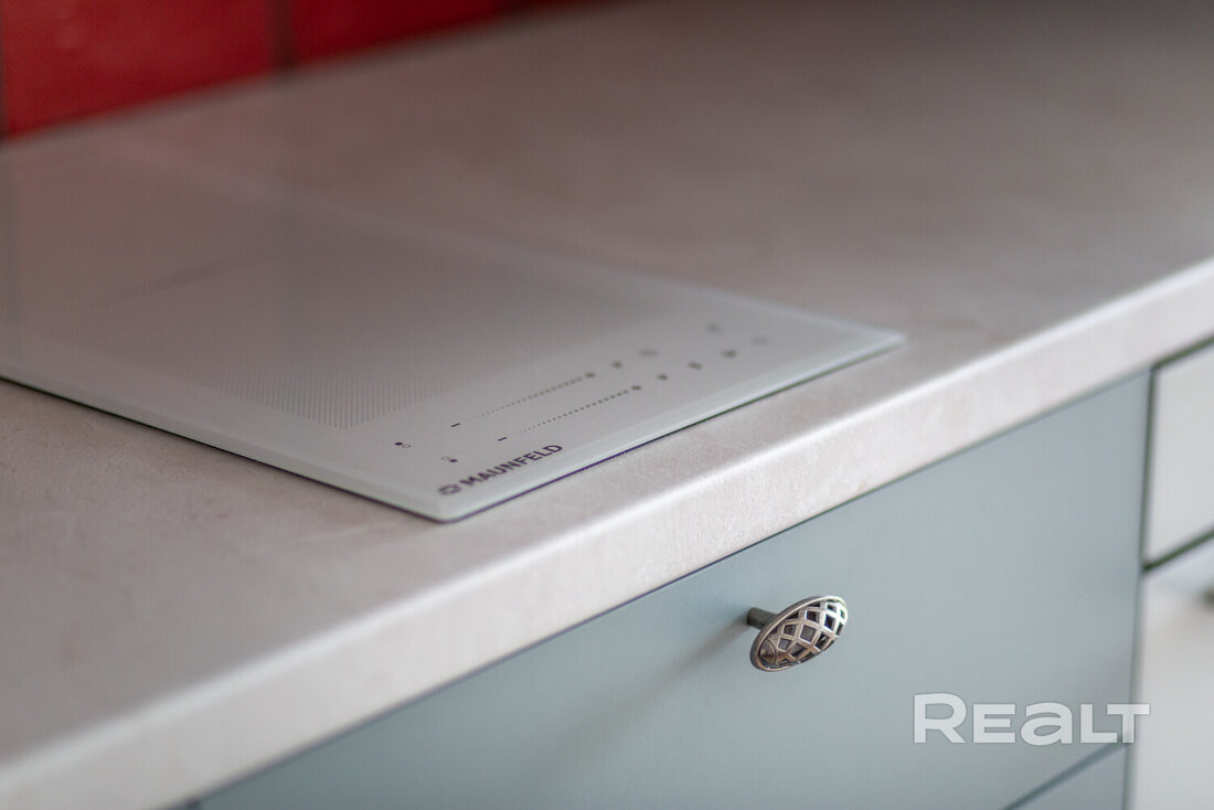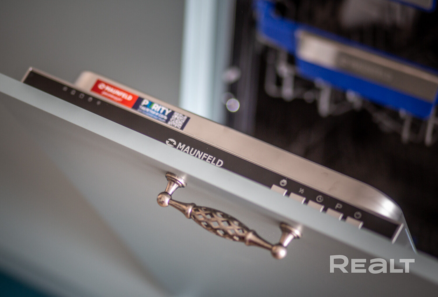 Из техники в кухонной зоне есть встроенный холодильник, индукционная панель, духовой шкаф с функцией СВЧ, посудомоечная машина и вытяжка — все фирмы Мaunfeld.