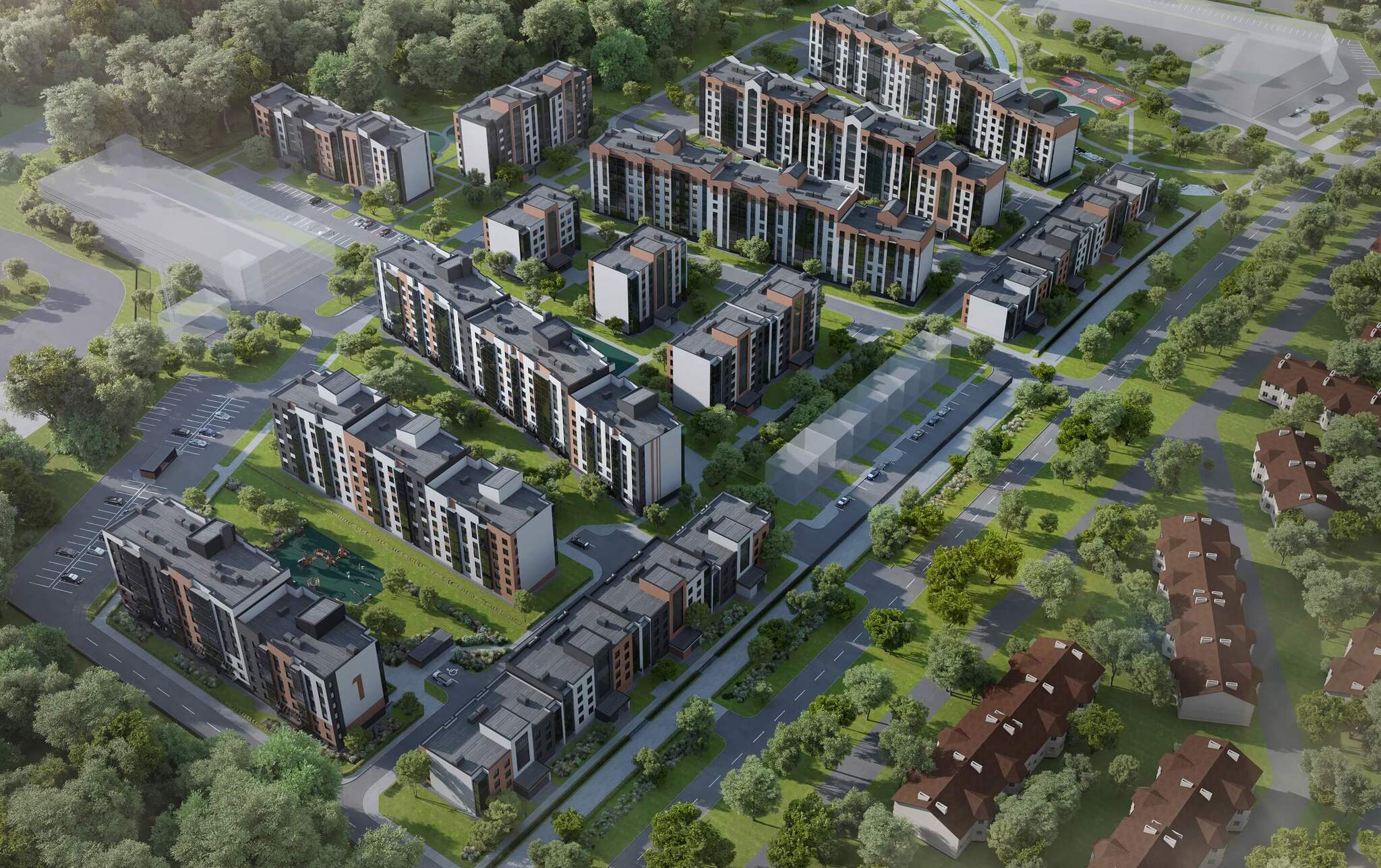 Весь комплекс будет состоять из 13 домов различного формата: ситихаусы по 6−7 этажей и клубные дома по 3−5 этажей. Застройщик обещает семейную атмосферу в стиле Хюгге: арт-объекты, лаундж зоны, игровые и спортивные площадки. Кроме того, в комплексе появится детский сад, торговый центр и центральная площадь с зоной для фудтраков. На строительство ЖК отведено 36 месяцев (или 3 года).