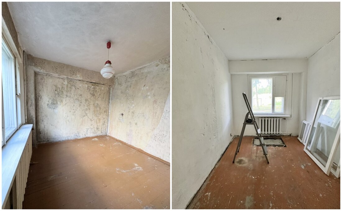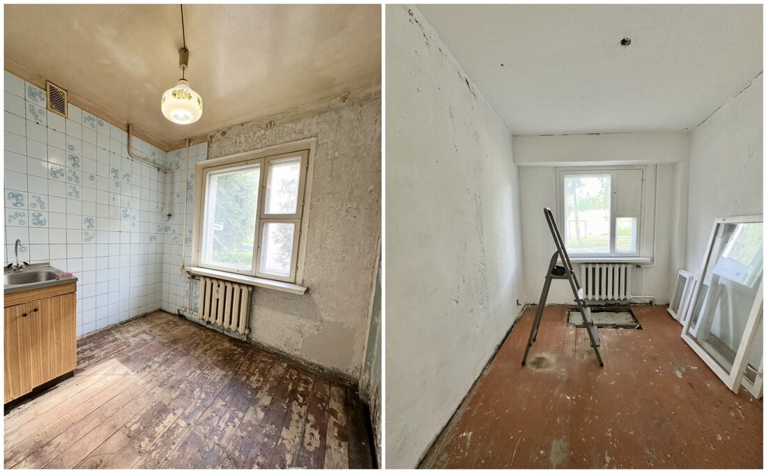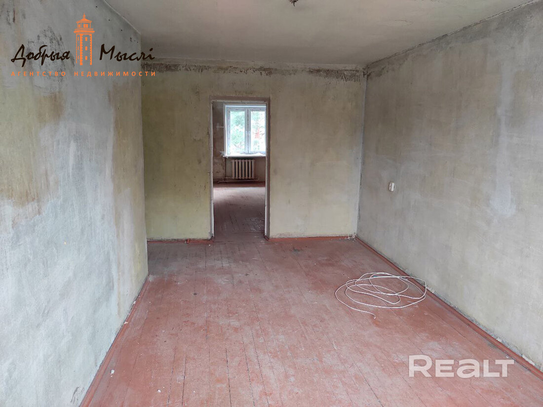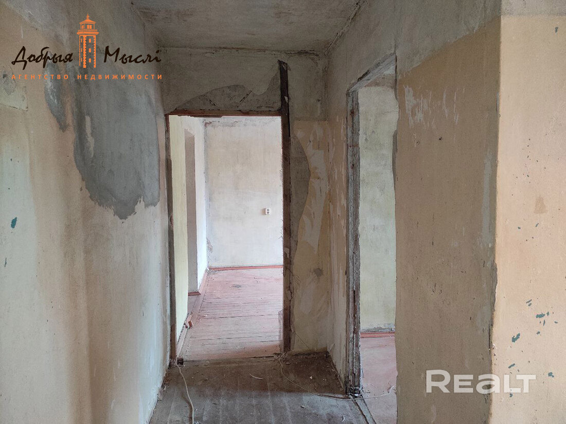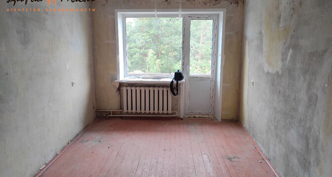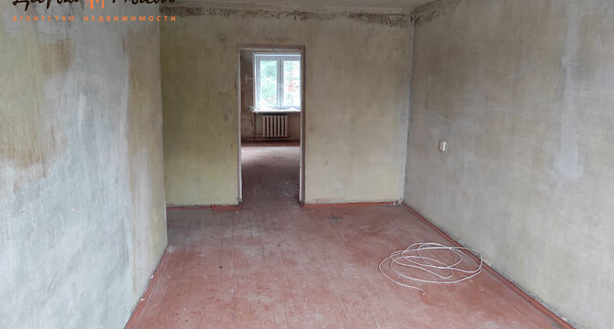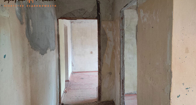Дом после капремонта. Само жилье подготовлено к обновлению: убрана мебель, очищены стены. На полу лежат деревянные полы. Одна комната здесь проходная.