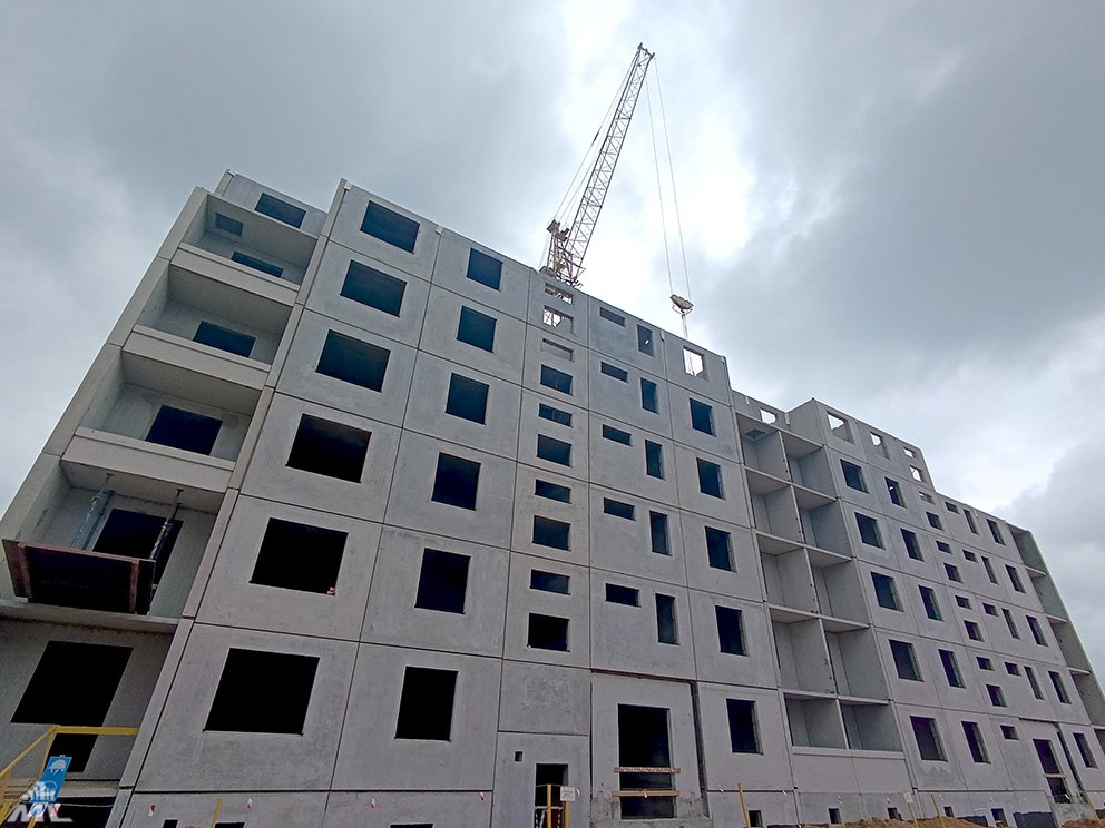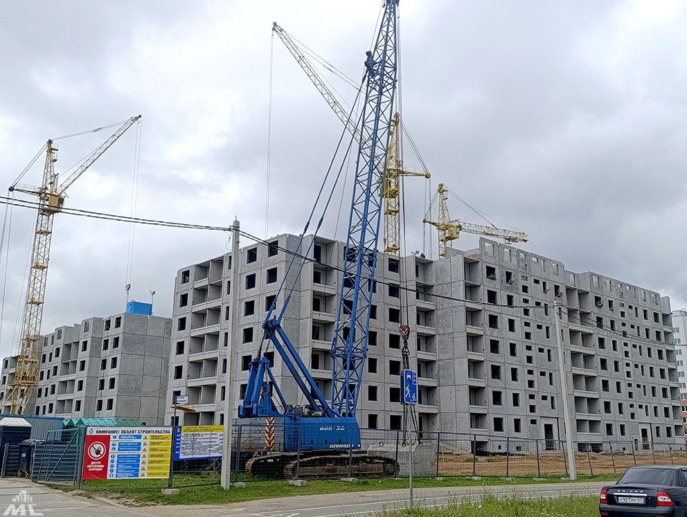 В доме № 5 уже возводят восьмой этаж, в двух других зданиях — седьмые. Монтаж коробок зданий планируется завершить до конца августа. Строительство идет быстро: двухсекционный дом прирастает примерно на шесть этажей в месяц, трехсекционные — на четыре. Еще один дом (на 116 квартир), построенный ранее, уже готов к вводу в эксплуатацию.