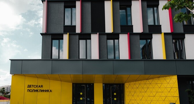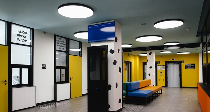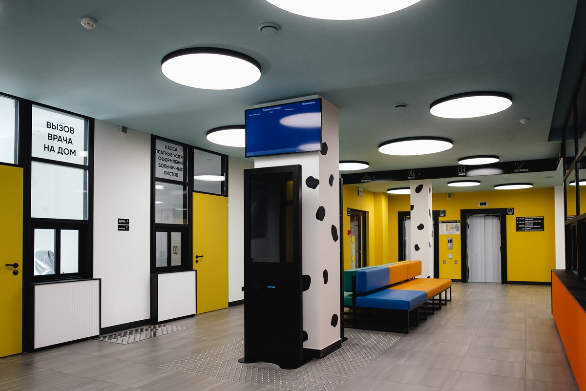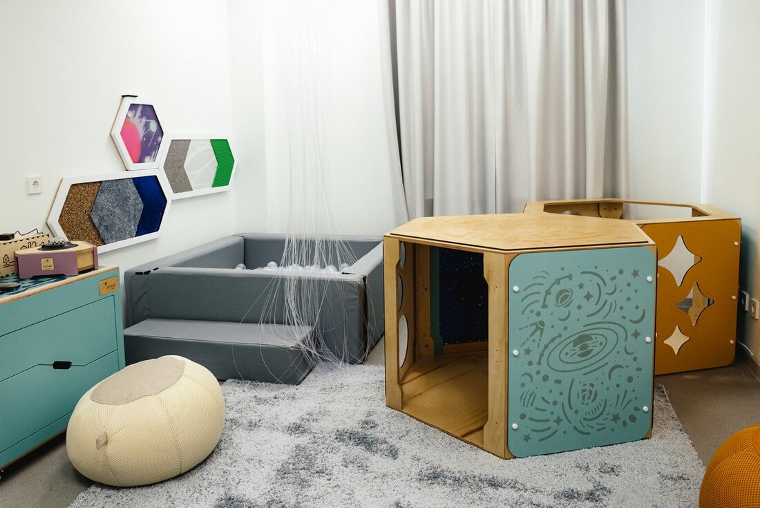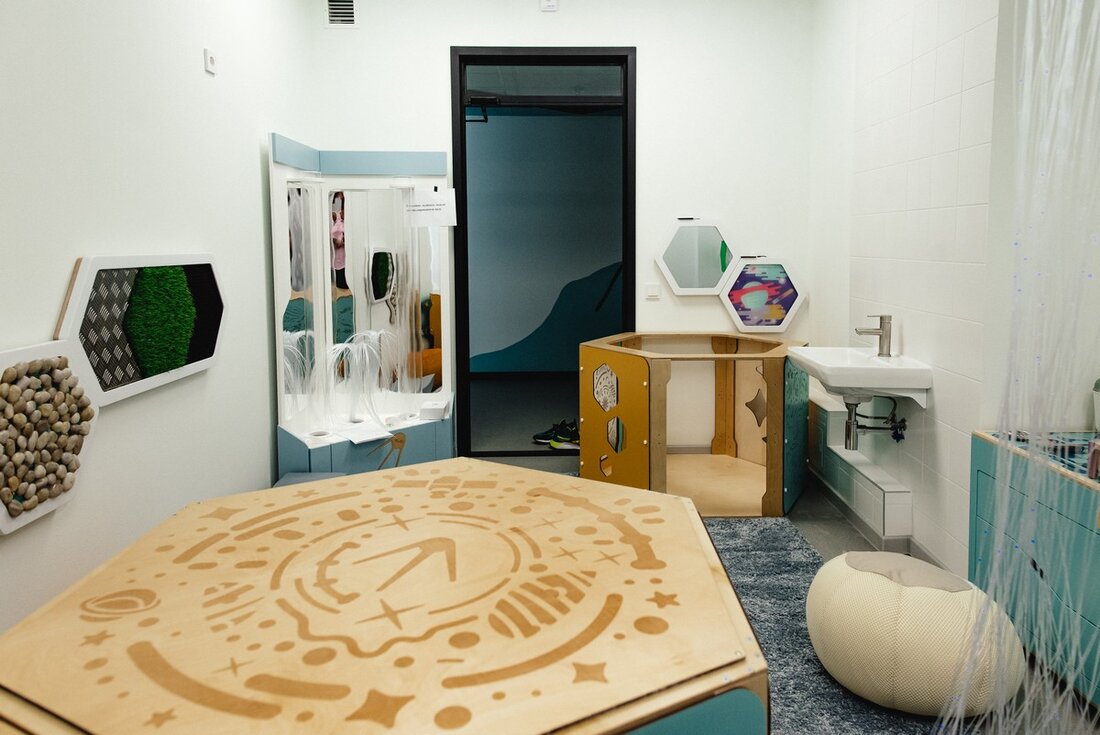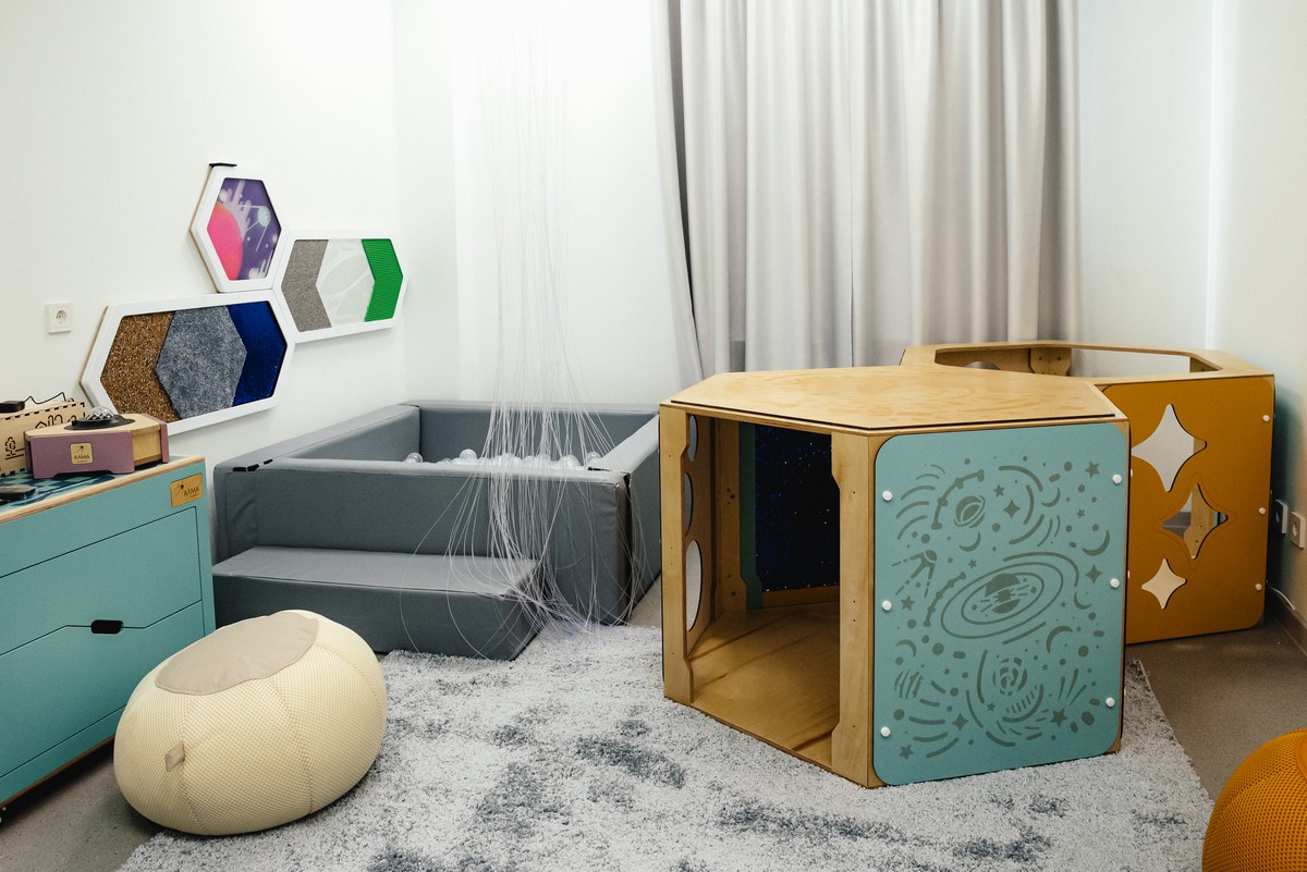 В детском корпусе предусмотрена сенсорная комната для абилитации детей с патологиями. Это достаточно редкое решение для поликлиник. Такая комната предназначена для ранней терапии новорожденных с патологиями.