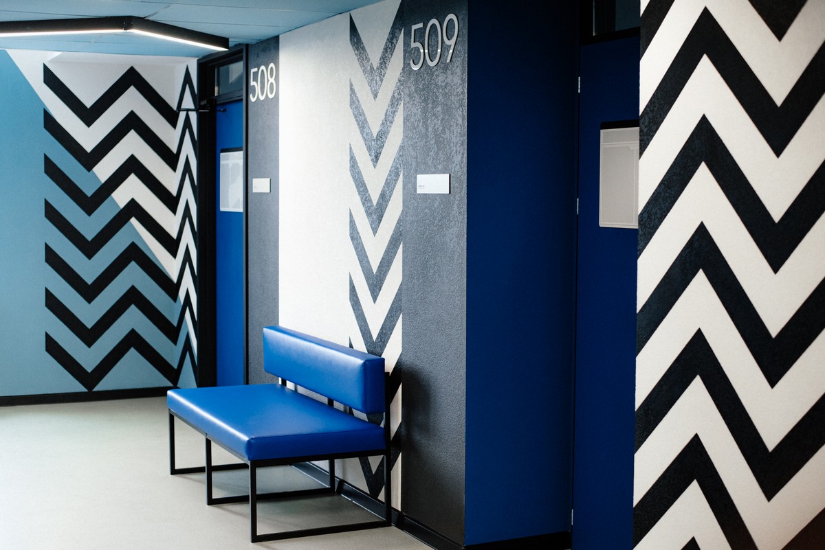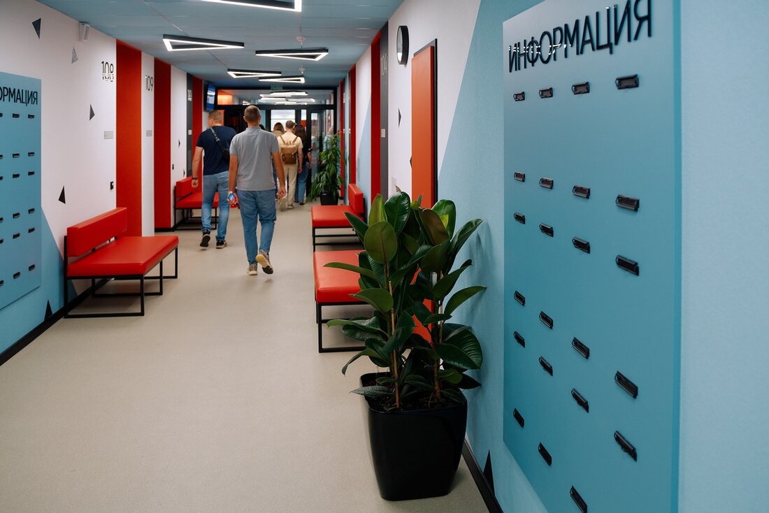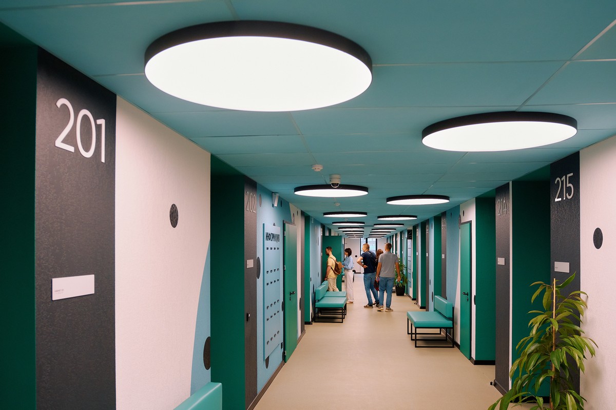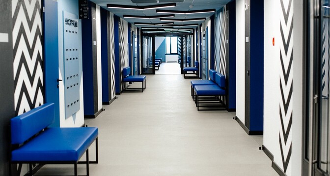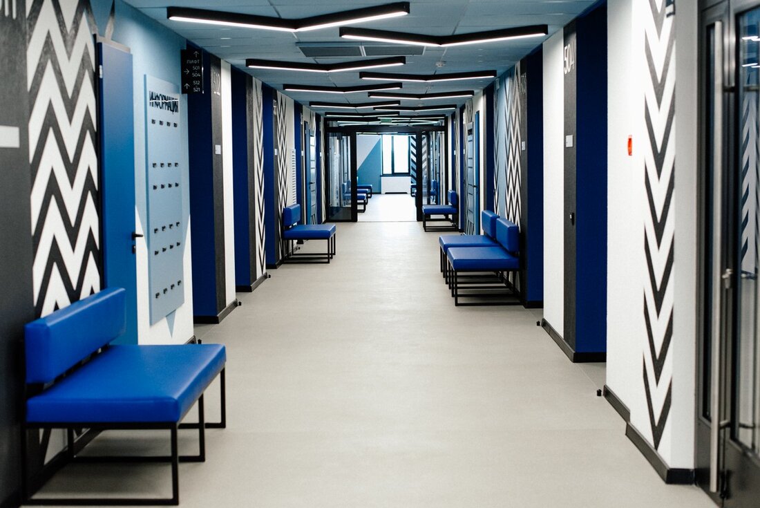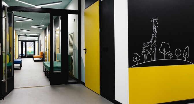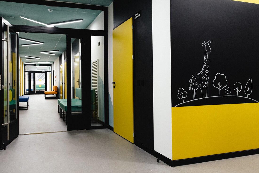 В детском корпусе предусмотрена сенсорная комната для абилитации детей с патологиями. Это достаточно редкое решение для поликлиник. Такая комната предназначена для ранней терапии новорожденных с патологиями.