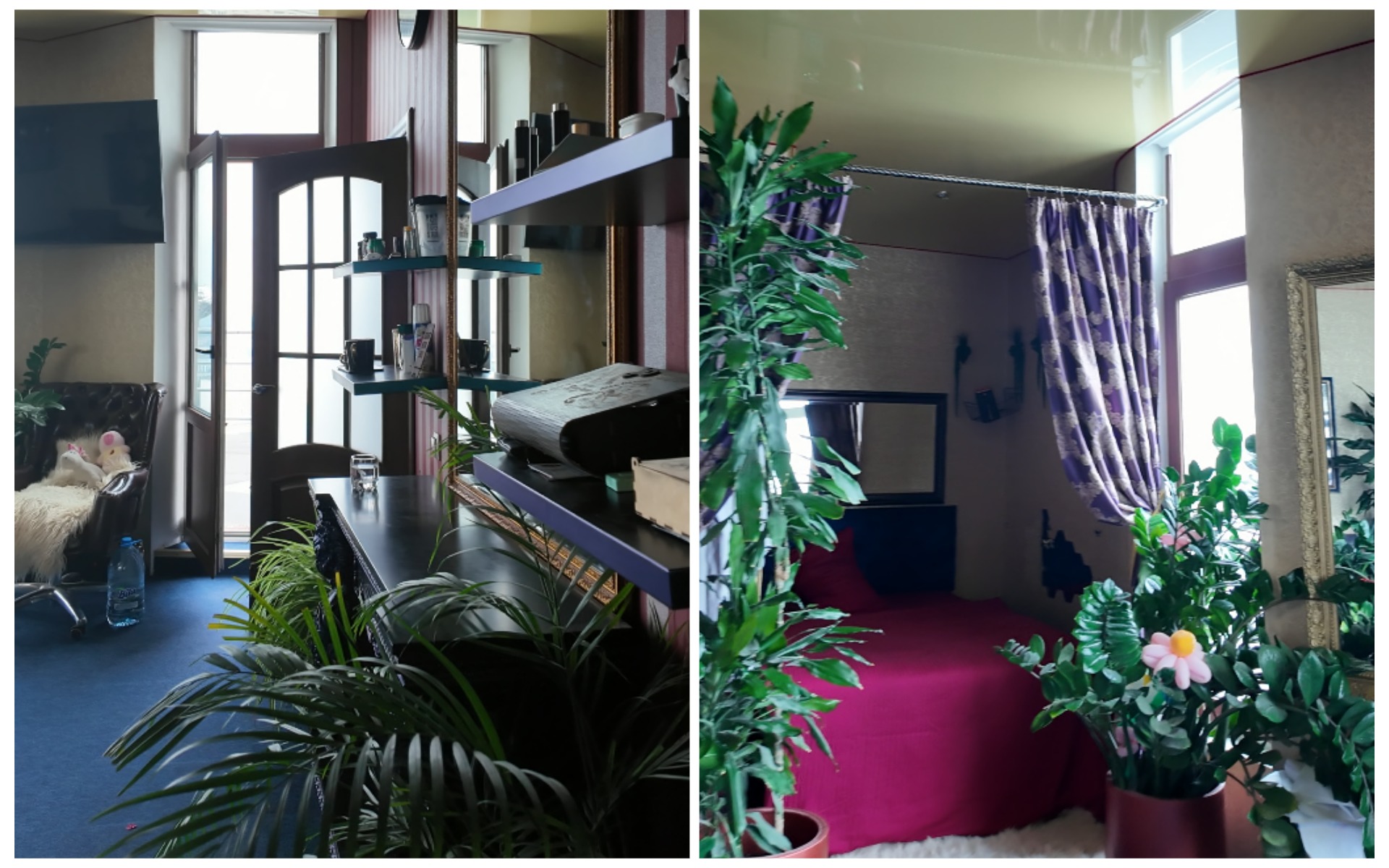 Судя по представленным фотографиям, в верхней части «кораблика» располагается комната отдыха, а точнее — «комната рабочих встреч», если верить техпаспорту. Там есть телевизор, кровать, корпусная мебель, натяжной потолок и люстра. Из помещения, кстати, можно попасть на большую открытую террасу, с которой открывается отличный вид на окрестности. Отметим, что высота всего здания составляет около 90 метров.