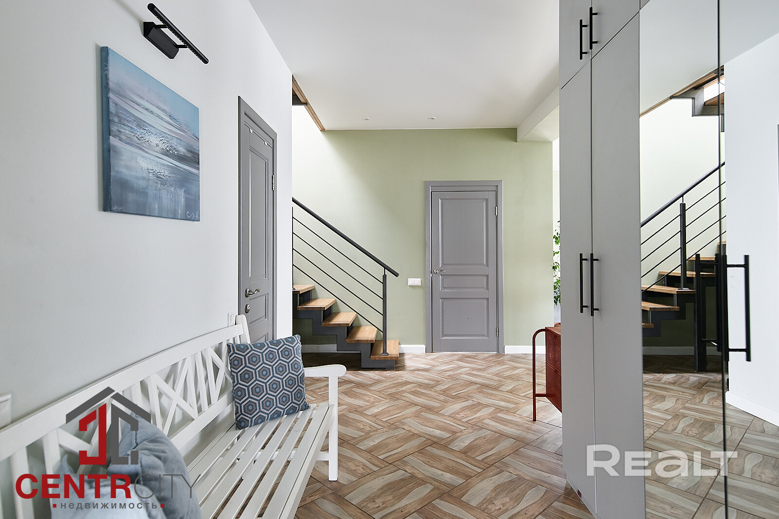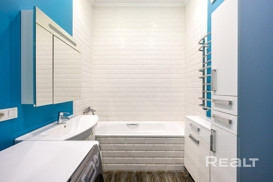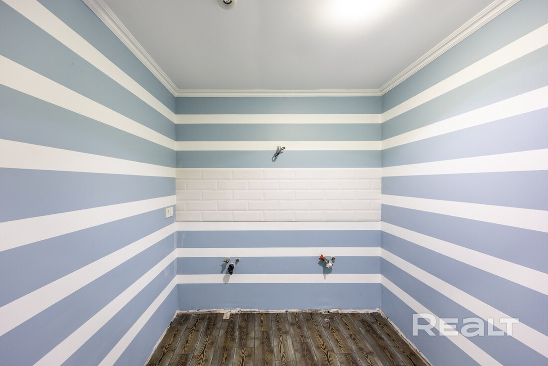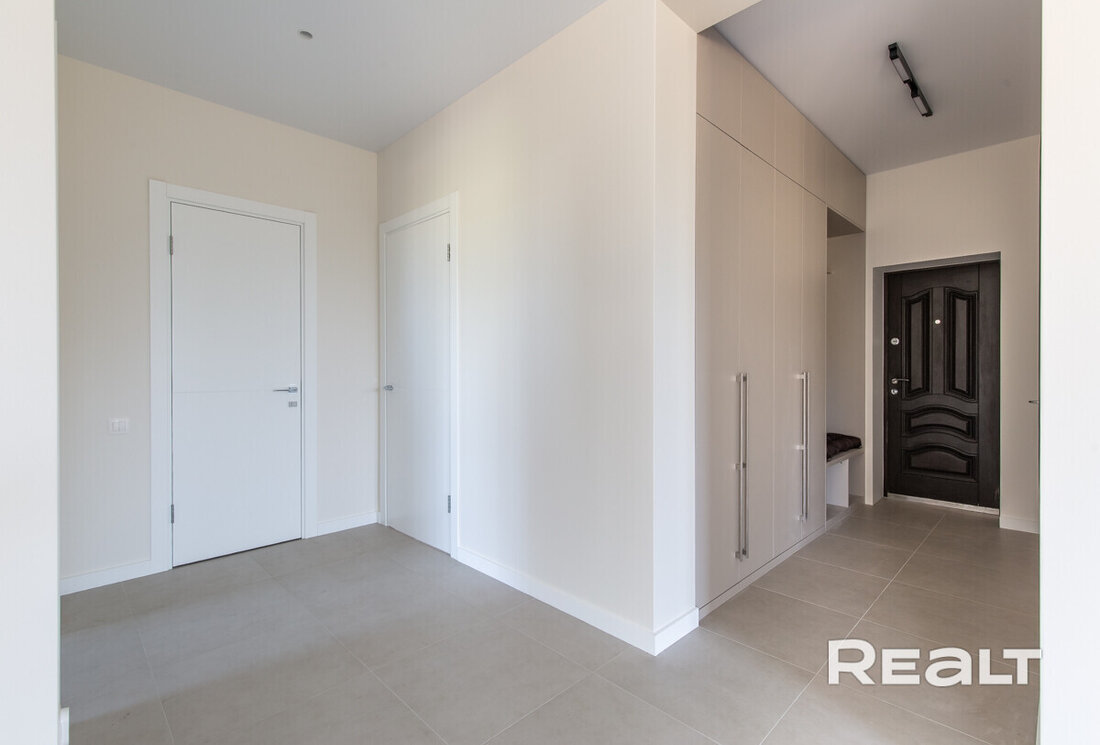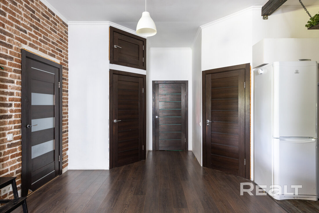 Интерьер выполнен в современном стиле с использованием премиальных материалов. Пол отделан керамогранитом из Испании и Италии, а в комнатах уложен ламинат Pergo премиальной серии, известный своей экологичностью. Стены с идеальной геометрией покрашены Caparol, в комнатах использованы обои. Двери — высокие, нестандартные, в эмали, с итальянской фурнитурой Oro&Oro. Освещение выполнено с использованием светильников Maytoni, Kinklight и Ikea. В ванной установлена сантехника ROCA и Grohe, мебель выполнена по индивидуальному заказу. Кухня Модуль укомплектована всей необходимой техникой Electrolux и Maunfeld, а также дубовым дорогим столом по индивидуальному заказу с комфортными стульями.