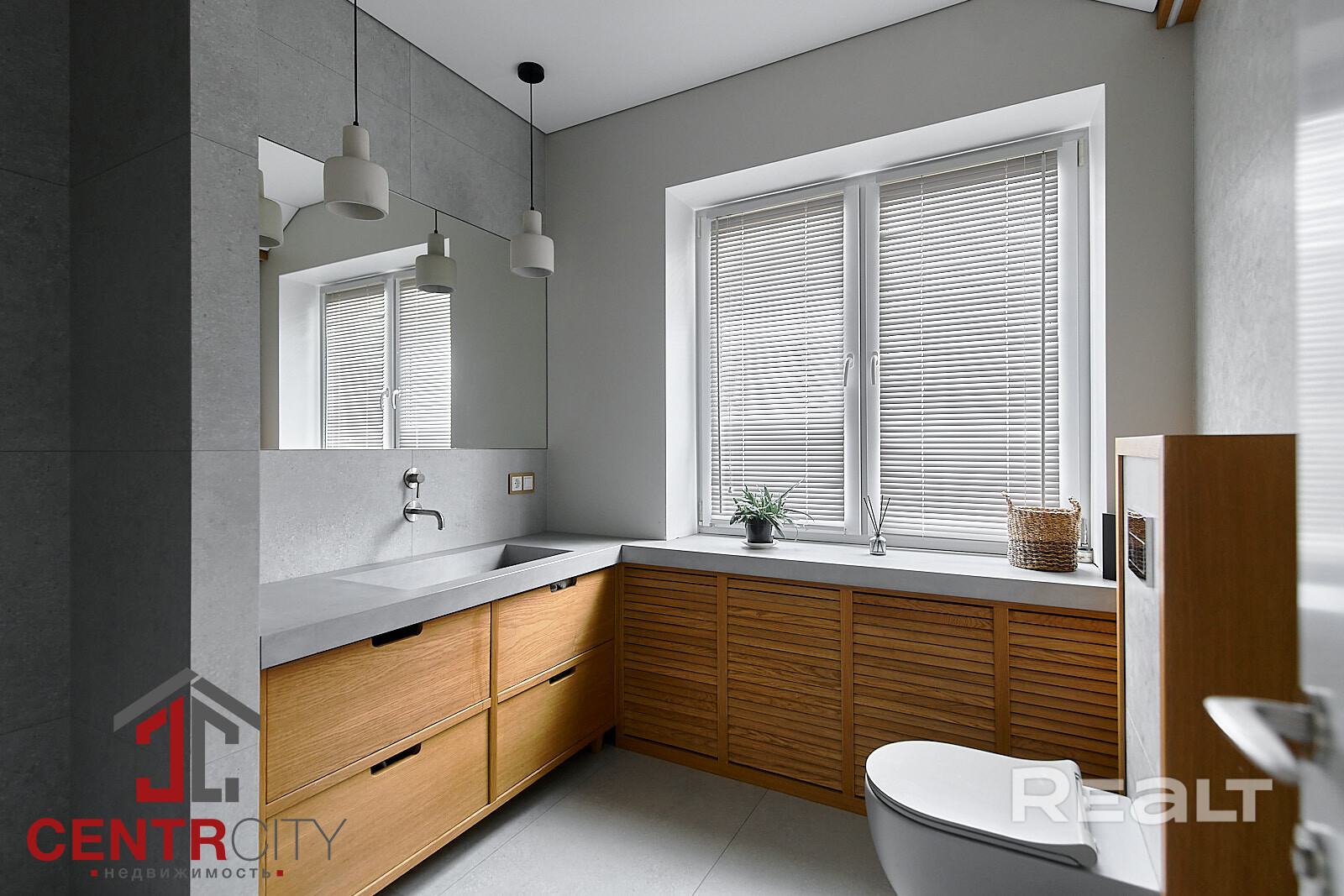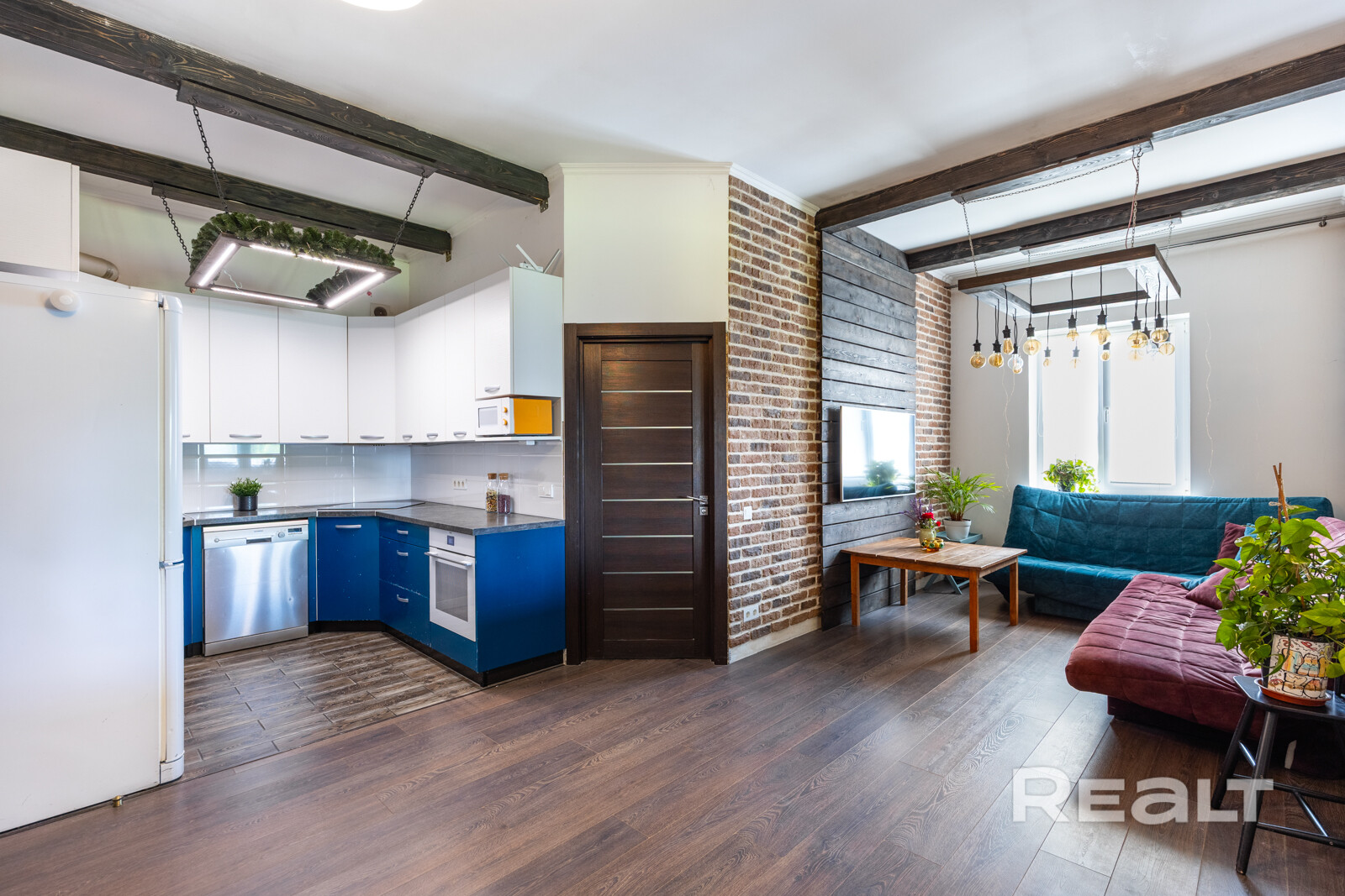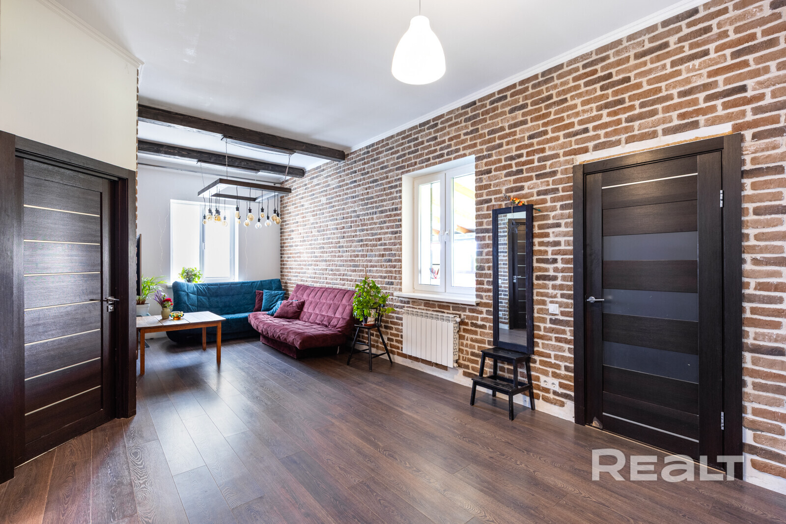 Интерьер выполнен в современном стиле с использованием премиальных материалов. Пол отделан керамогранитом из Испании и Италии, а в комнатах уложен ламинат Pergo премиальной серии, известный своей экологичностью. Стены с идеальной геометрией покрашены Caparol, в комнатах использованы обои. Двери — высокие, нестандартные, в эмали, с итальянской фурнитурой Oro&Oro. Освещение выполнено с использованием светильников Maytoni, Kinklight и Ikea. В ванной установлена сантехника ROCA и Grohe, мебель выполнена по индивидуальному заказу. Кухня Модуль укомплектована всей необходимой техникой Electrolux и Maunfeld, а также дубовым дорогим столом по индивидуальному заказу с комфортными стульями.