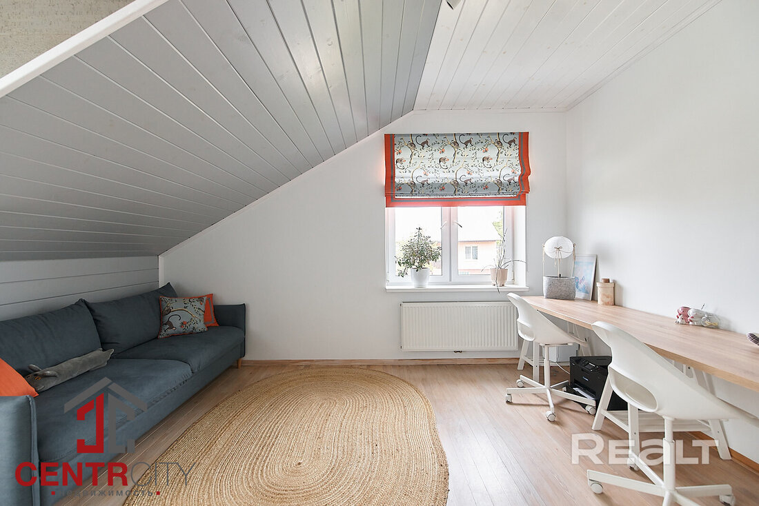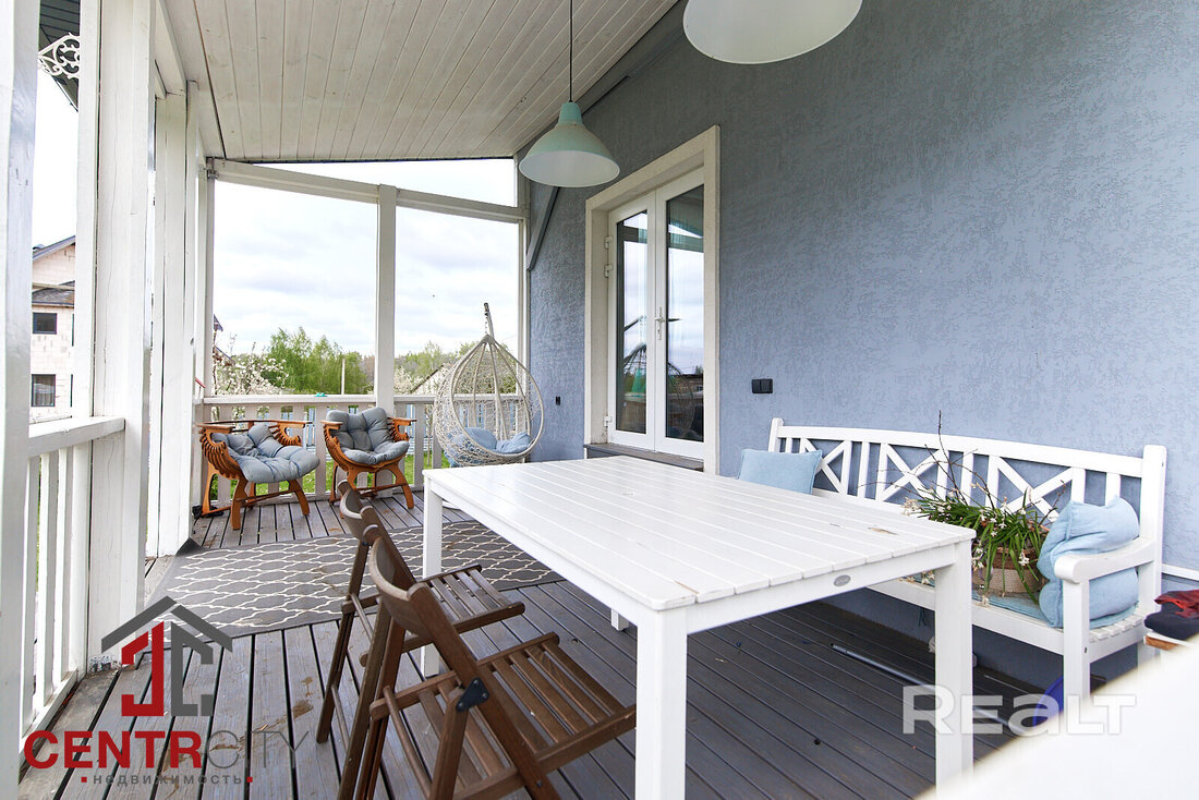 Общая площадь 128 м2. Планировка такая: две спальни, просторная гостиная с выходом на шикарную террасу из лиственницы, отдельная кухня, просторный санузел, прихожая с большим вместительным шкафом для хранения, котельная и чердак.