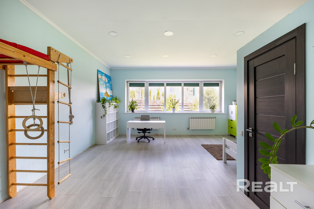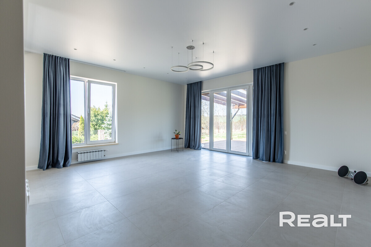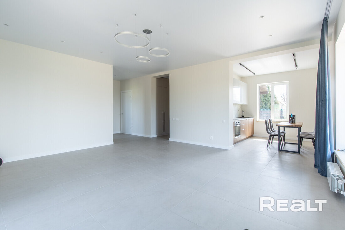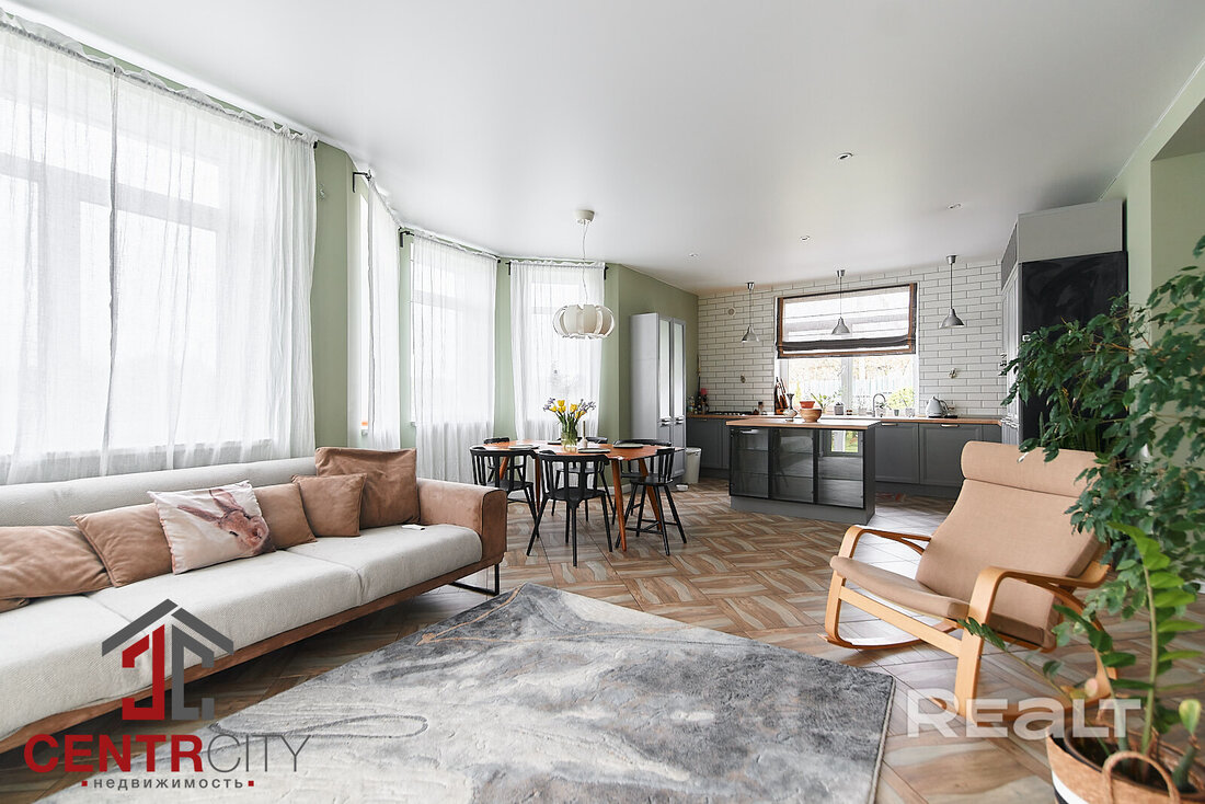 Общая площадь 173 м2. На первом этаже расположены кухня-гостиная со встроенной техникой (духовой шкаф, варочная панель, посудомоечная машина, холодильник) и функциональной мебелью, гостевая комната, санузел, просторная ванная, прихожая и терраса.