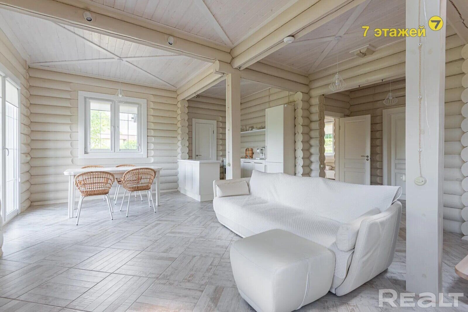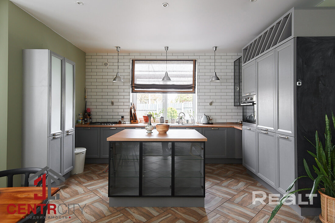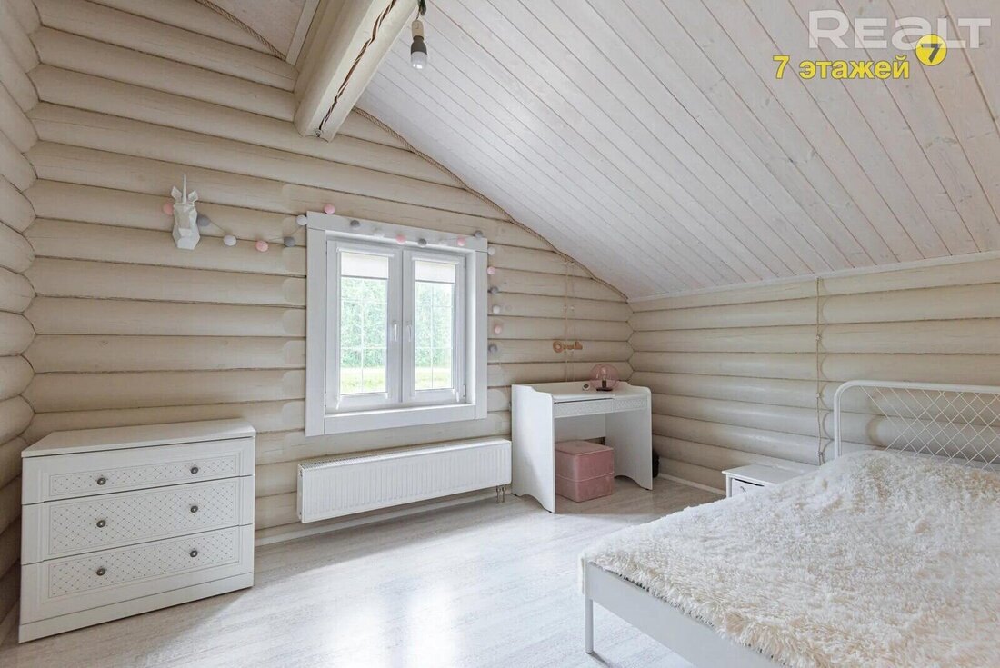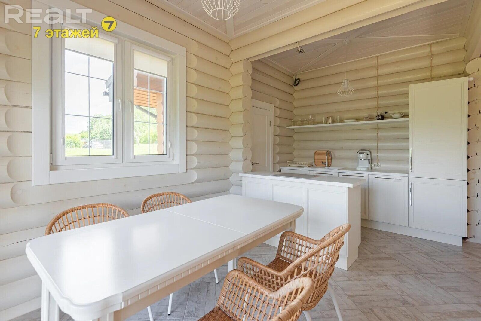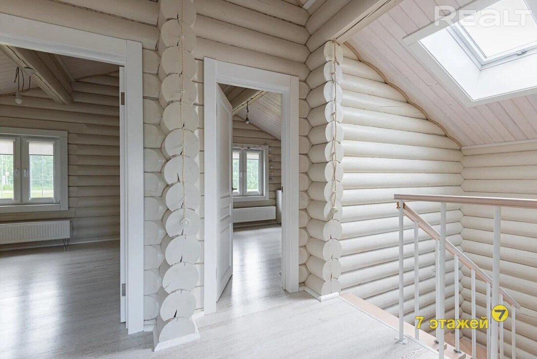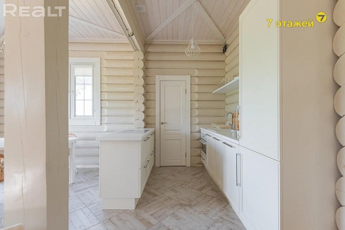 Деревянные стены покрашены, на полах итальянский керамогранит и паркетная доска. Кухня выполнена из массива с островом, оснащена импортной техникой и встроенным холодильником. Вся мебель и техника включены в стоимость.