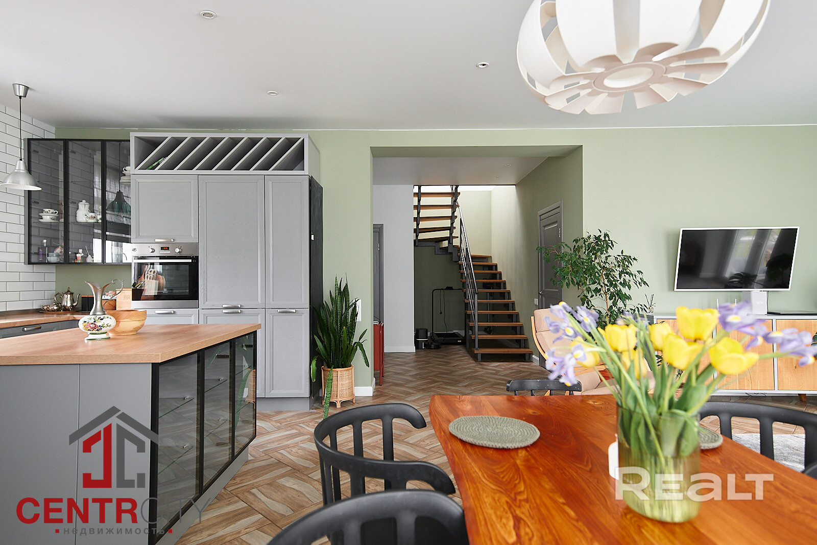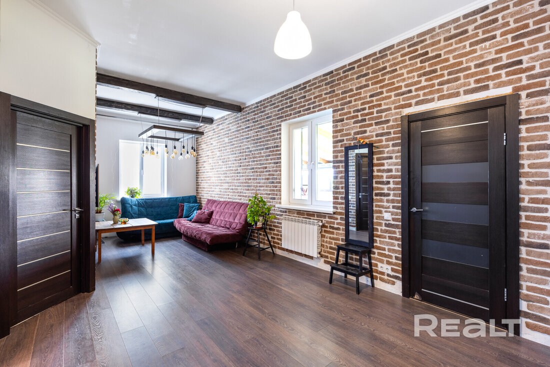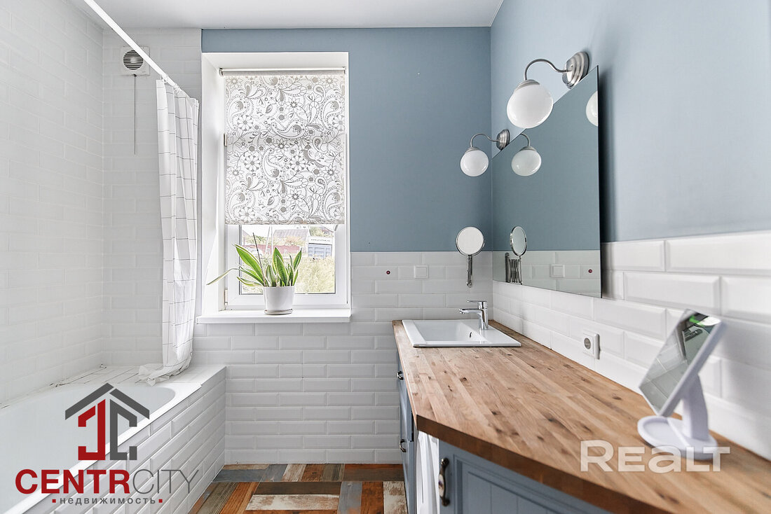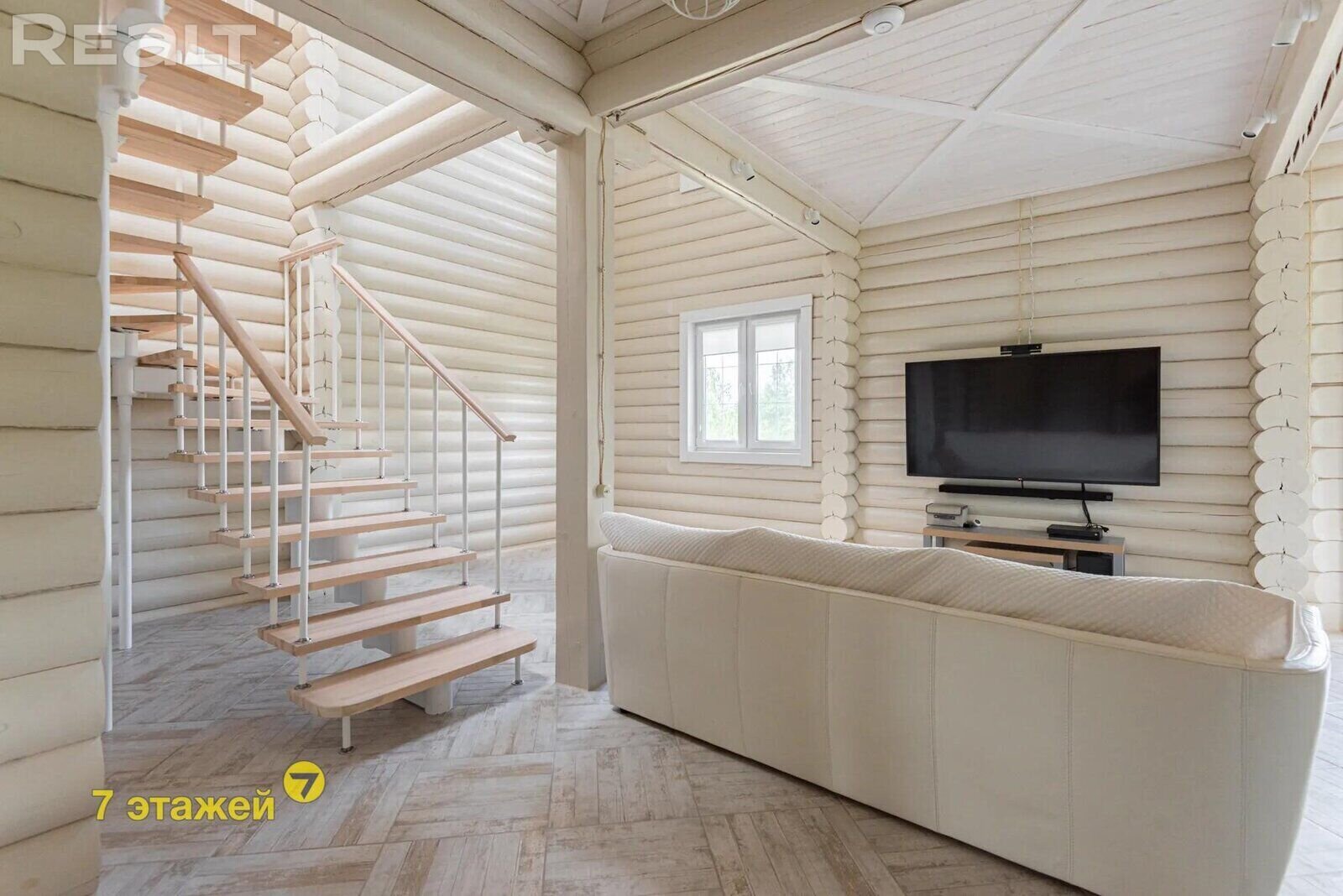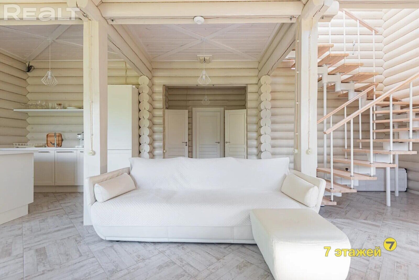 Деревянные стены покрашены, на полах итальянский керамогранит и паркетная доска. Кухня выполнена из массива с островом, оснащена импортной техникой и встроенным холодильником. Вся мебель и техника включены в стоимость.
