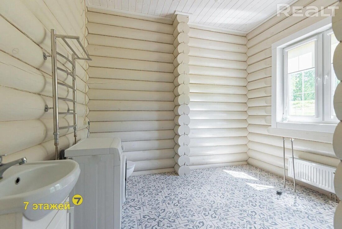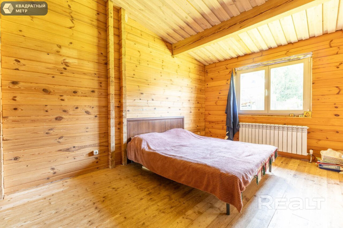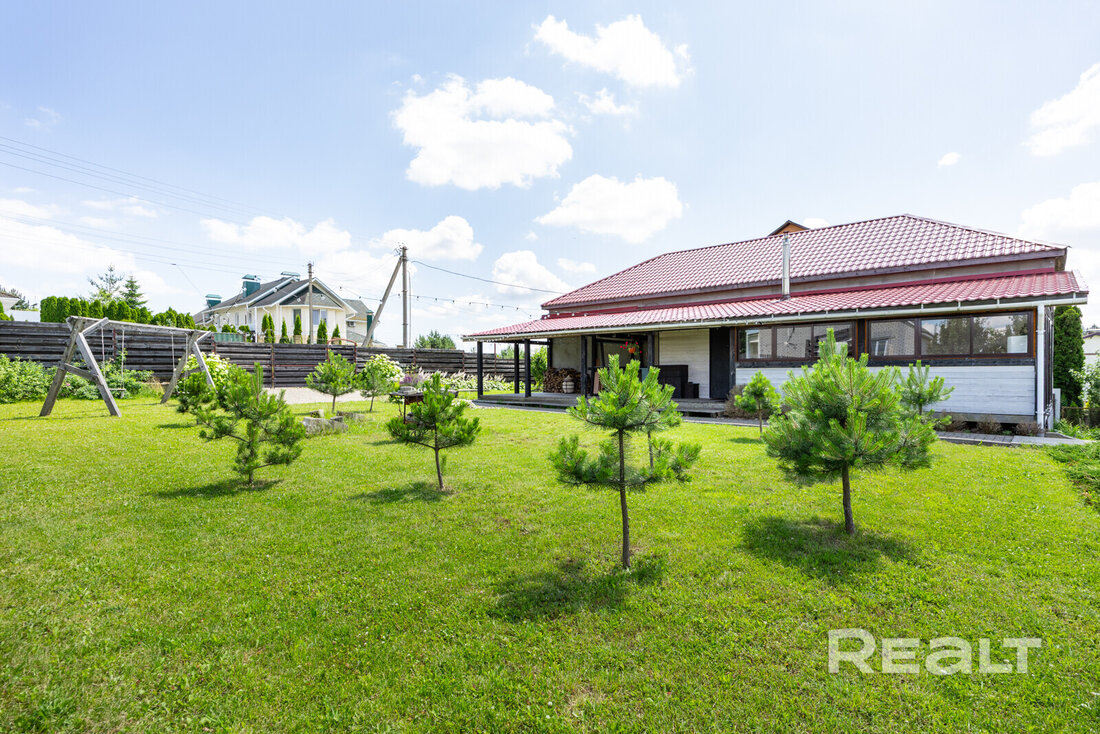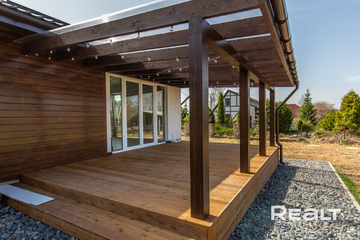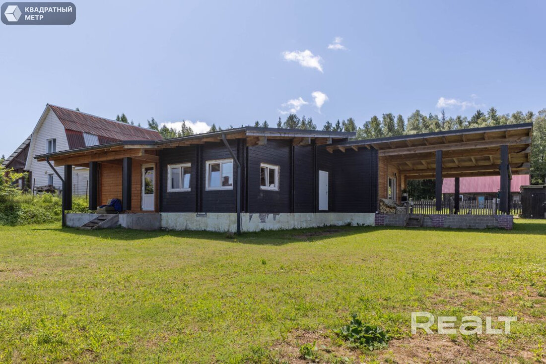 Дом здесь деревянный (двойной утепленный брус), одноуровневый, построен по индивидуальному проекту в 2019 году. На крыше фальцевая кровля, окна (стеклопакеты) и двери выполнены из дерева (лиственница).