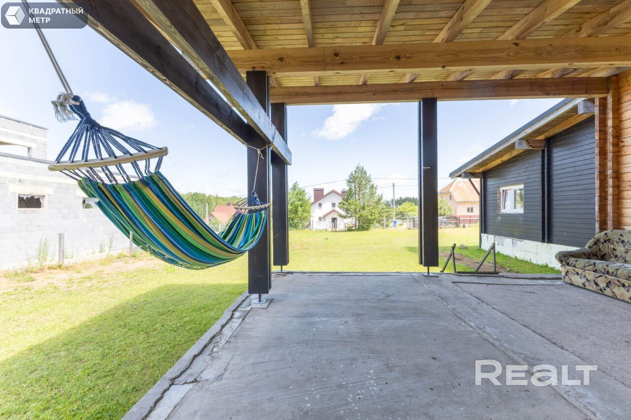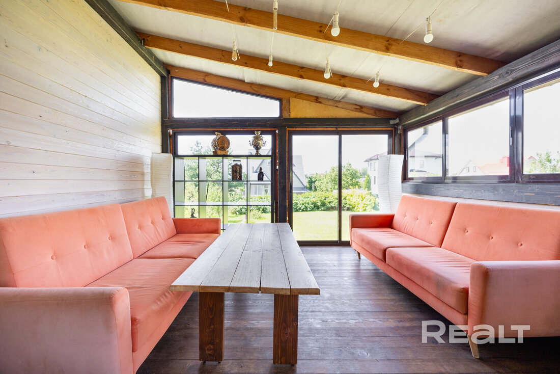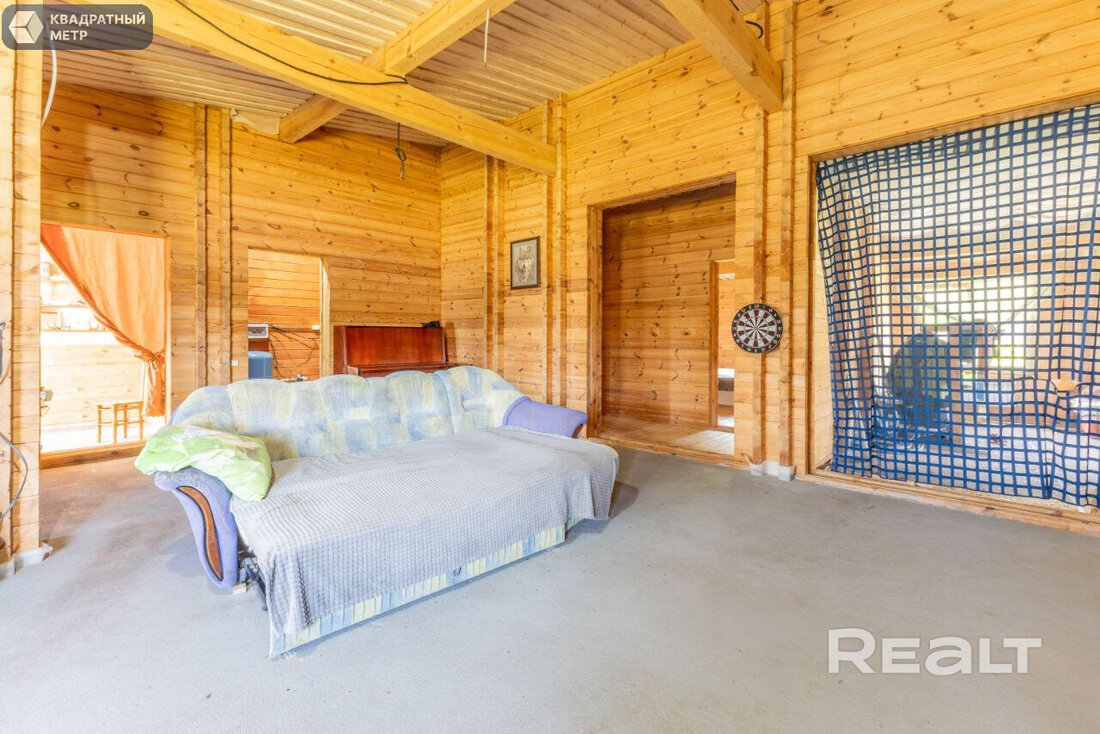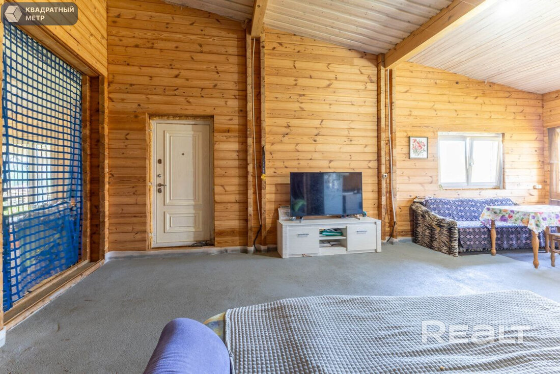 Дом здесь деревянный (двойной утепленный брус), одноуровневый, построен по индивидуальному проекту в 2019 году. На крыше фальцевая кровля, окна (стеклопакеты) и двери выполнены из дерева (лиственница).