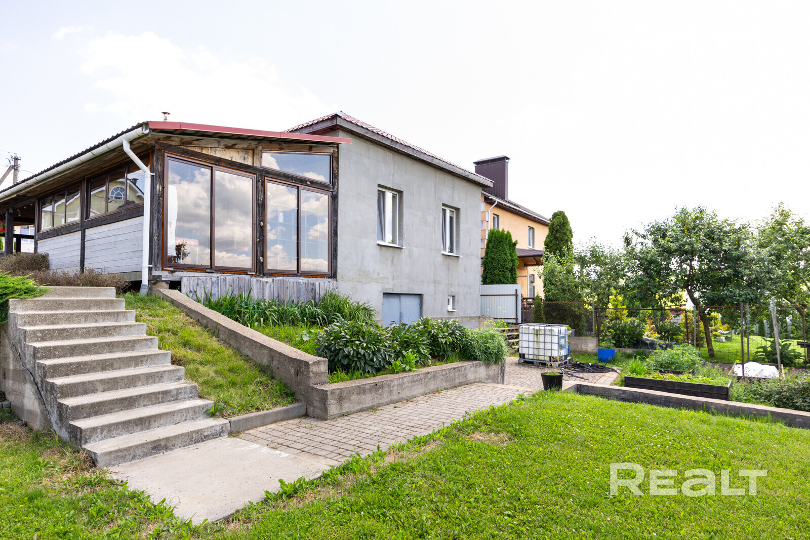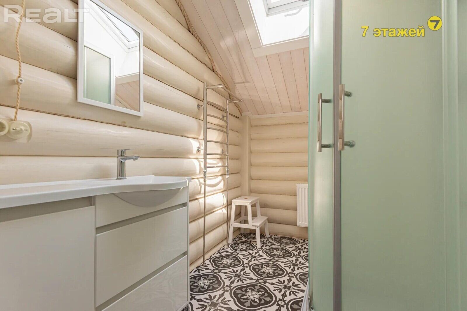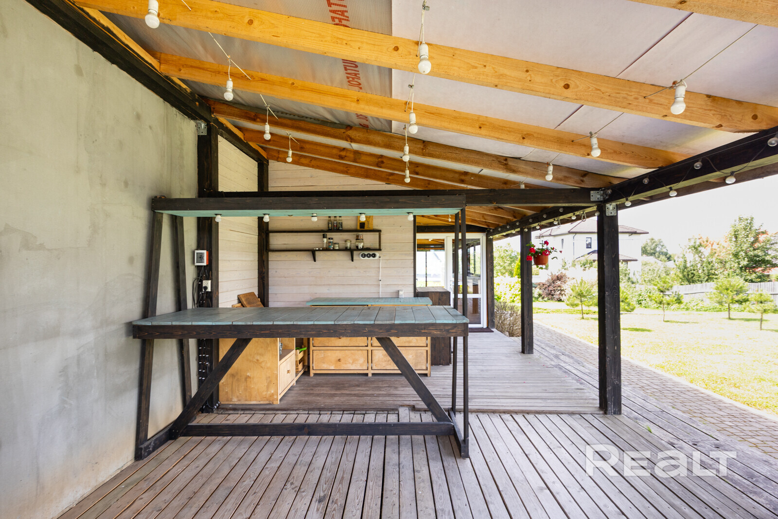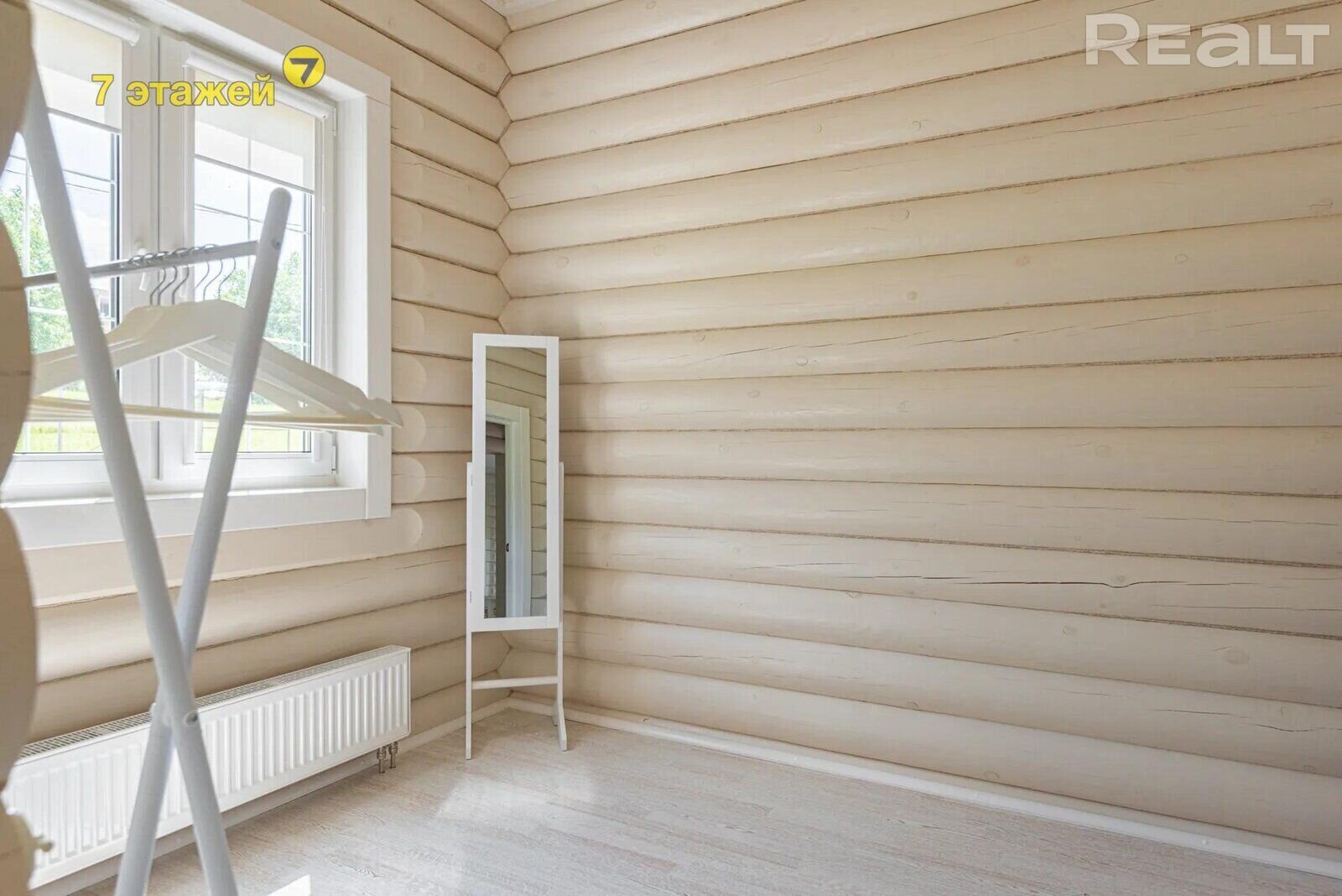 Дом здесь деревянный (двойной утепленный брус), одноуровневый, построен по индивидуальному проекту в 2019 году. На крыше фальцевая кровля, окна (стеклопакеты) и двери выполнены из дерева (лиственница).