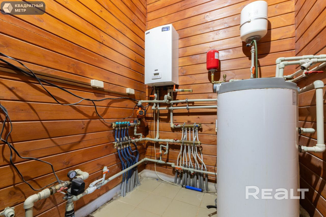 Отопление – конденсационный немецкий котел Buderus с погодозависимой автоматикой, с двумя источниками бесперебойного питания. Установлены датчики влажности/температуры и дымозадымления в каждой комнате. Водоснабжение из скважины, канализация местная (2 колодца), подведено оптоволокно. Для безопасности и удобства установлена система видеонаблюдения по периметру (7 камер) и работает система "Умный дом" с управлением с телефона.