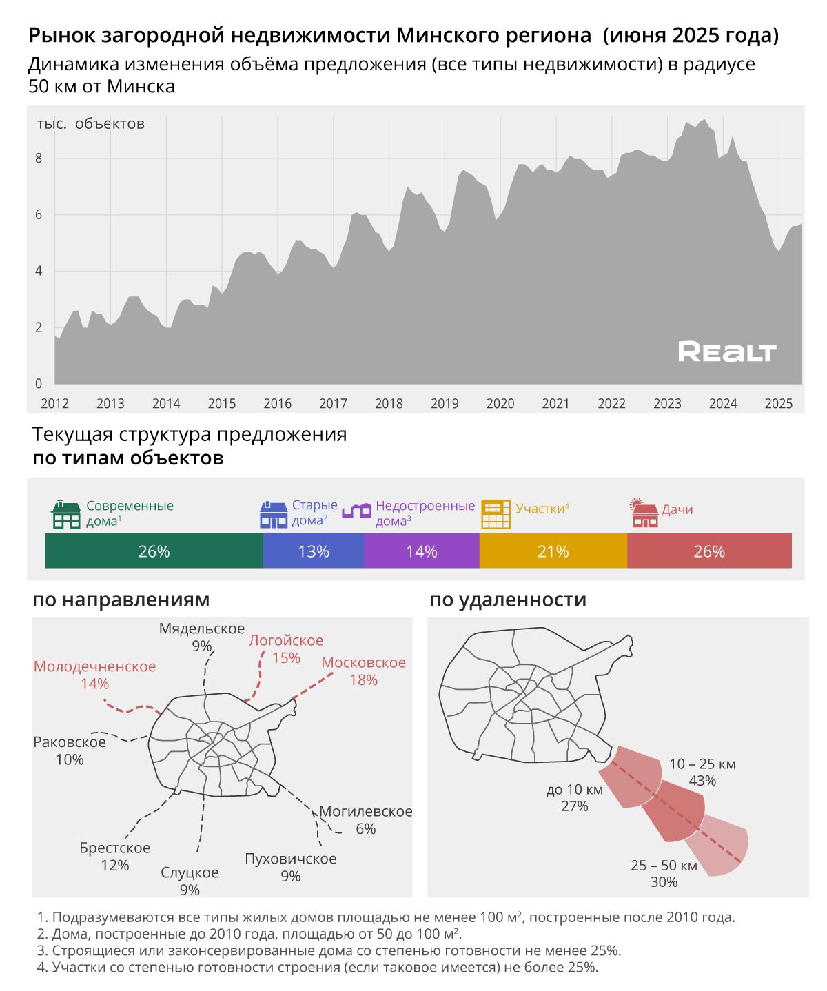 Среди направлений рост предложения наблюдался на Могилевском и Логойском направлениях — плюс 4.2% и 3.4% соответственно. При этом наибольшее падение было зафиксировано на Молодечненском — минус 4.3%.