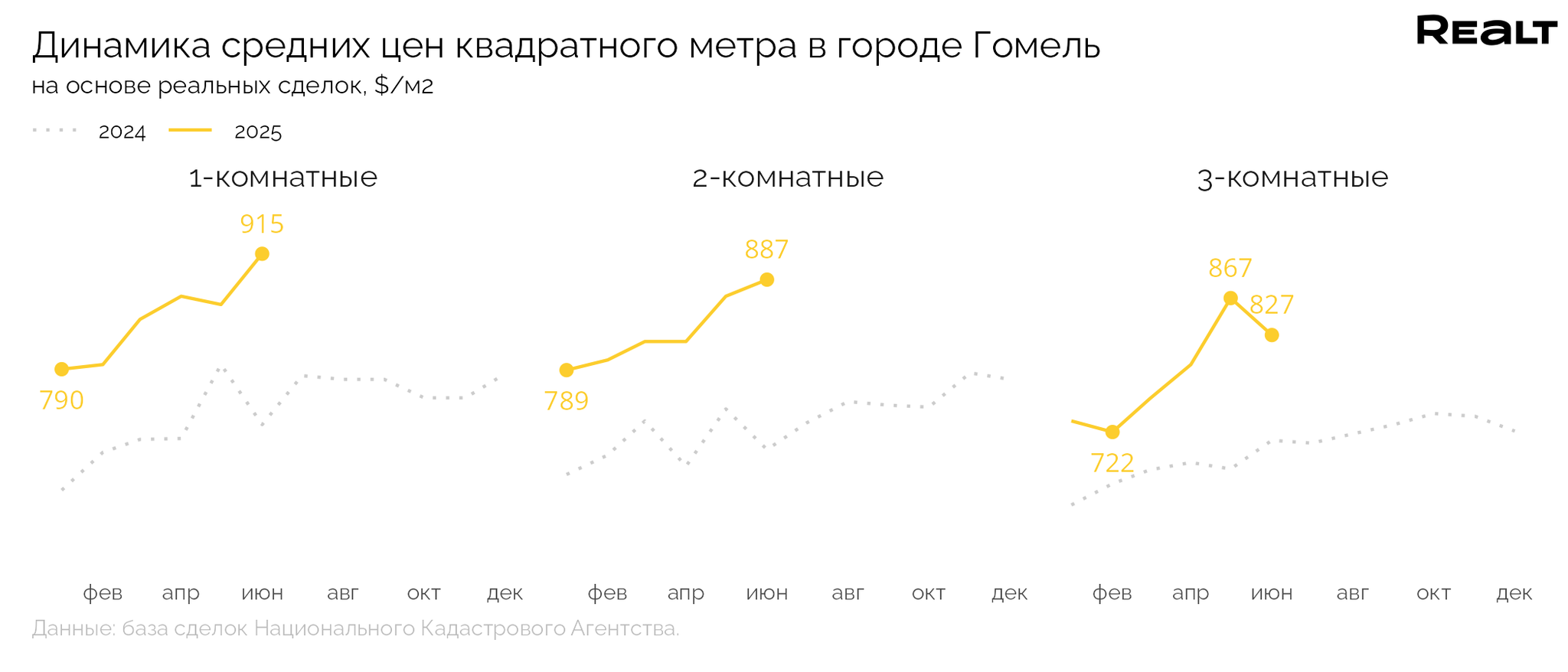 По данным сделок средняя цена квадратного метра 1-комнатных квартир, которые на данный момент продаются в среднем по 915 $/м2, увеличилась на 6.4%. Средняя стоимость 2-комнатных квартир в Гомеле составляет 887 $/м2 (+2.1% за месяц). 3-комнатные квартиры продавали в среднем за 827 $/м2 (-4.6% за месяц).