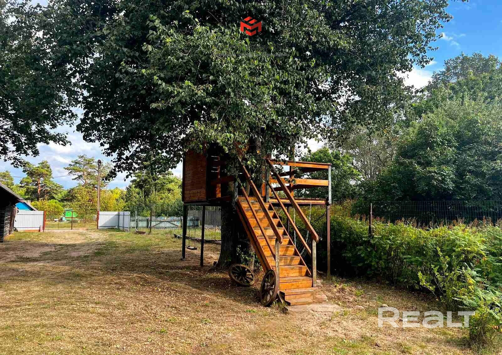 К дому прилагается участок 25 соток с плодовыми деревьями, ягодными кустами и прудом.