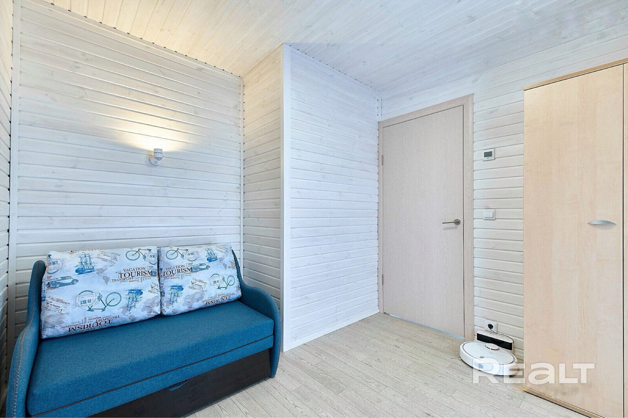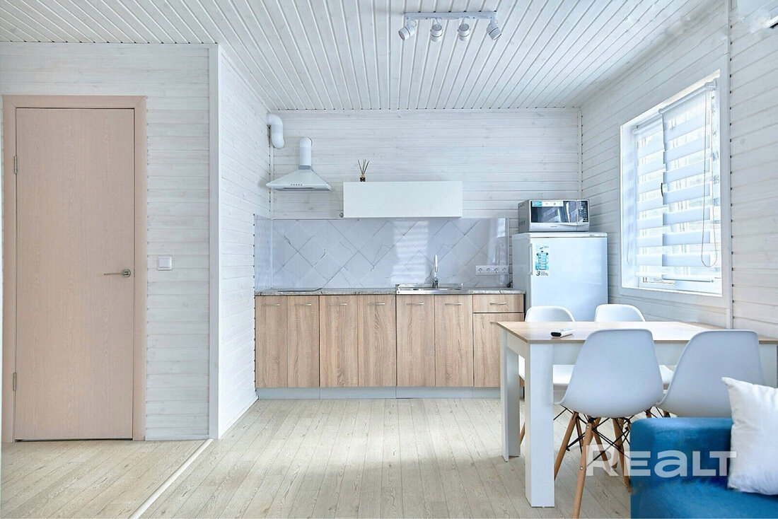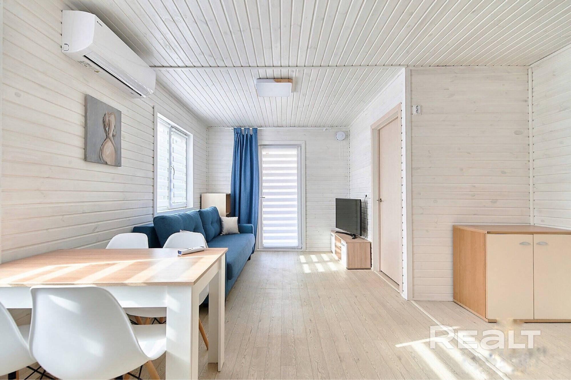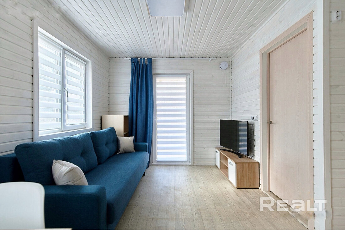 Общая площадь дачи составляет 51 квадратный метр. Дом состоит из кухни-гостиной и одной жилой комнаты. Затевать ремонт и перевозить мебель новым жильцам не придется. Тут уже есть диваны, обеденный стол со стульями, телевизор и кухня с плитой, вытяжкой, холодильником и микроволновкой.