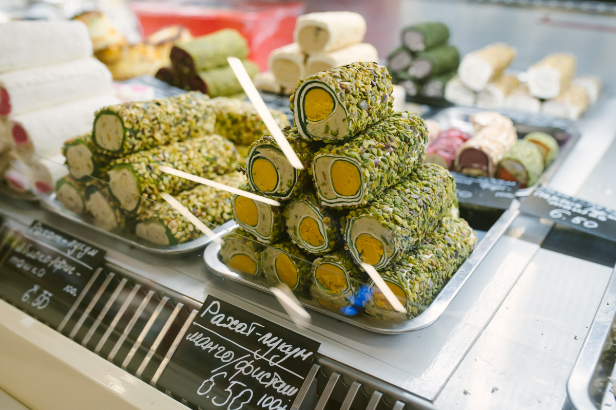 Надо бы не забыть о десерте. На рынке продается халва из Азова, которую издали можно принять за дорогой шоколад. Хороший чай без сахара позволит раскрыть ее вкус, главное не спешить и наслаждаться каждым кусочком.