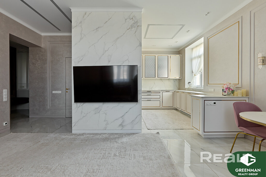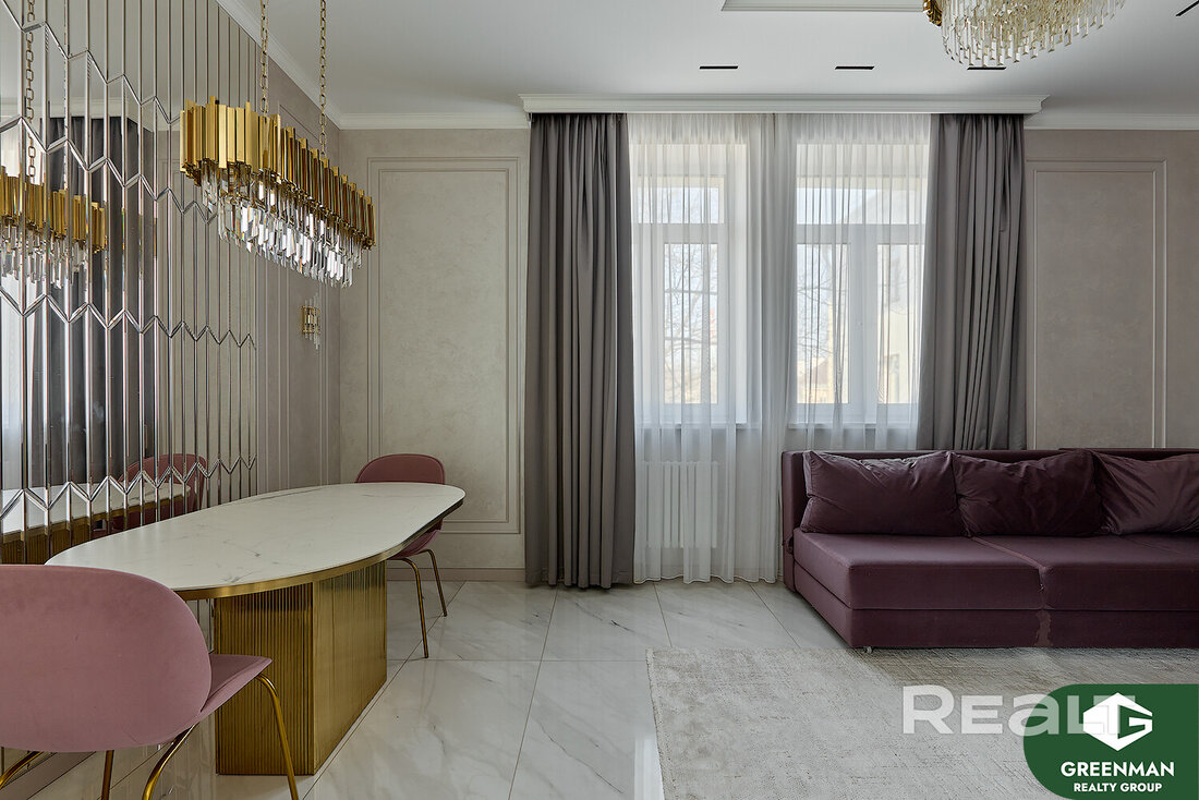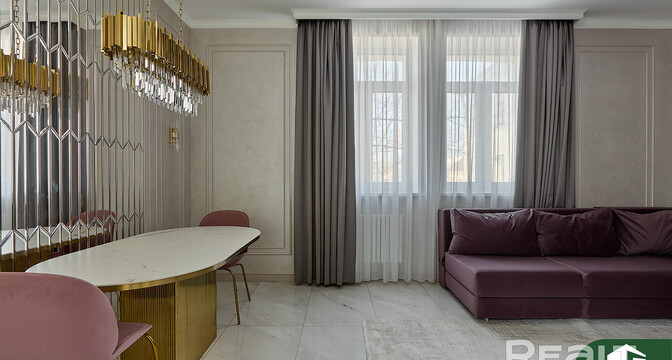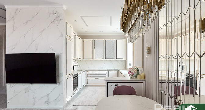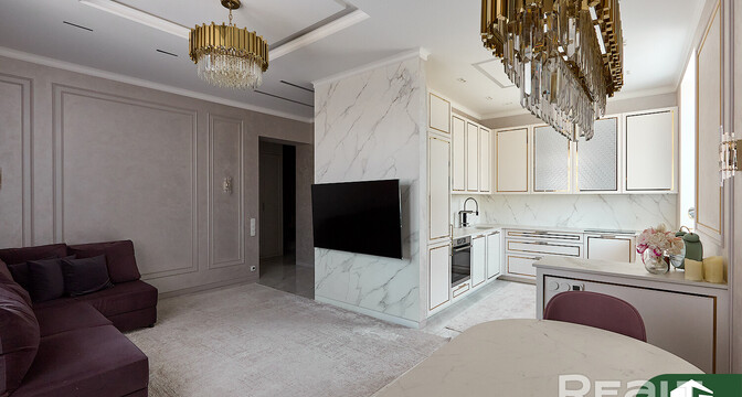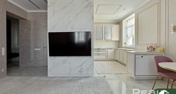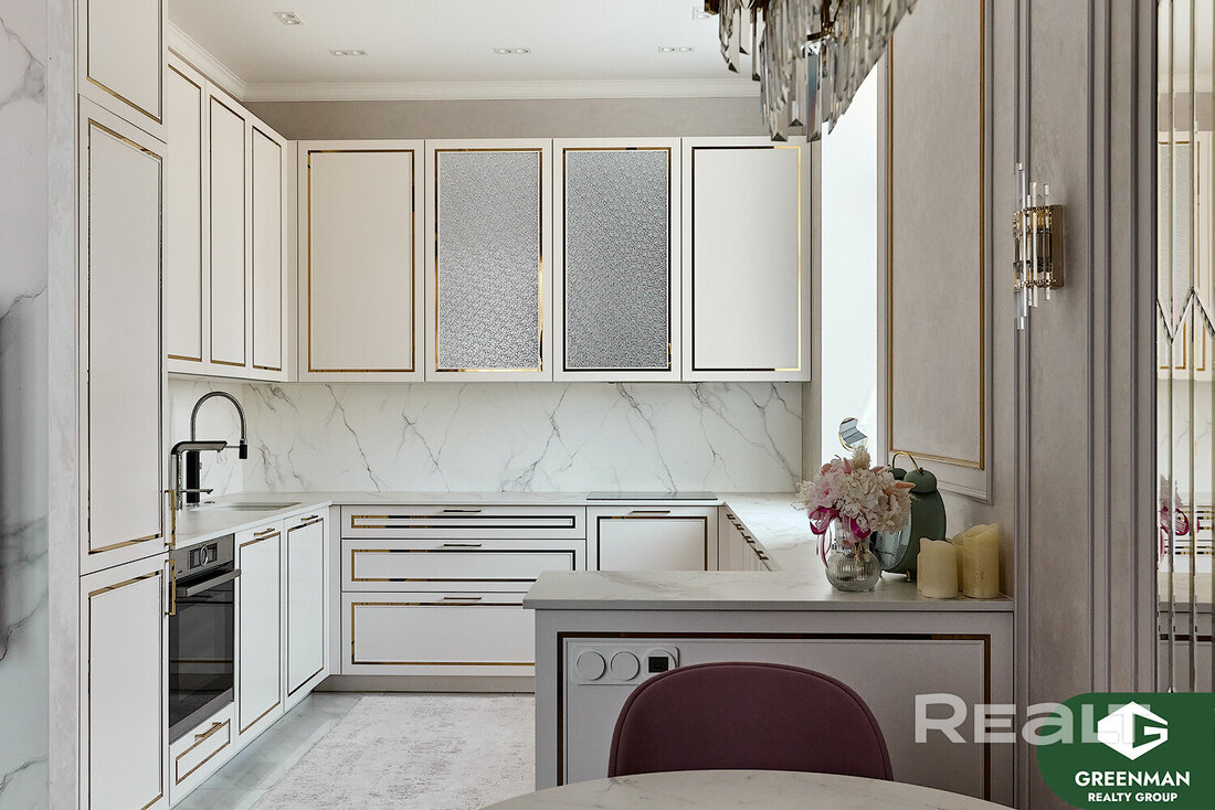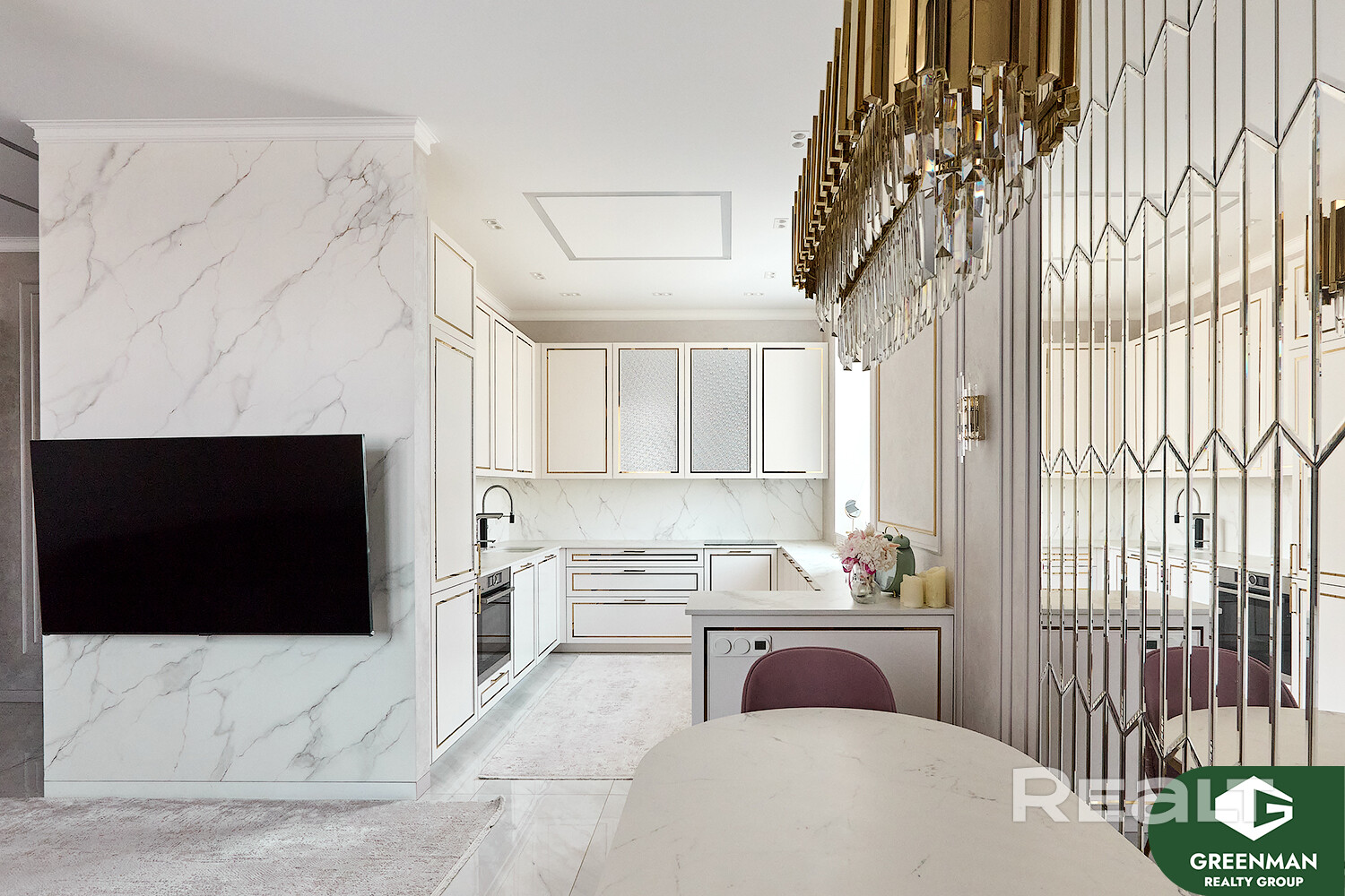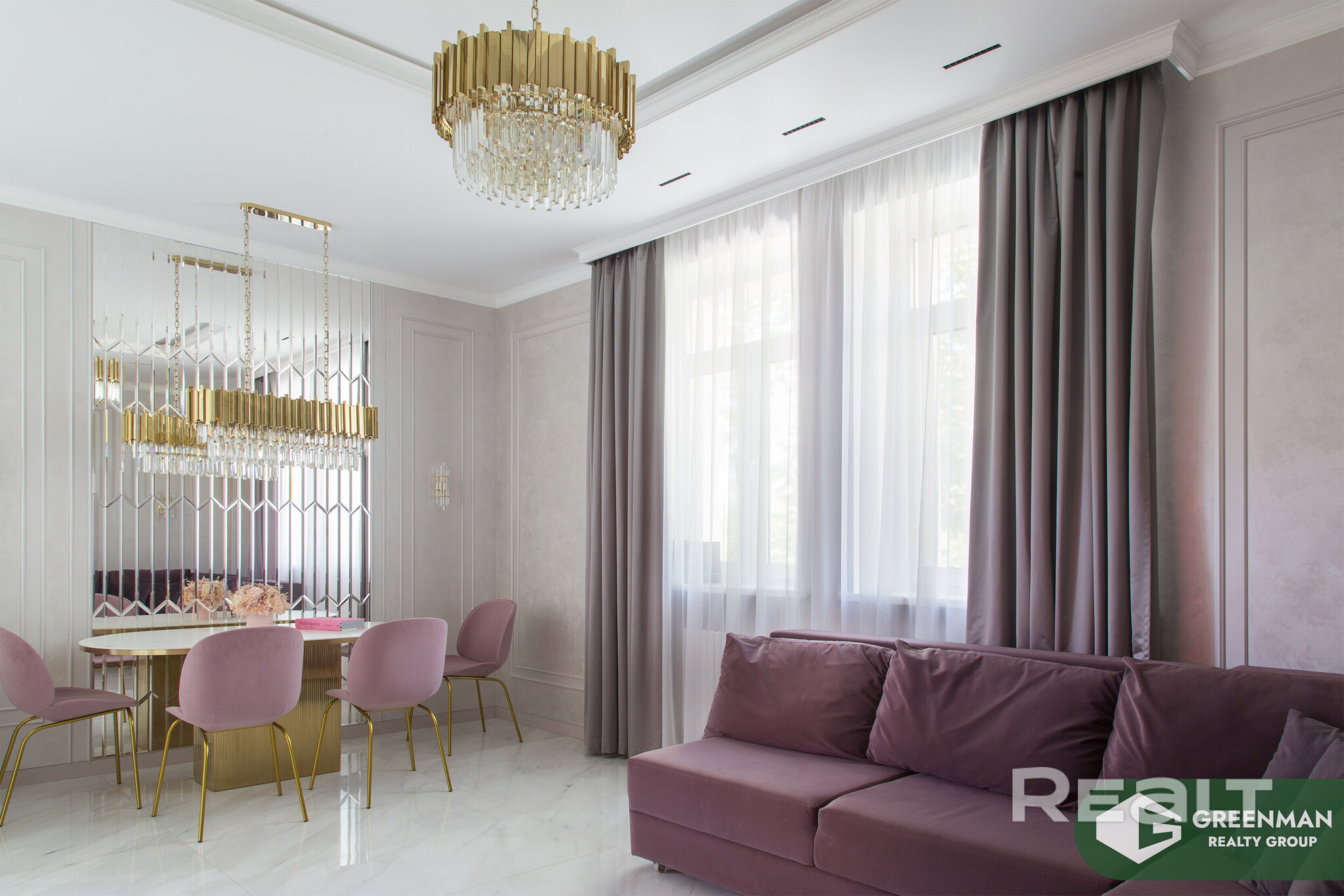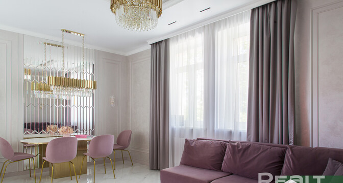 Кухня-гостиная получилась светлой. Эту зону украшают мебель и декоров в розовом оттенке, золоте. Кухня идет с каменной столешницей, есть встроенная бытовая техника премиальных брендов, системой смягчения и фильтрации воды, а также бойлер.