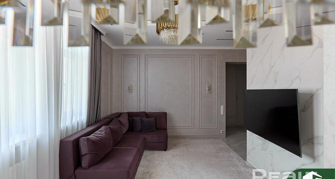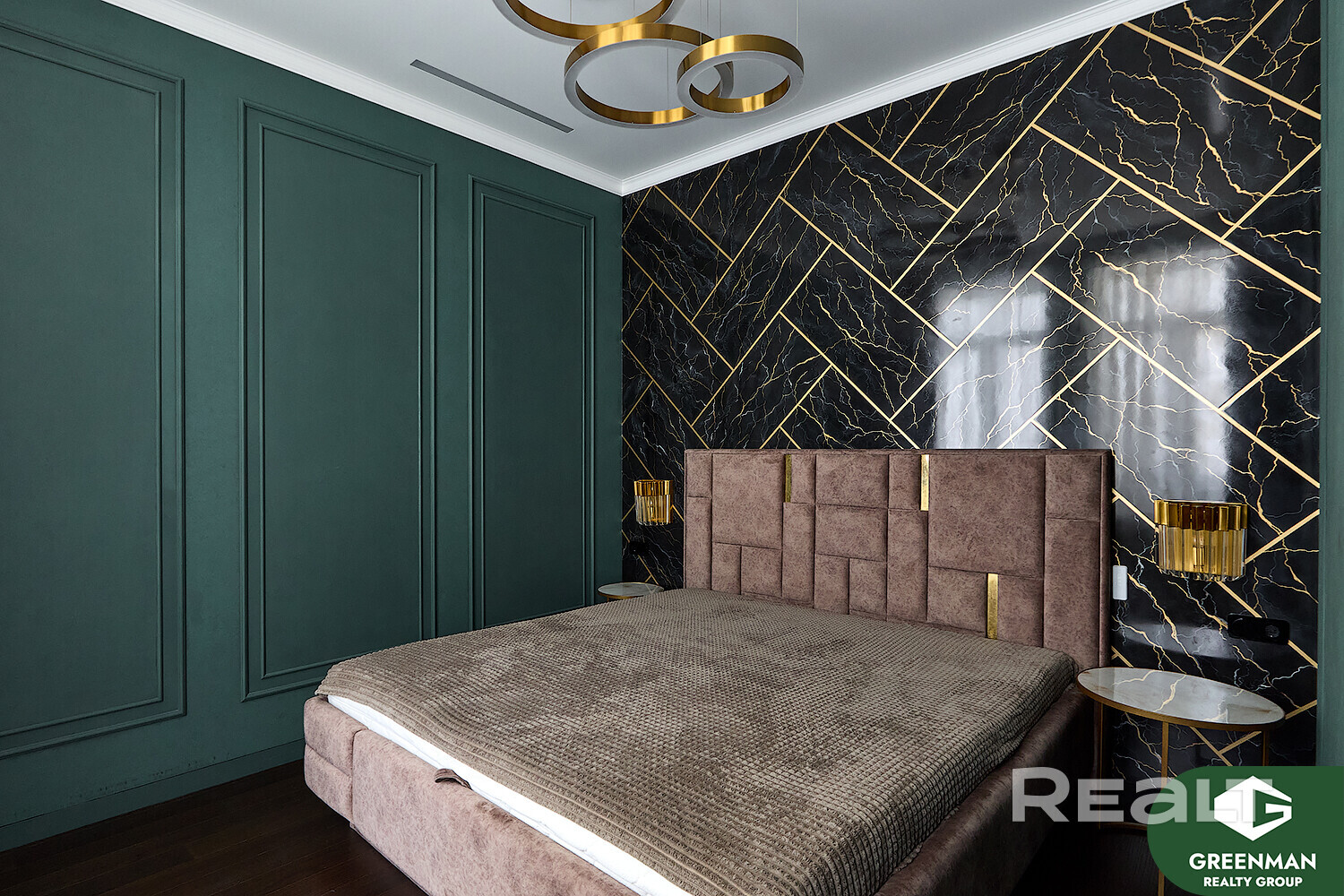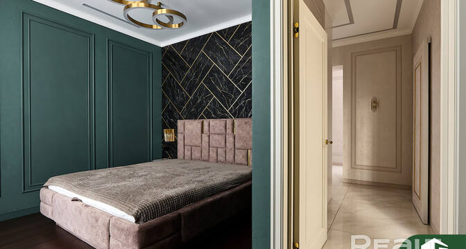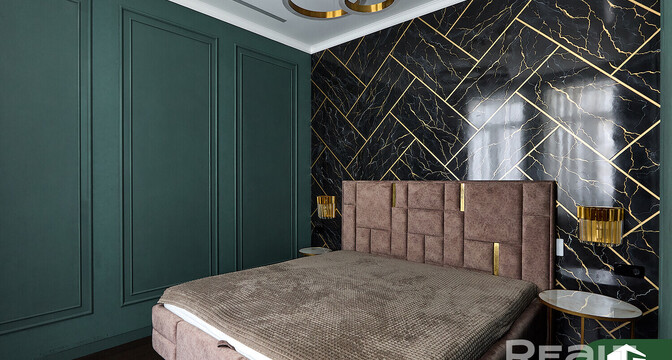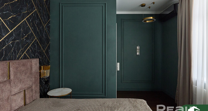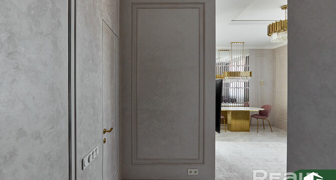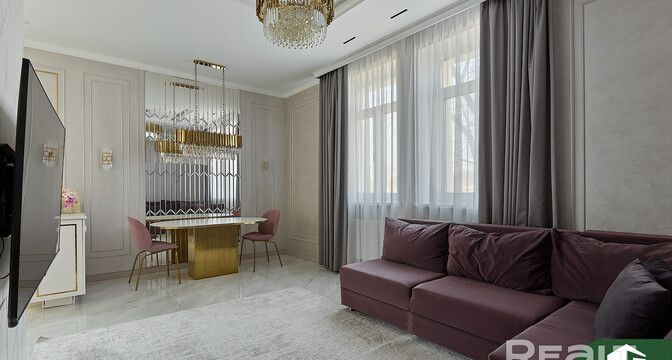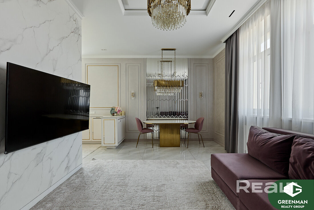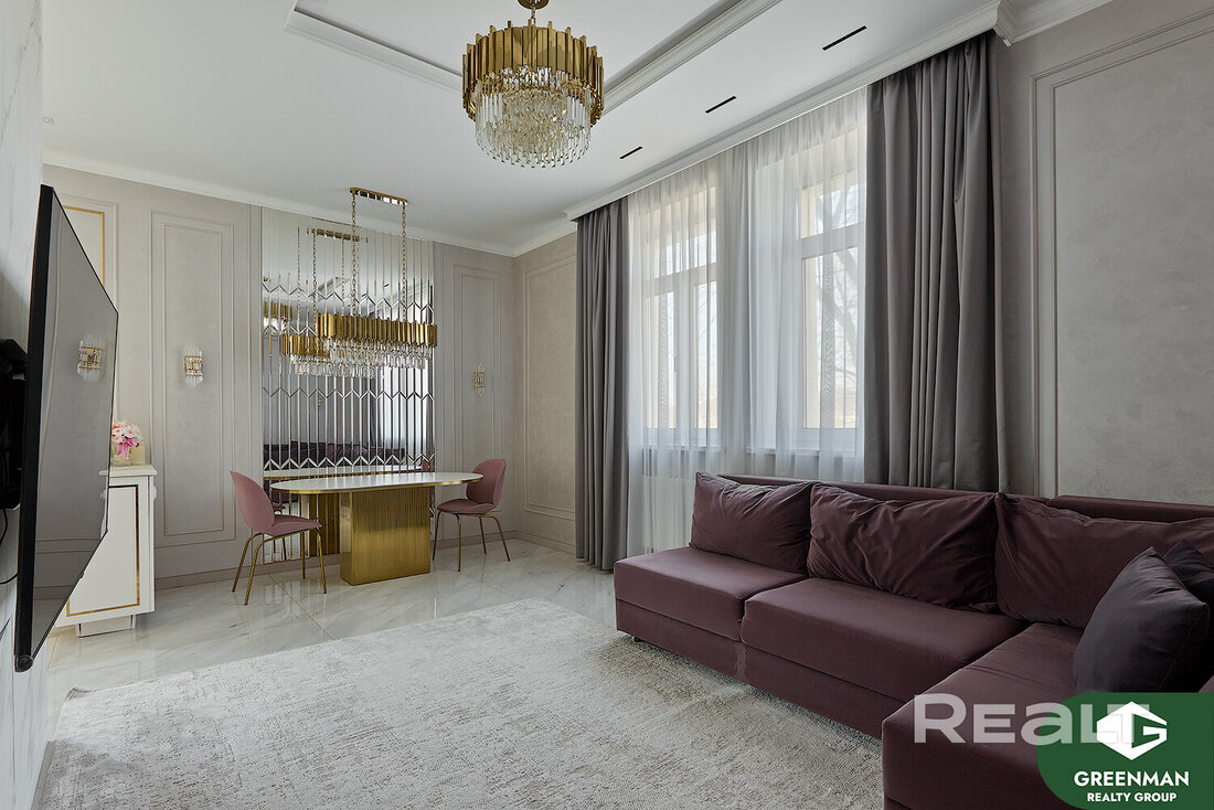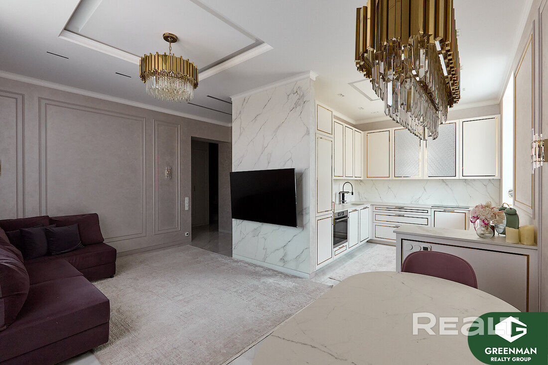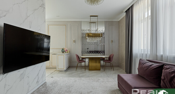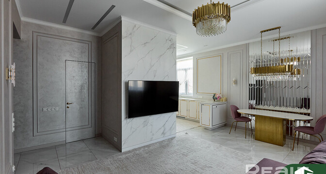Кухня-гостиная получилась светлой. Эту зону украшают мебель и декоров в розовом оттенке, золоте. Кухня идет с каменной столешницей, есть встроенная бытовая техника премиальных брендов, системой смягчения и фильтрации воды, а также бойлер.
