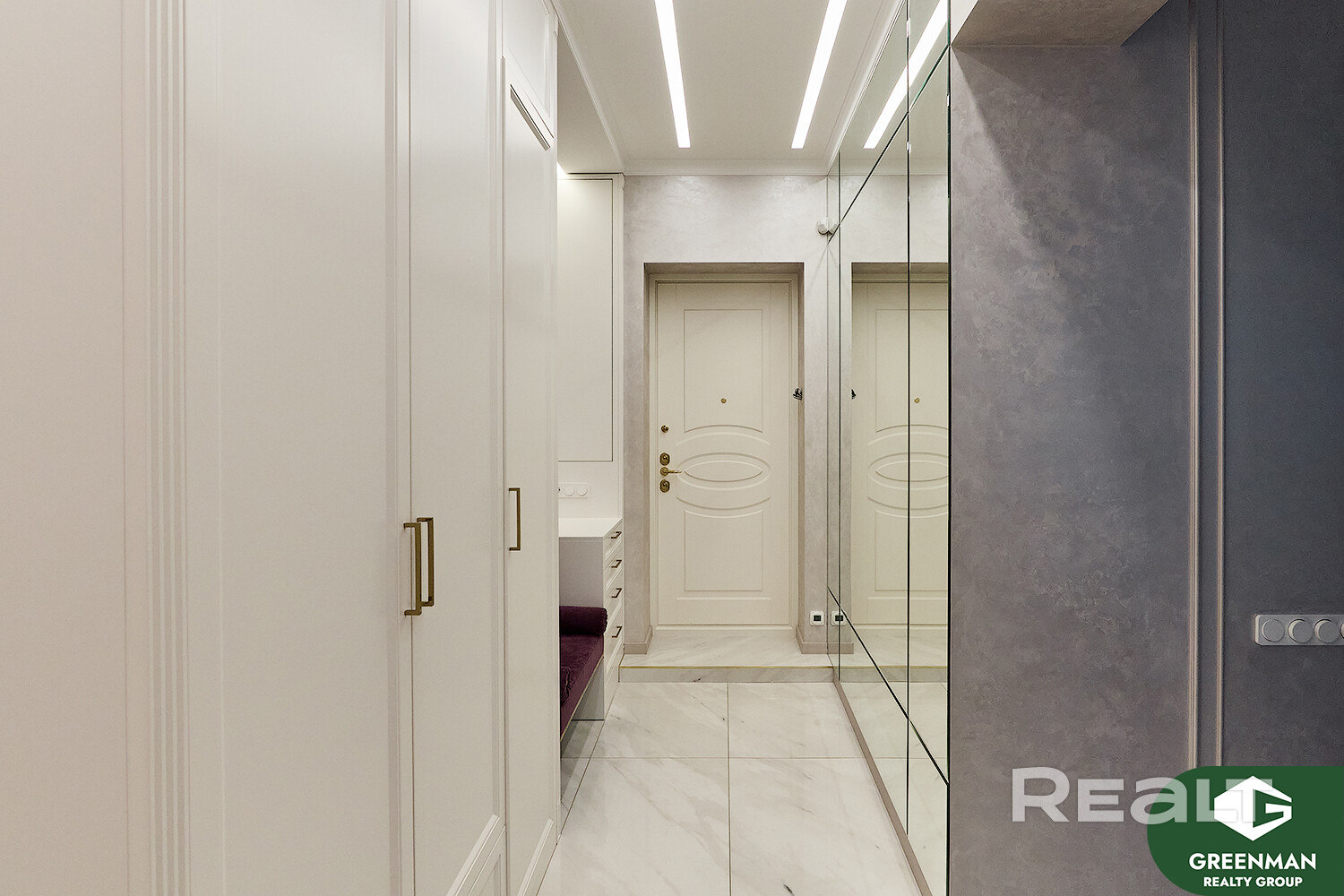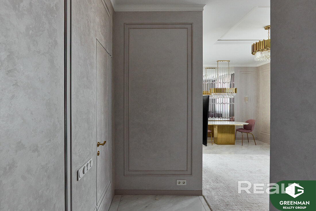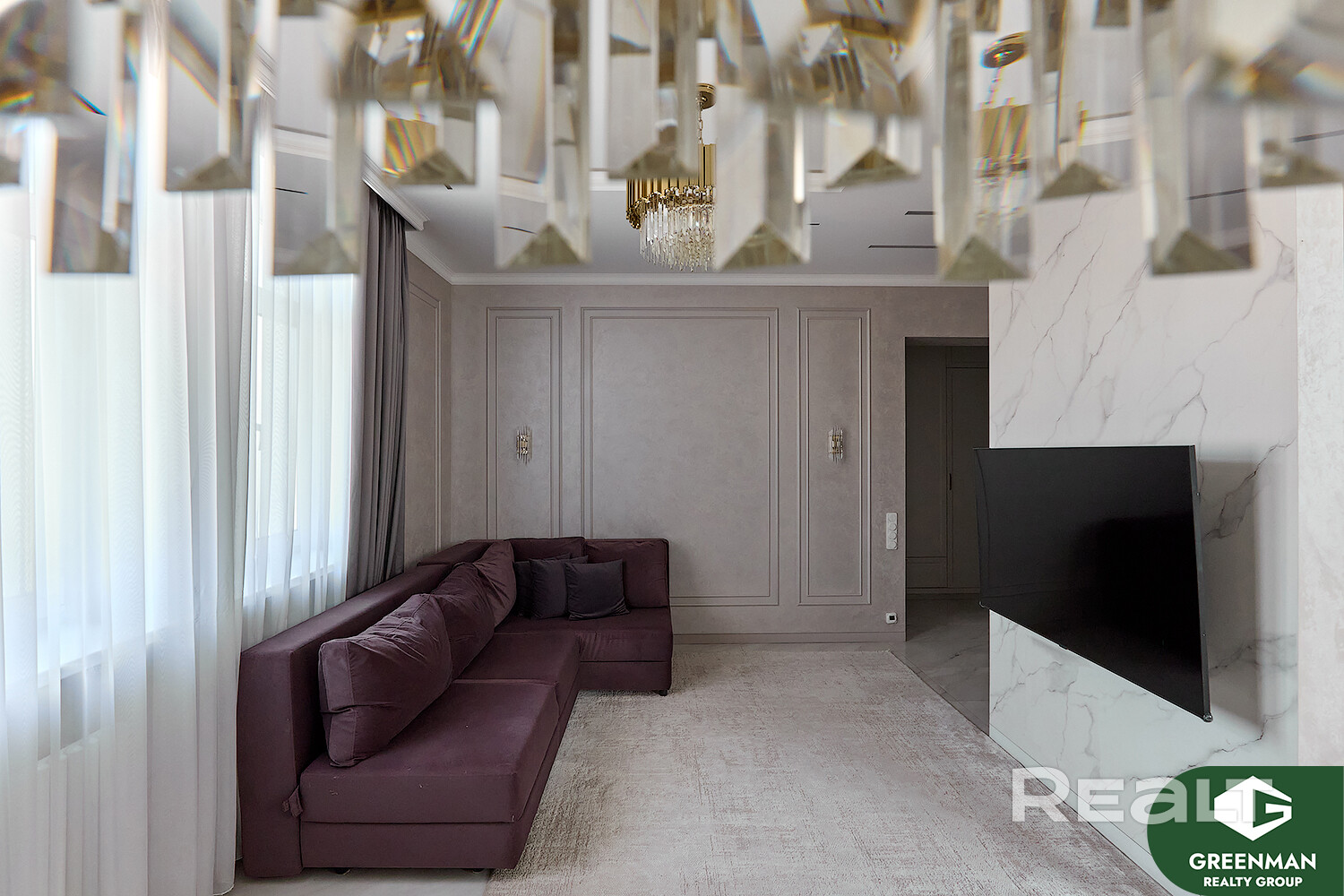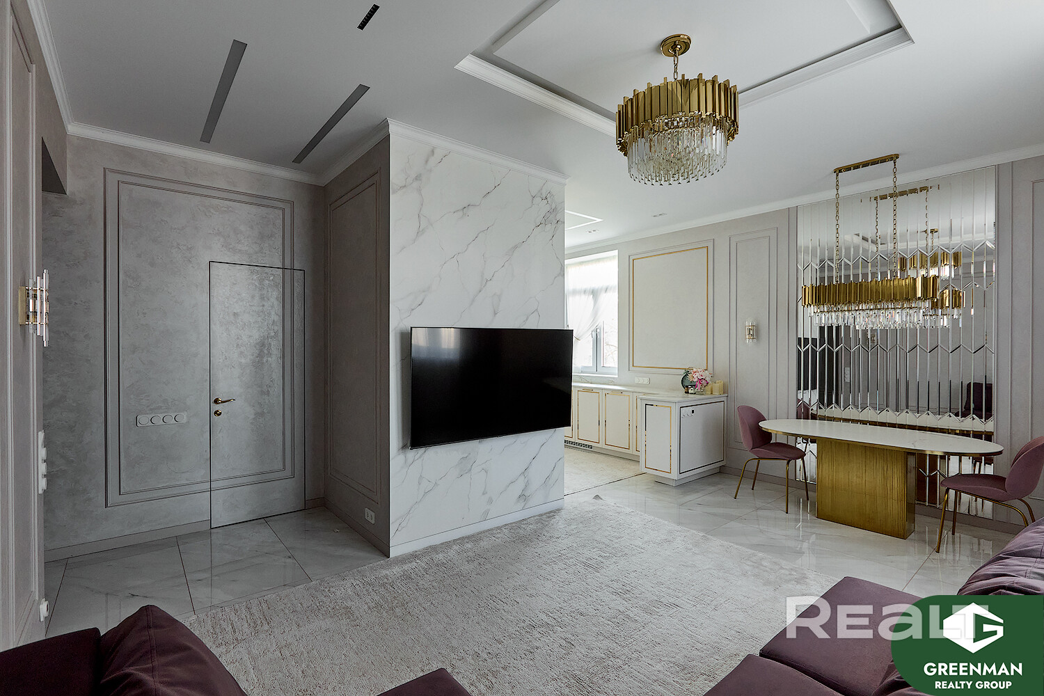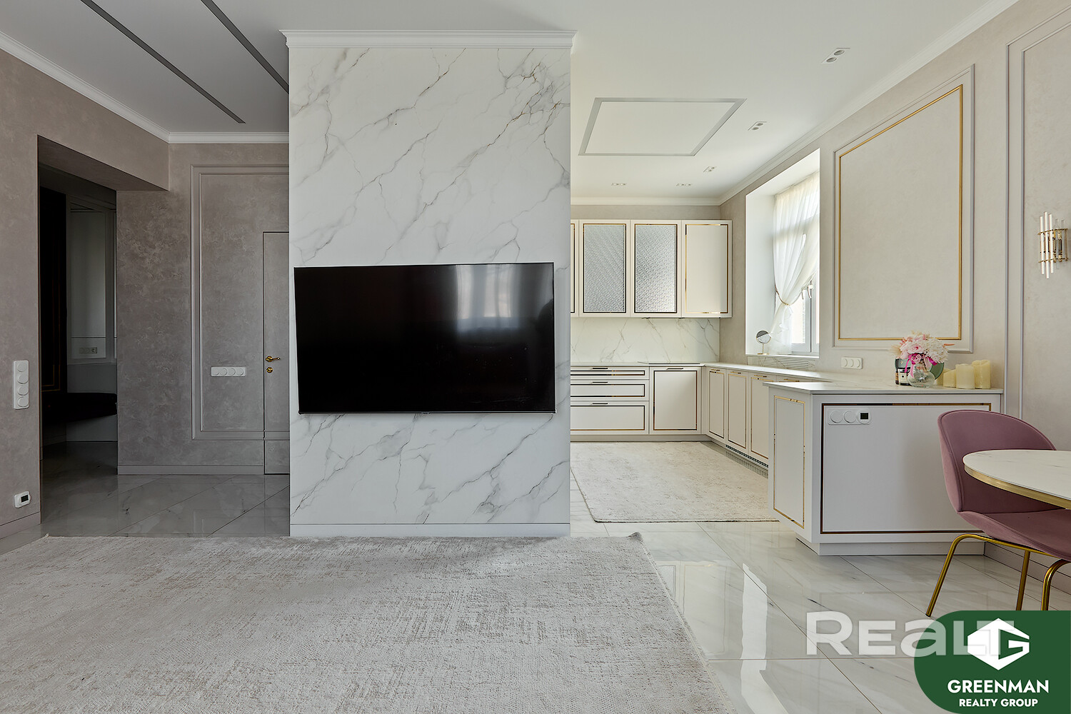 На полу залита стяжка во всех помещениях, установлены новые межкомнатные перегородки с шумоизоляцией, полностью заменены электрика и сантехника, имеется система кондиционирования. Напольное покрытие — итальянская плитка и парке (теплые полы).