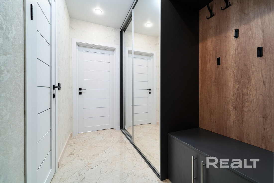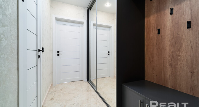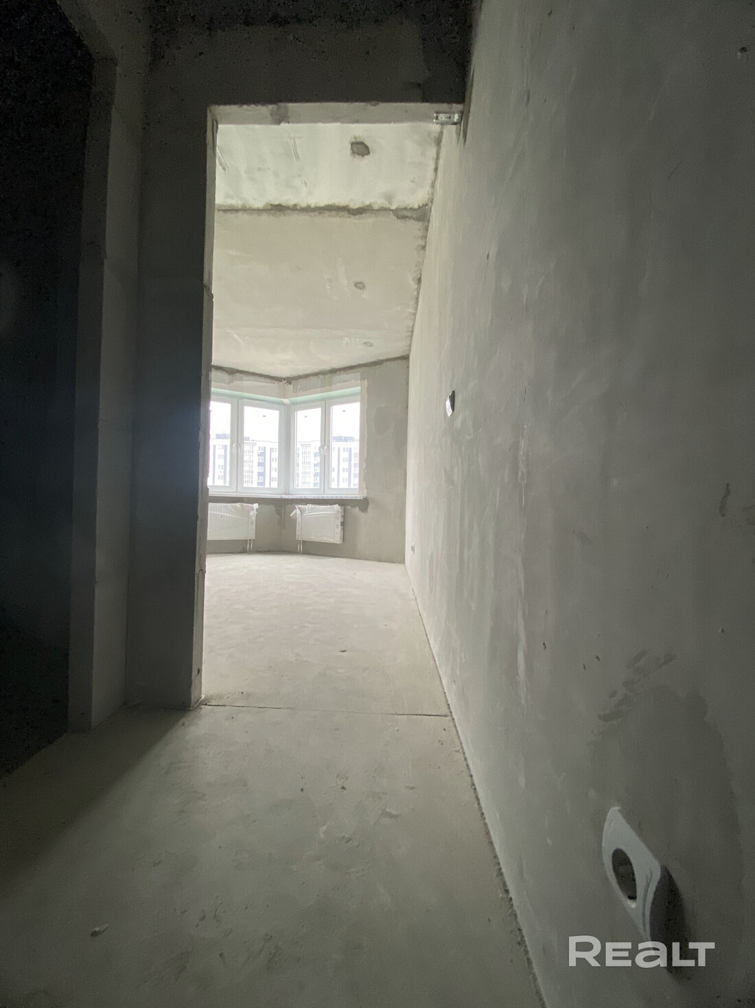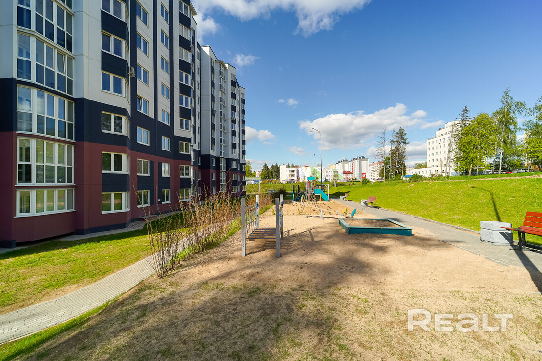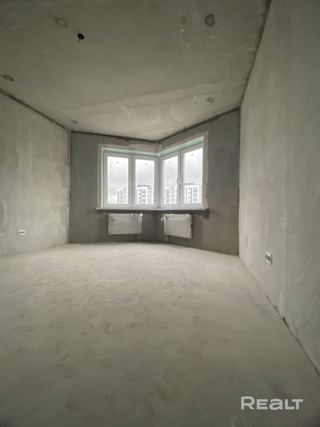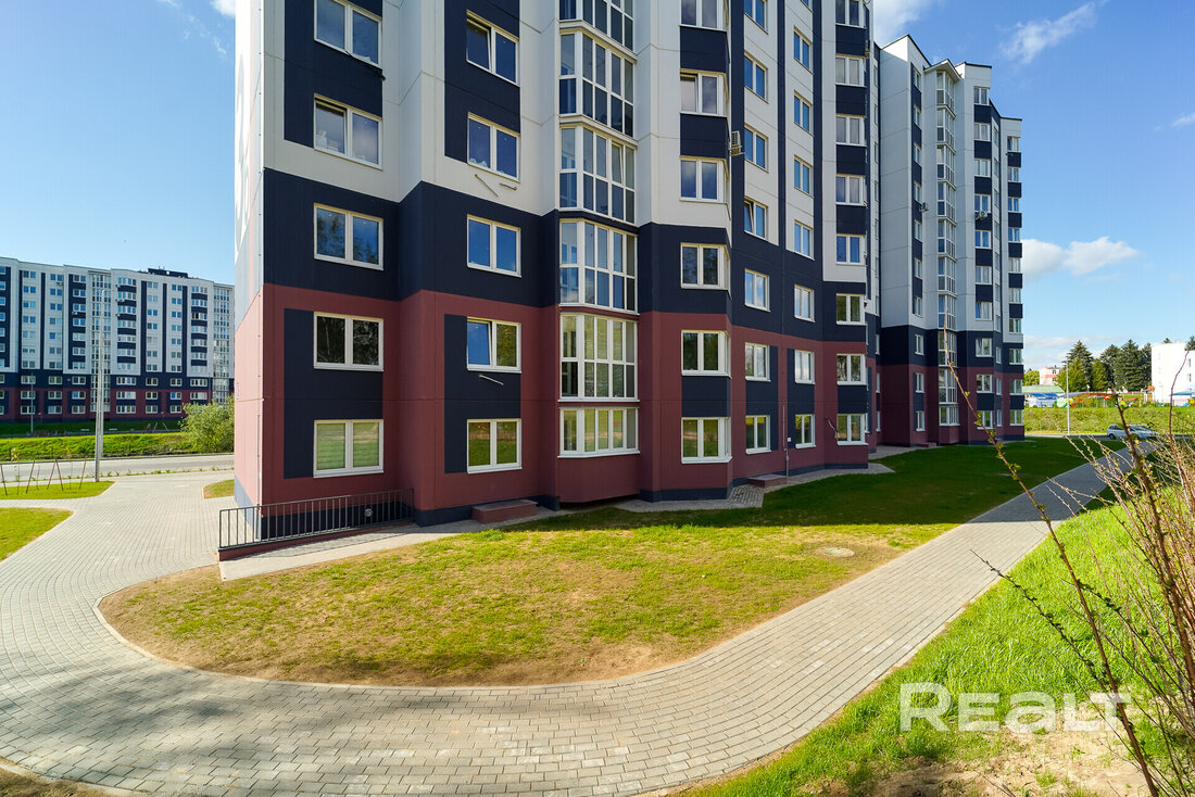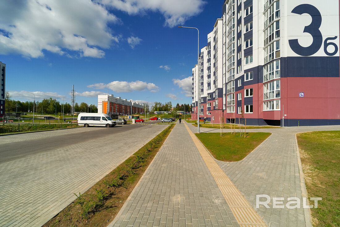 Все новостройки тут — одинаковые. Это десятиэтажные панельные дома с треугольными эркерами от Солигорского ДСК. Сами квартиры сдаются с черновой отделкой, цементно-песчаной стяжкой, входными металлическими дверями, стеклопакетами, унитазами, счетчиками на воду, электроразводкой с розетками и выключателями. Высота потолков в жилье — 2,6 метра.