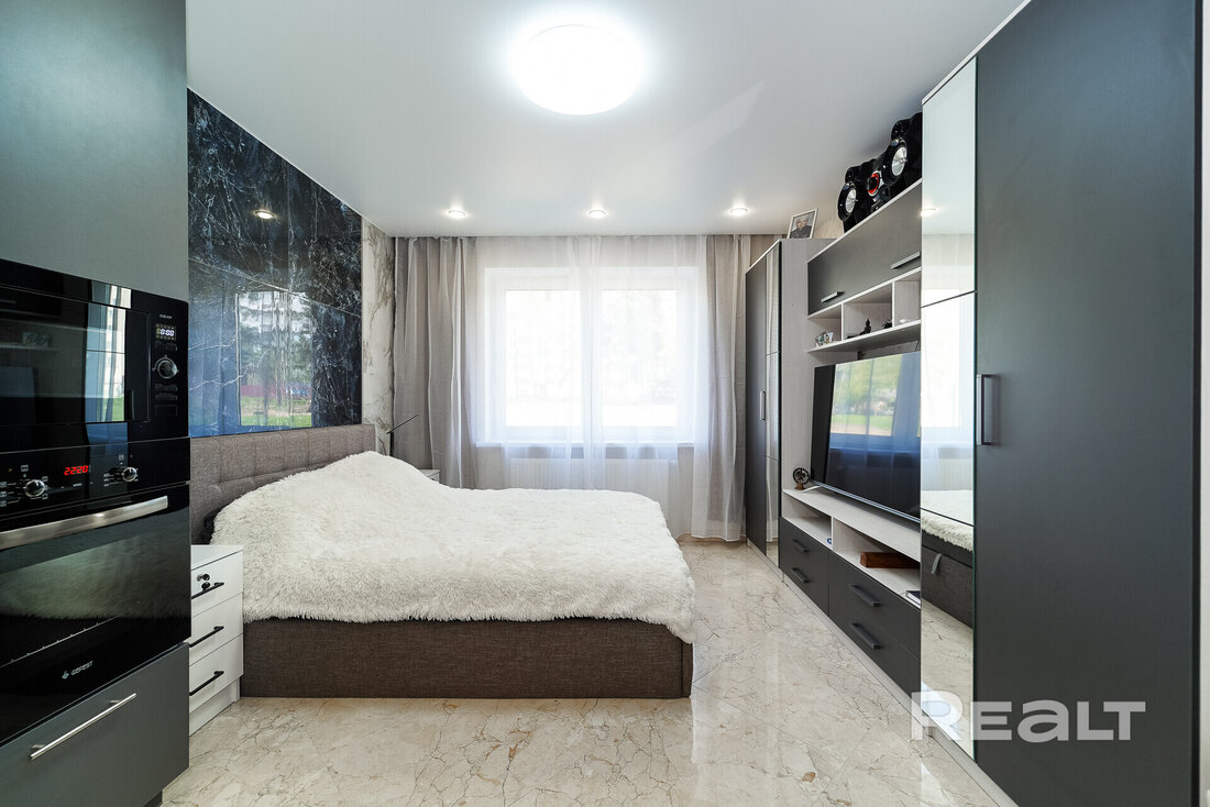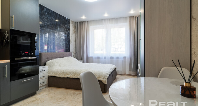 Также в продаже имеется малогабаритная студия с отделкой. Квартира площадью 19,8 квадрата находится на последнем (десятом) этаже дома по улице Брестской, 3/А. Внутри студии уже сделан евроремонт. Тут есть небольшая кухонная зона с плитой и духовкой, а также зона гостиной с телевизором, стенкой и спальным местом. Как отмечается в объявлении, квартира — «отличный вариант для пары». Правда, балкона в квартирах подобной планировки не предусмотрено. Стоимость — 50,7 тысячи долларов (2564 доллара — за метр).
