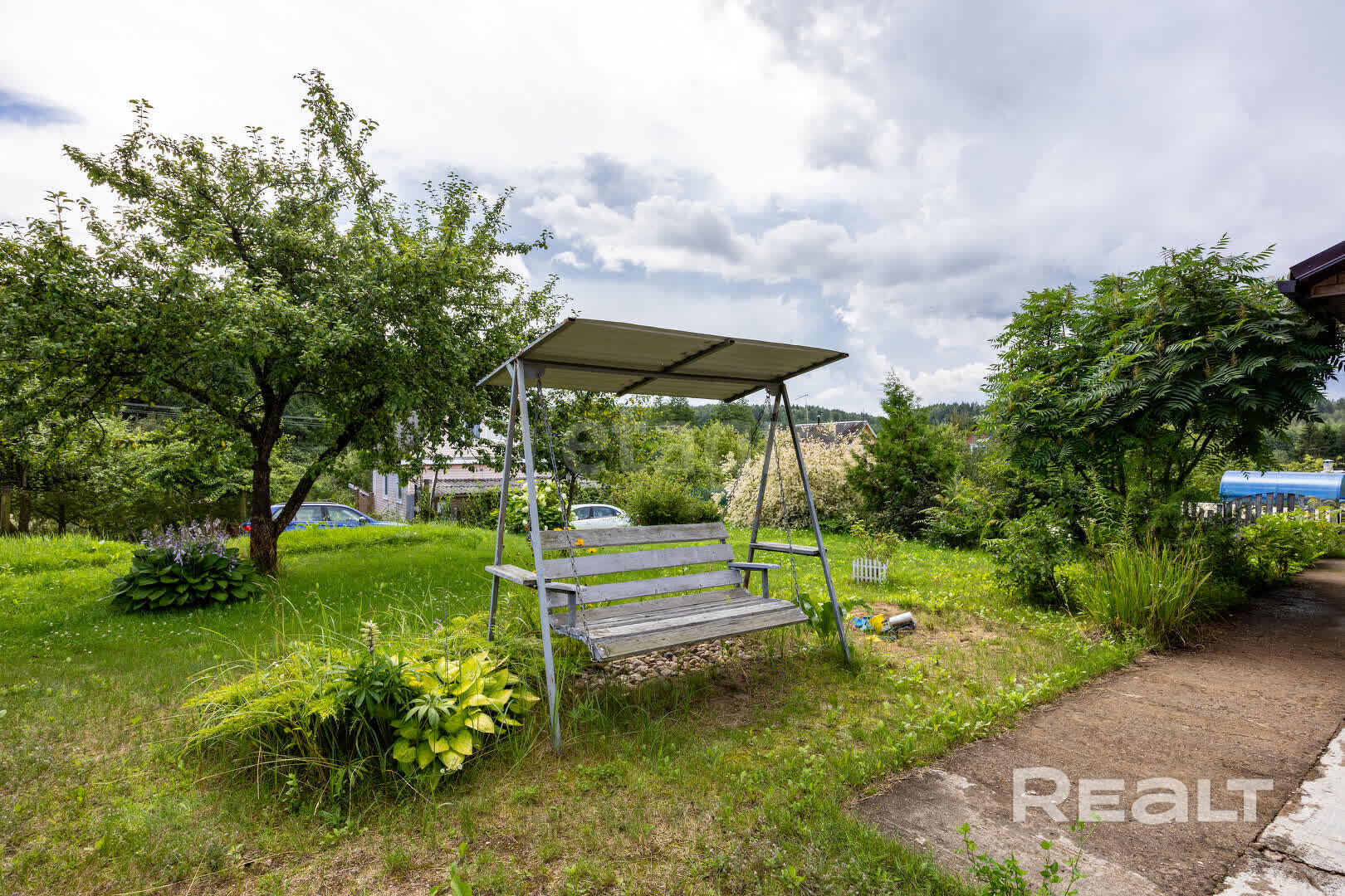 Стоит двухэтажный коттедж на небольшом ровном участке площадью 5,6 сотки. На территории есть зеленый газон, декоративные растения, яблоня и вишня, кустарники крыжовника, малины и смородины. Также тут подготовлена зона барбекю и качели — в общем, все, что нужно, для полноценного отдыха на даче. Сам участок находится на возвышенности с прекрасными видами.