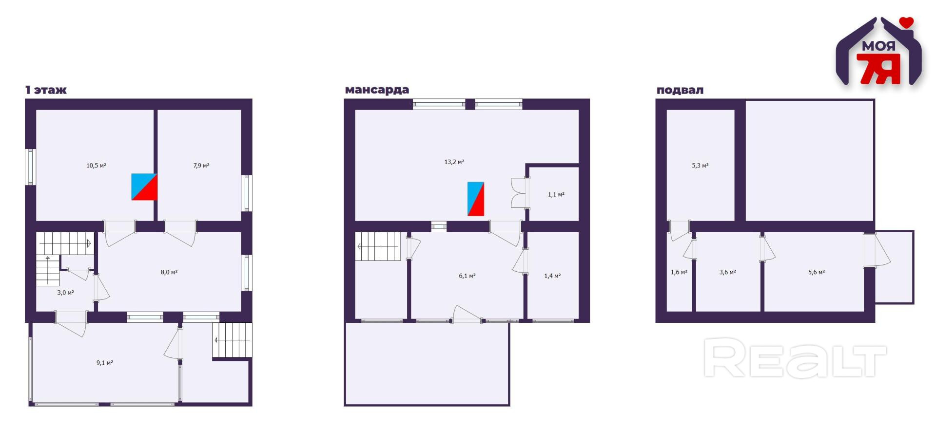 Внизу расположен цокольный этаж (подвал) площадью 14 квадратов и с высотой потолка в 1,8 метра. В перспективе можно оборудовать весь цокольный этаж, его площадь составляет около 35 квадратов. Между цоколем и первым этажом уложено железо-бетонное перекрытие, а между первым и вторым этажом — деревянные балки.