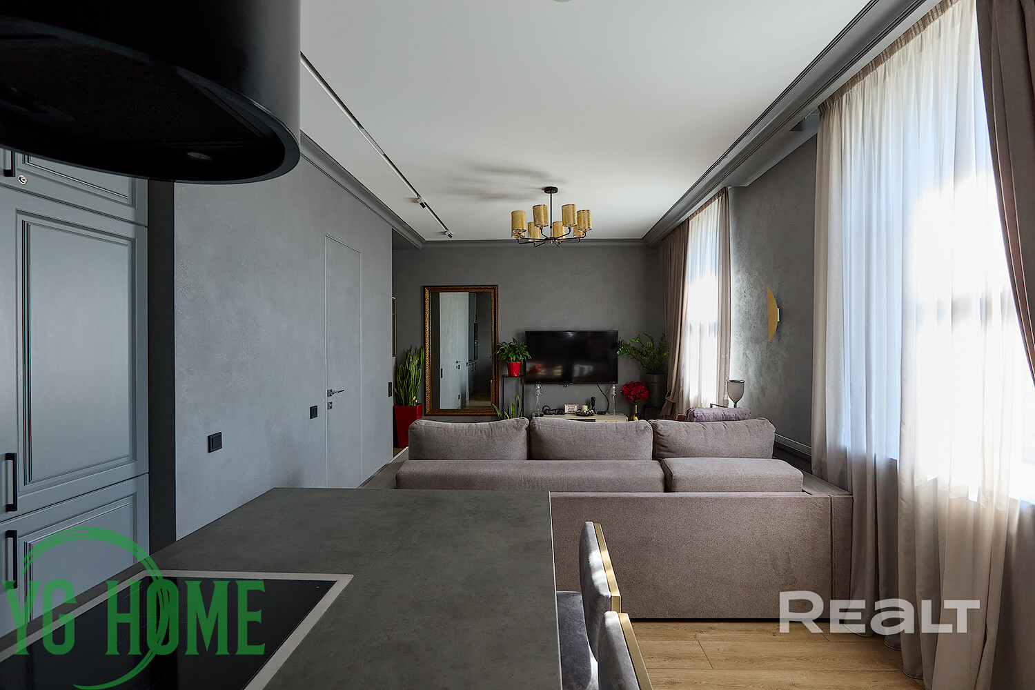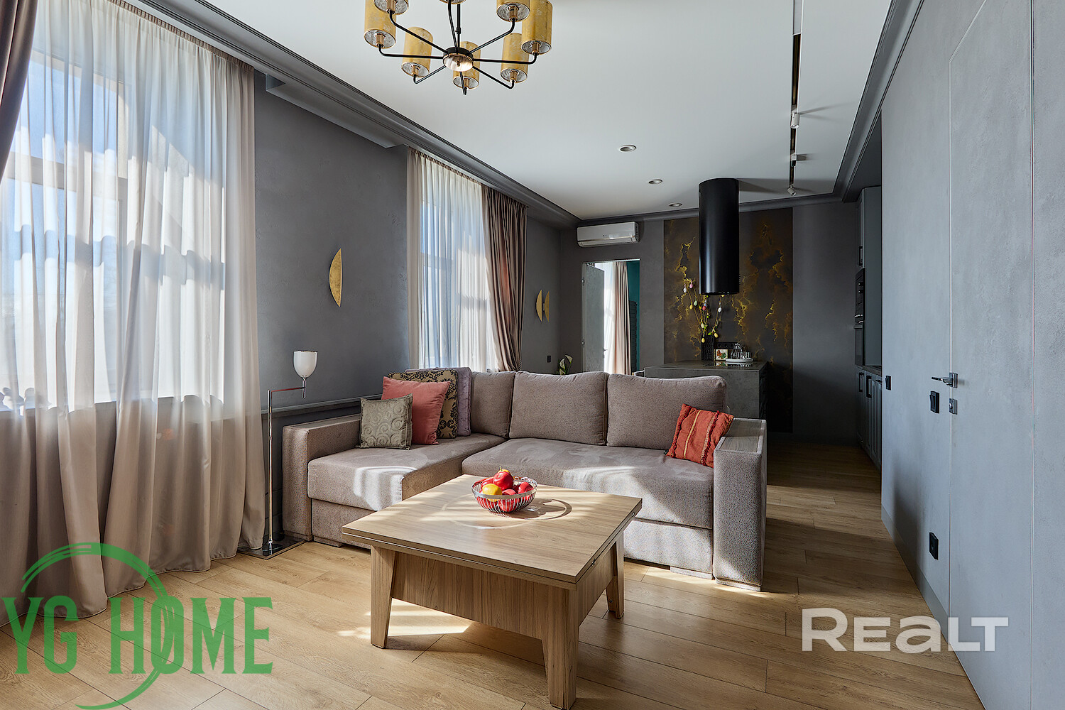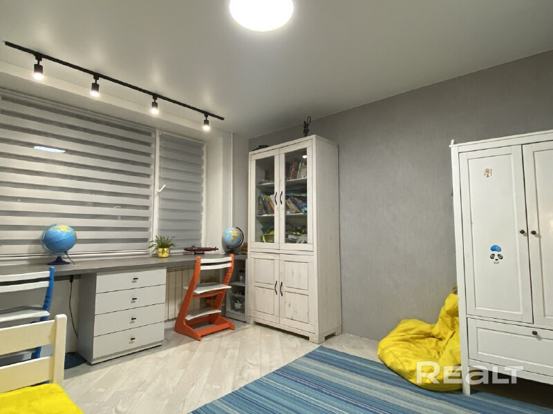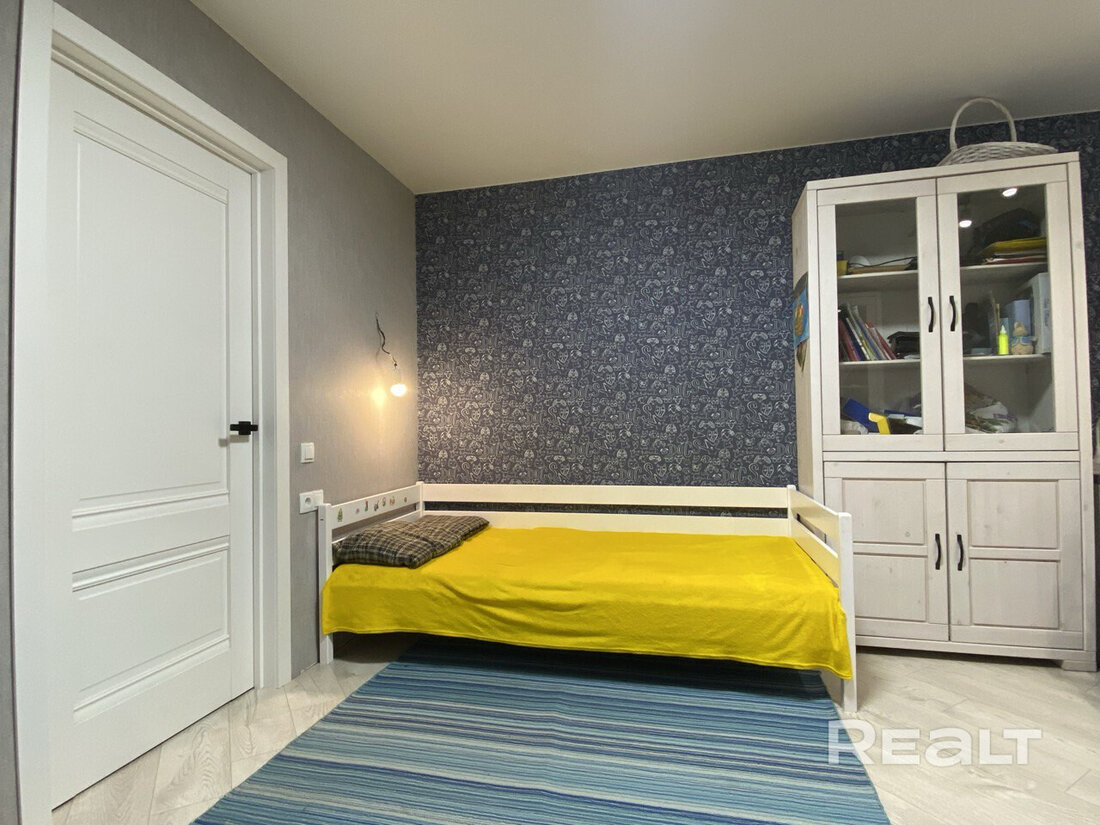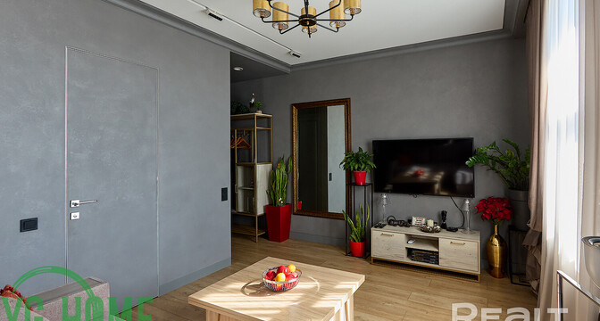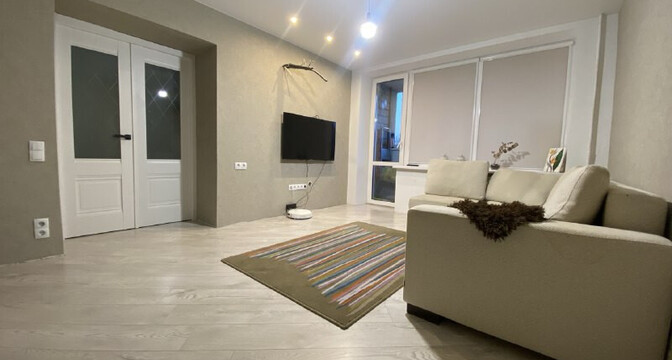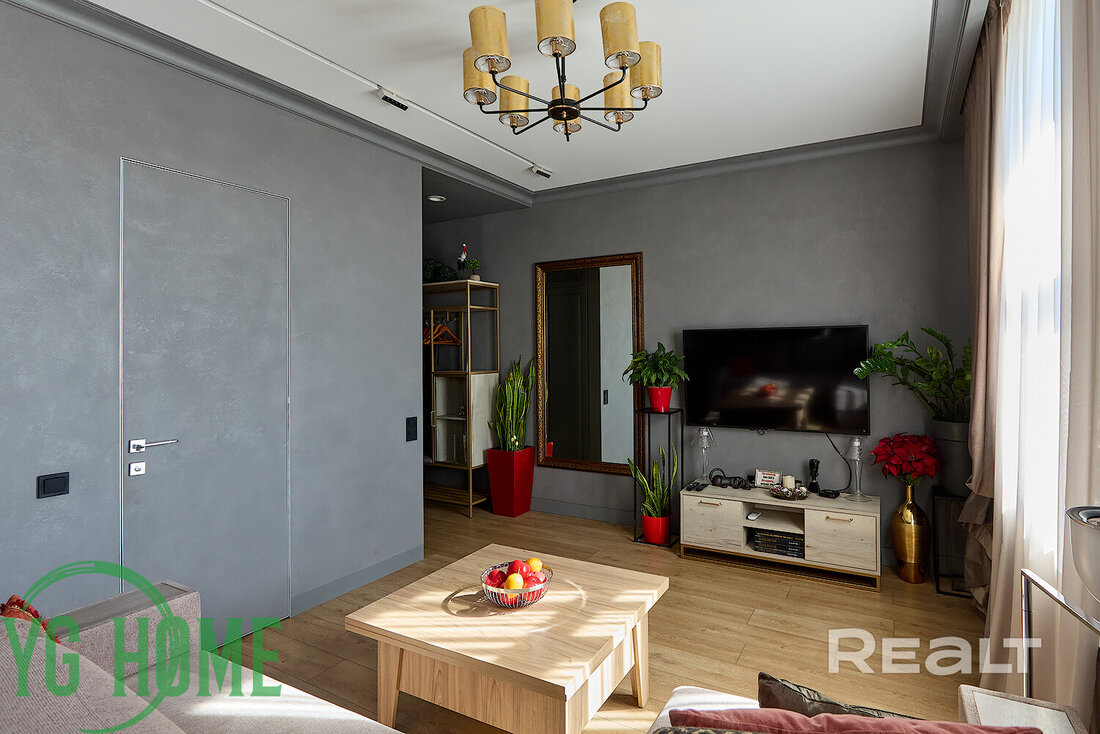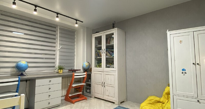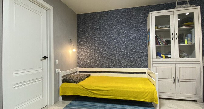В одной жилой комнате оборудована детская, а во второй — гостиная. Формально она отделена от кухни. В комнатах на полу лежит ламинат, а в кухне, коридоре и ванной — плитка. Потолки из гипсокартона. В гостиной установлен кондиционер.