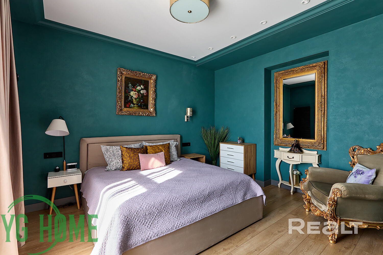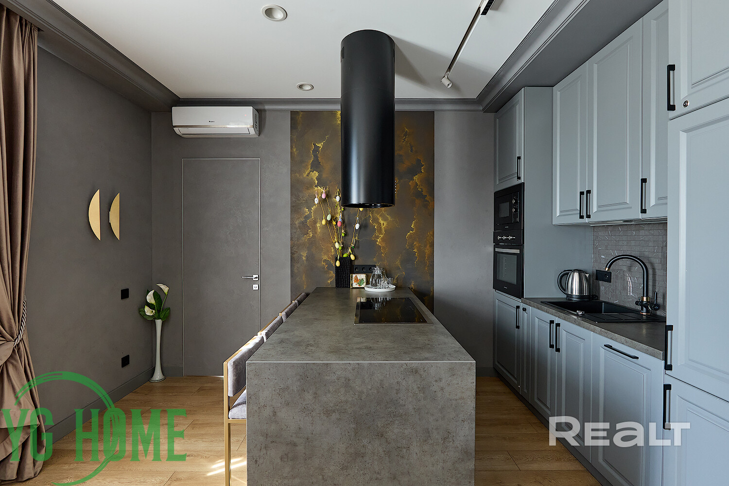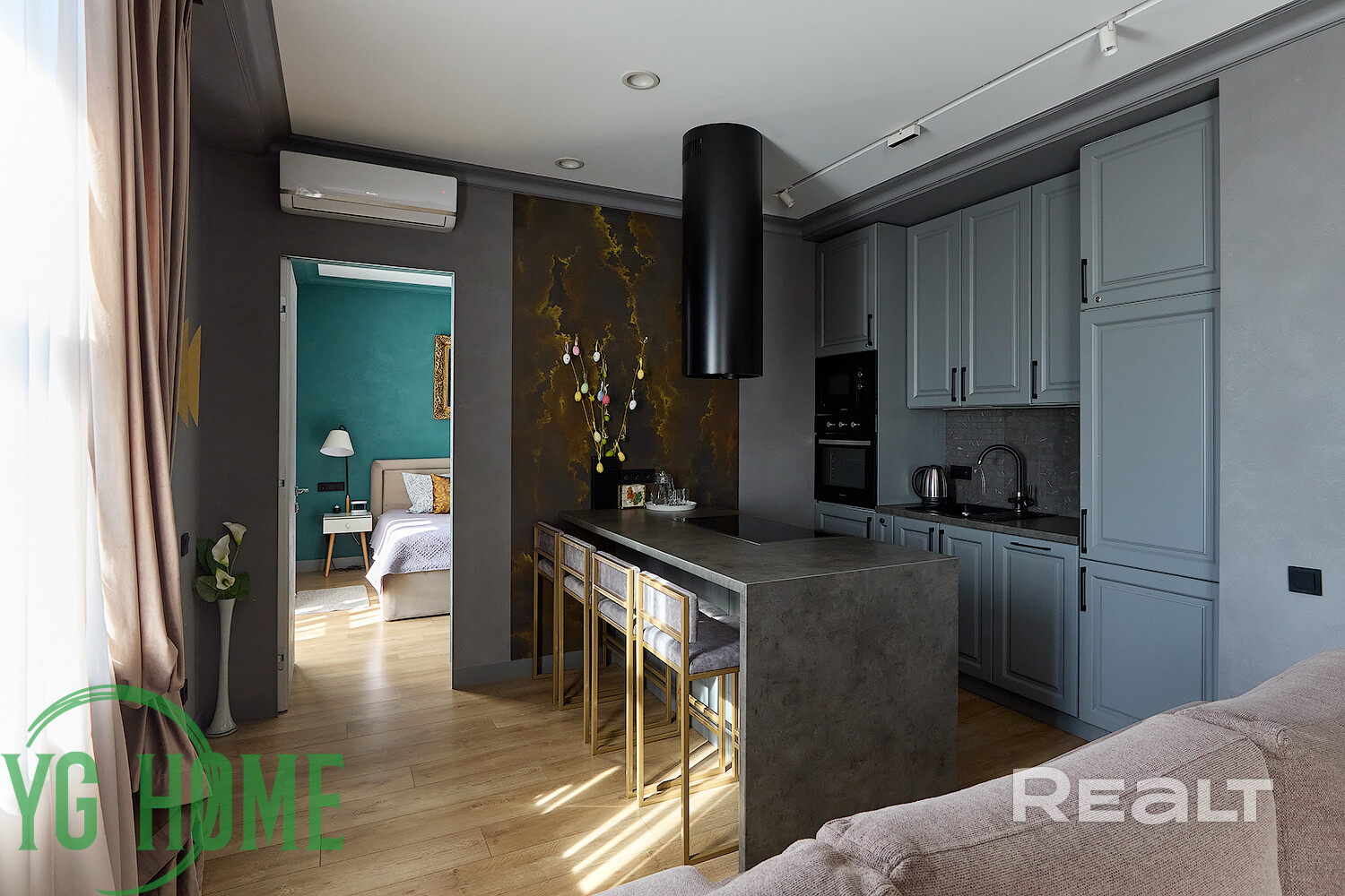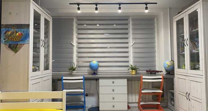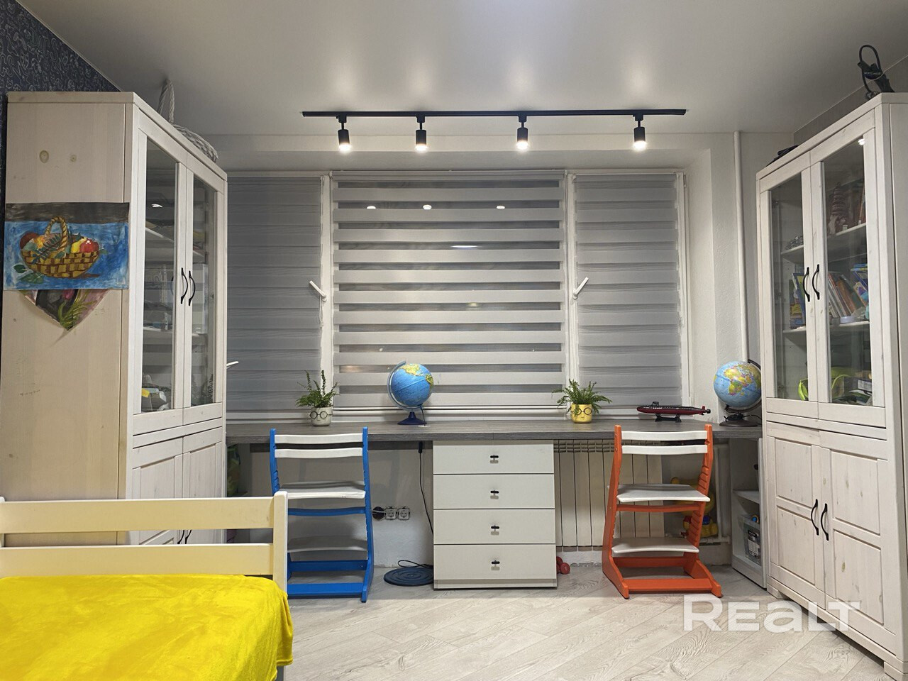 В одной жилой комнате оборудована детская, а во второй — гостиная. Формально она отделена от кухни. В комнатах на полу лежит ламинат, а в кухне, коридоре и ванной — плитка. Потолки из гипсокартона. В гостиной установлен кондиционер.