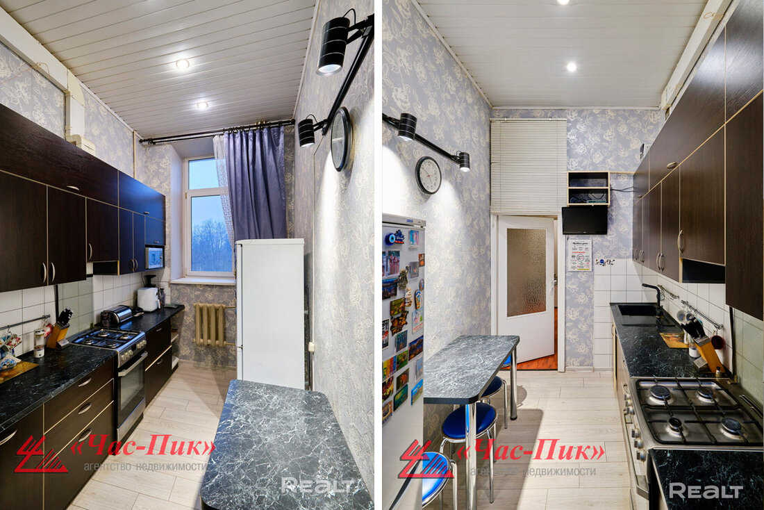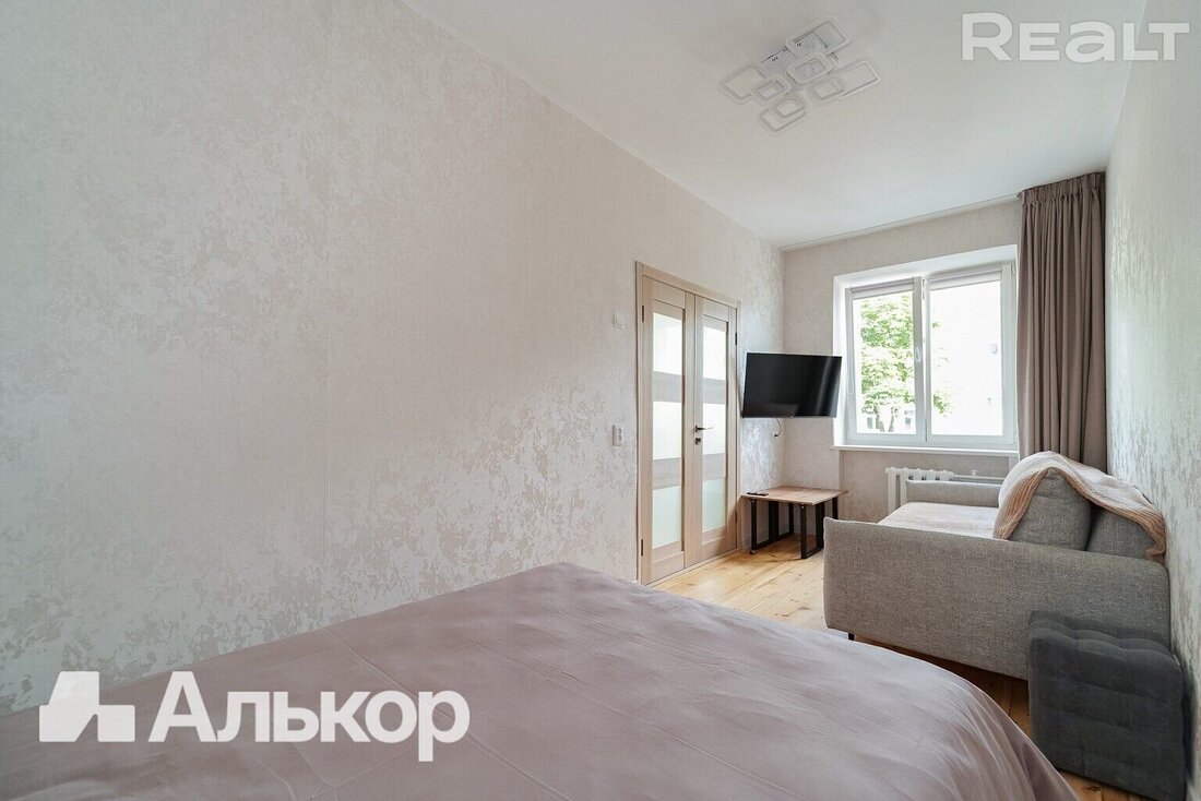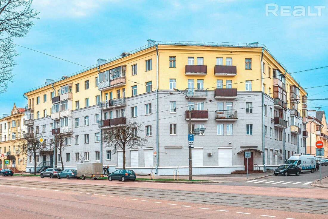 Эта квартира продается довольно давно, но из-за ее хорошей локации мы тоже добавили ее в подборку. Двушка на четвертом этаже пятиэтажной сталинки 1958 года по адресу Змитрока Бядули, 6.