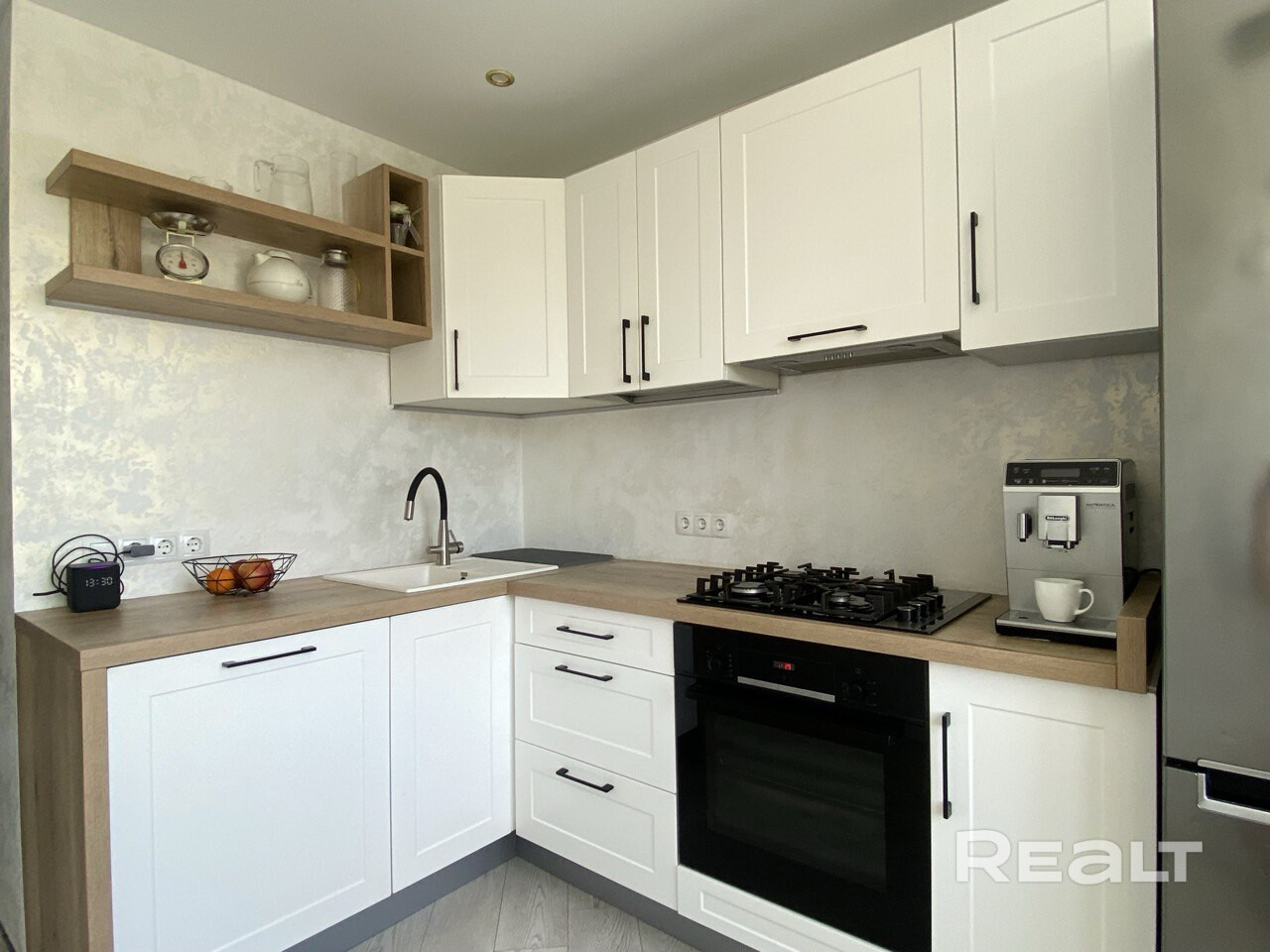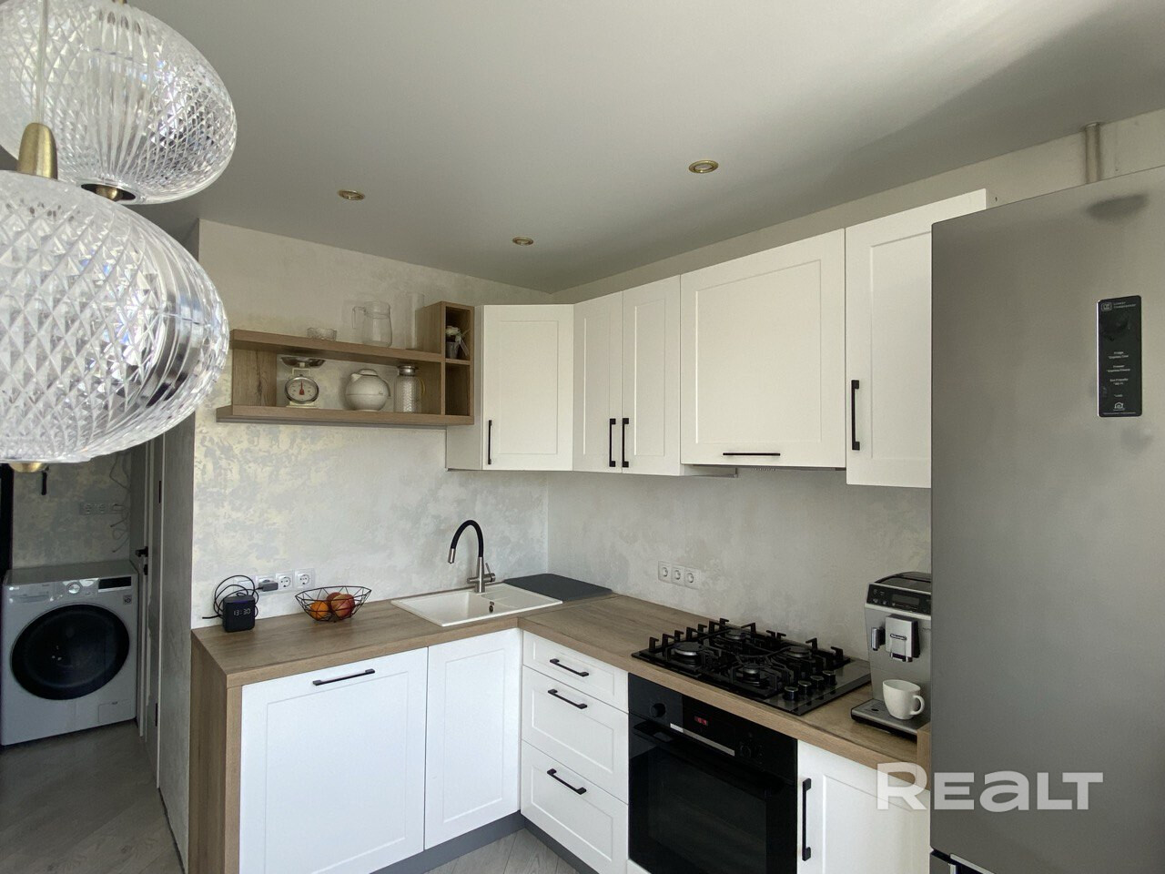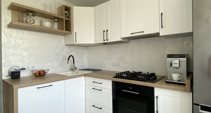 В кухне из техники есть газово-электрическая плита, духовка с функцией микроволновки, вытяжка, холодильник и морозильник.