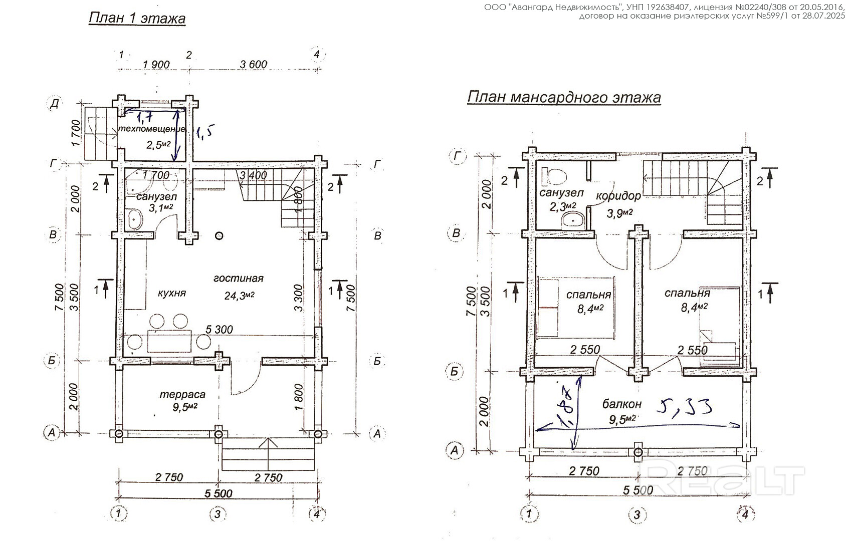 Двухэтажный дом был построен в 2023 году. Он возведен из сосны диаметром 200 мм, стоит на свайном фундаменте (свайное поле на 19 свай) и покрыт металлочерепицей с утеплением минватой 200 мм.