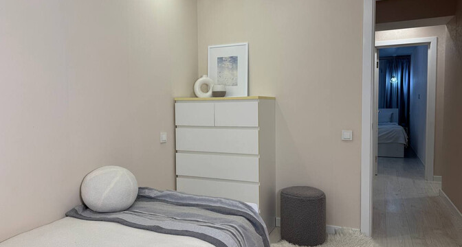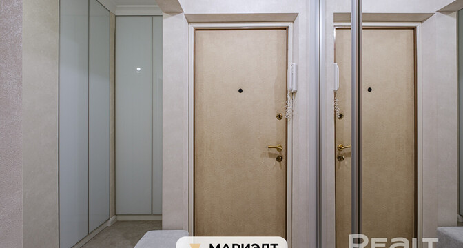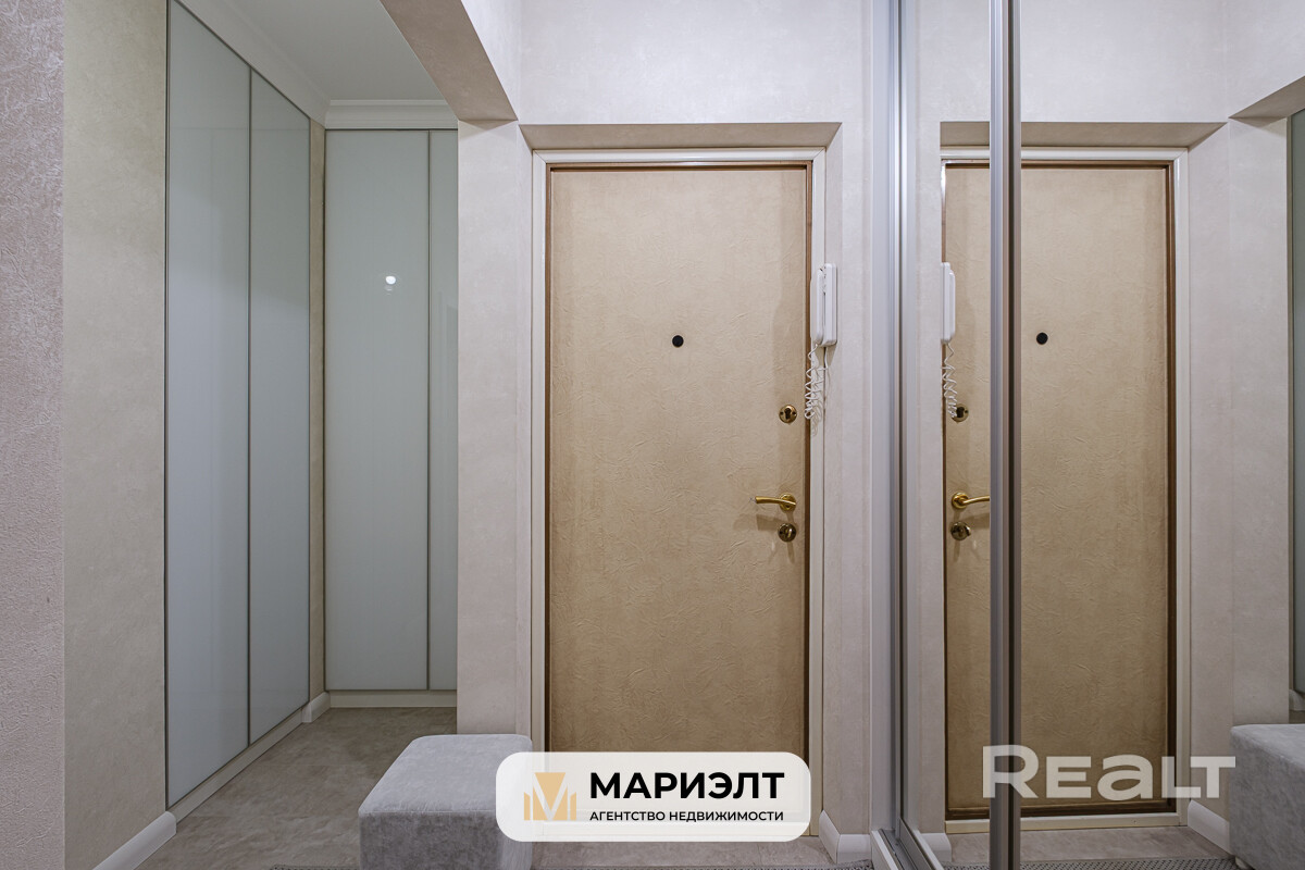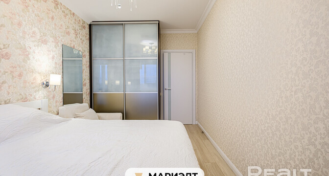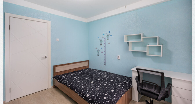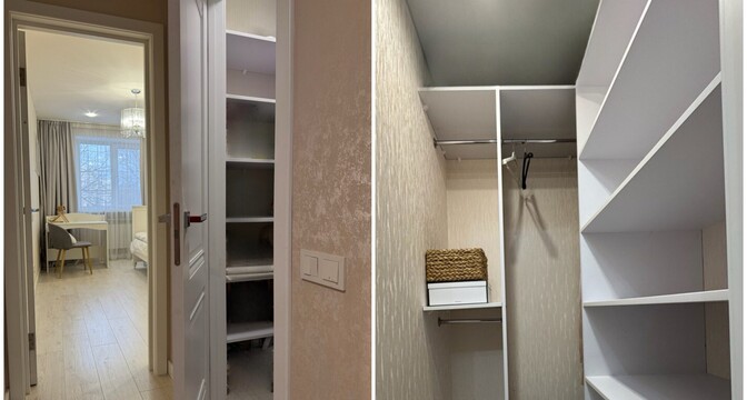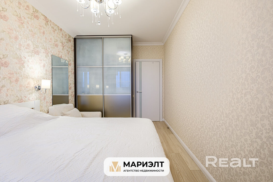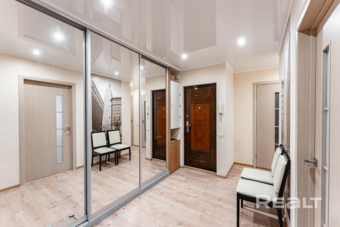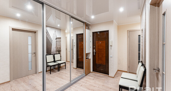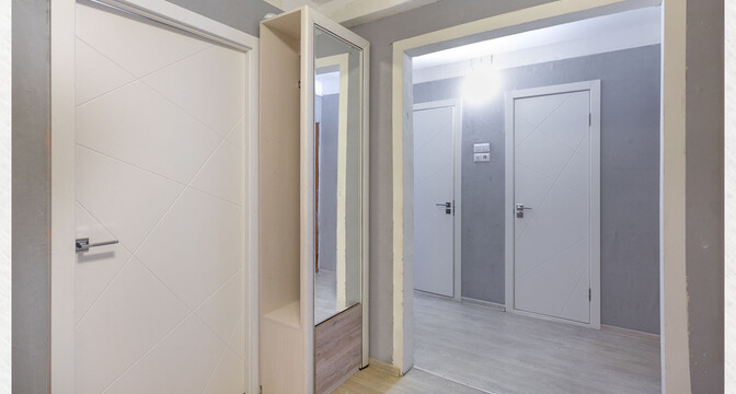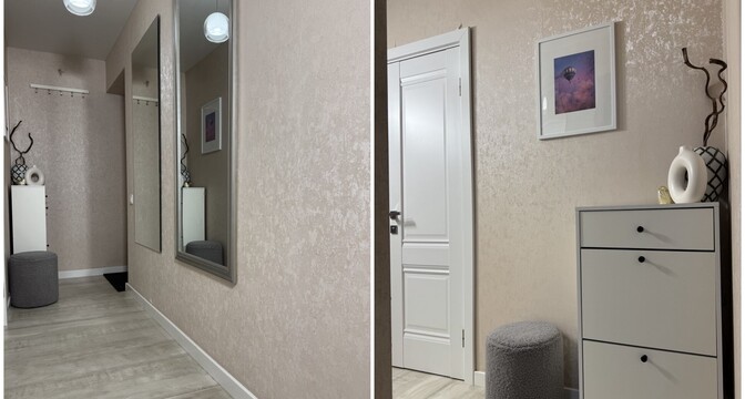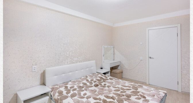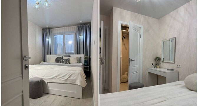 В квартире сделан хороший современный ремонт. Владельцы немного поменяли планировку. Изначально одна из комнат была проходной и совмещена с коридором. Теперь вход в одну из спален располагается с другой стороны. Ее также увеличили за счет переноса входной двери. Одну кладовую перенесли таким образом, чтобы она служила личной гардеробной.