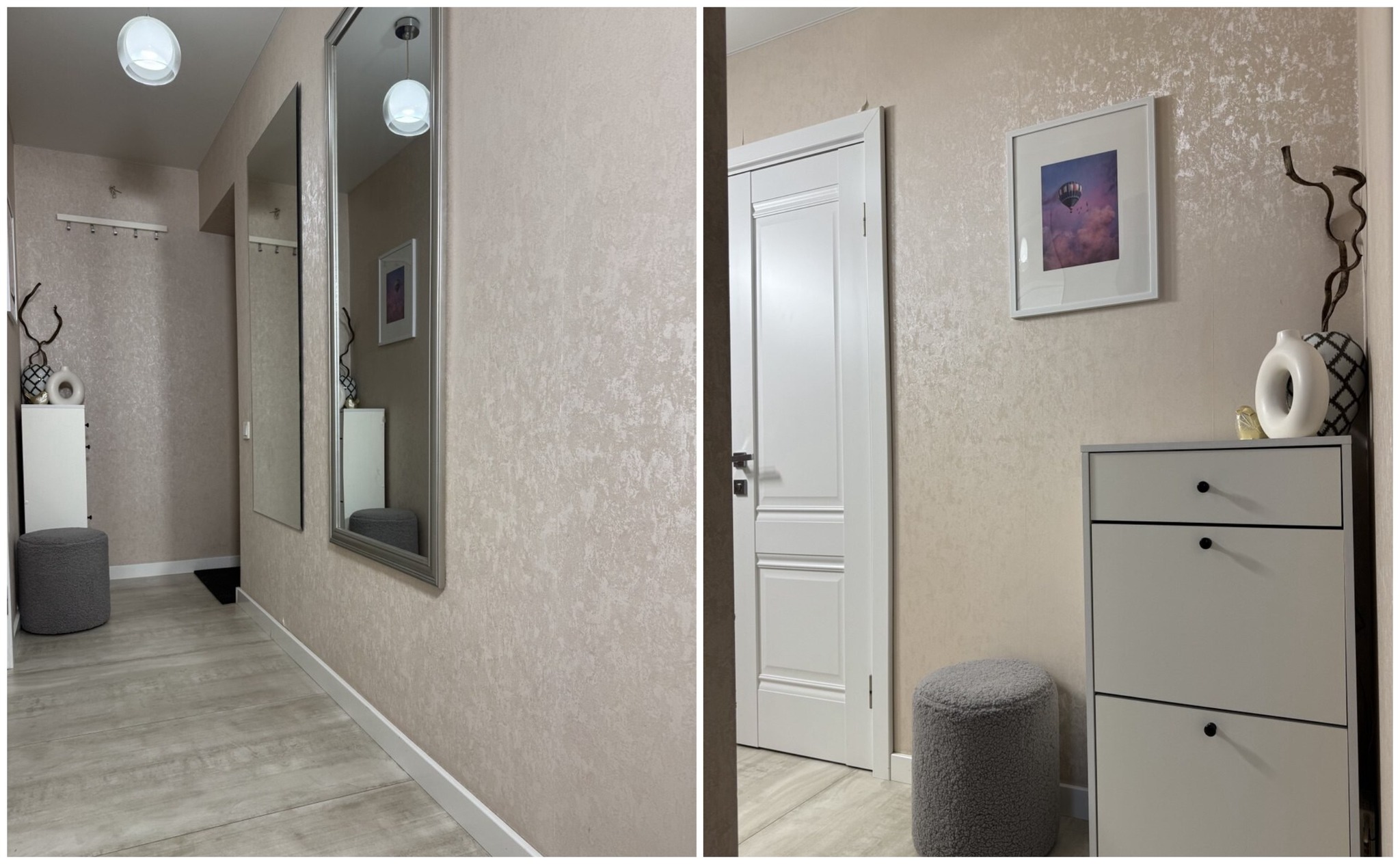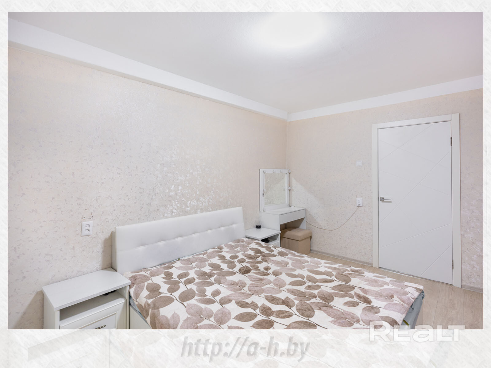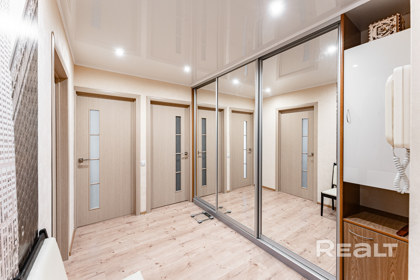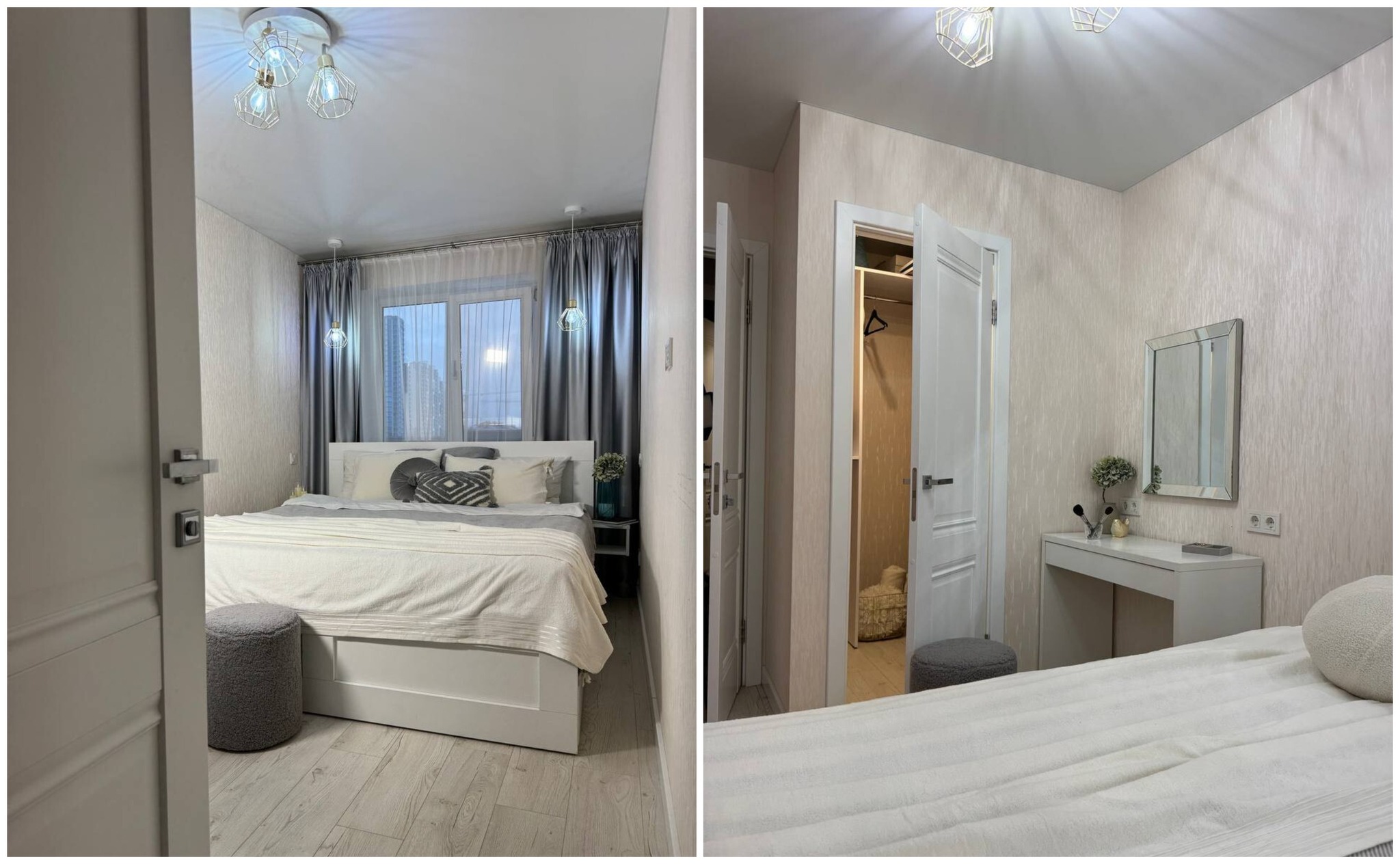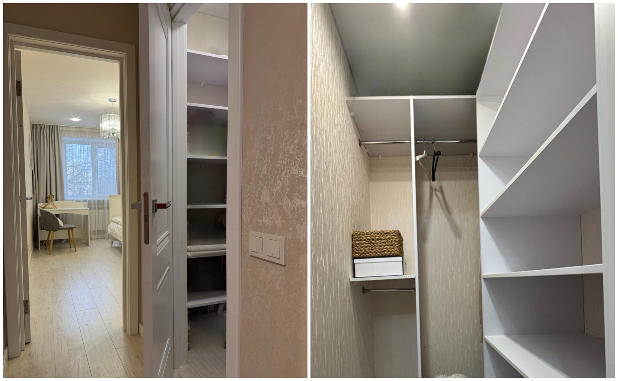 В квартире сделан хороший современный ремонт. Владельцы немного поменяли планировку. Изначально одна из комнат была проходной и совмещена с коридором. Теперь вход в одну из спален располагается с другой стороны. Ее также увеличили за счет переноса входной двери. Одну кладовую перенесли таким образом, чтобы она служила личной гардеробной.