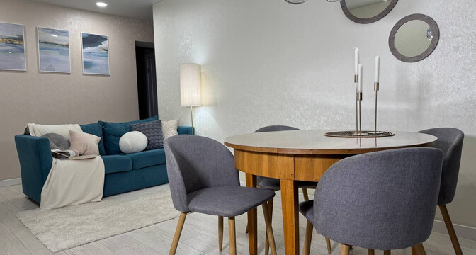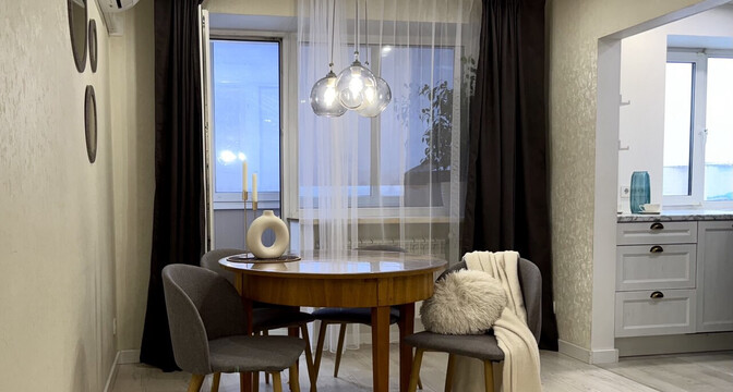 Квартира с одной изолированной комнатой. Внутри сделан хороший ремонт. Тут остается практически вся мебель. В окнах стоят новые стеклопакеты, потолки — натяжные с разными режимами освещения. Выделены электрические автоматы, газовая колонка на гарантии.