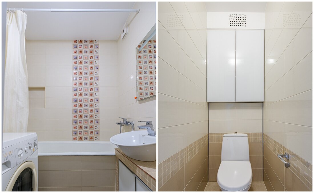 Санузел и ванная облицованы плиткой.