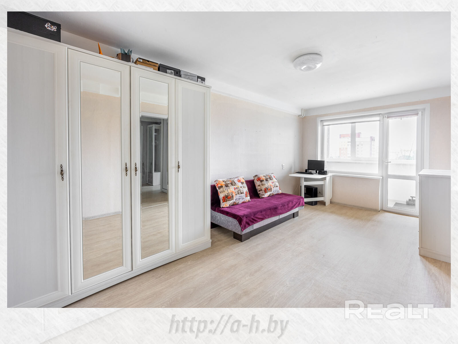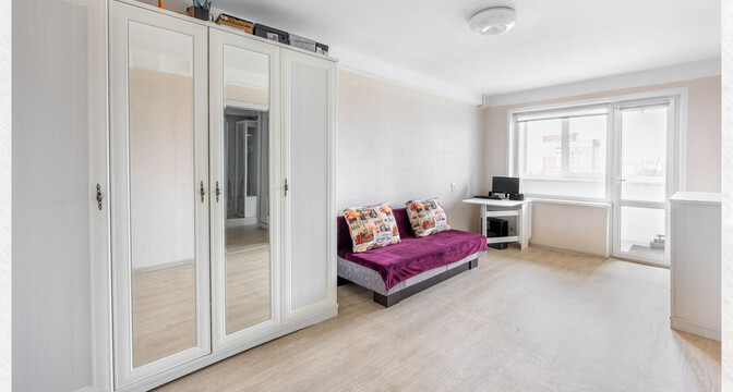 Квартира с новым ремонтом. Она обставлена мебелью и техникой. На полу тут лежит ламинат, стены оклеены обоями, в окнах стоят стеклопакеты. Все комнаты в трешке раздельные, в одной из них есть выход на застекленный балкон.