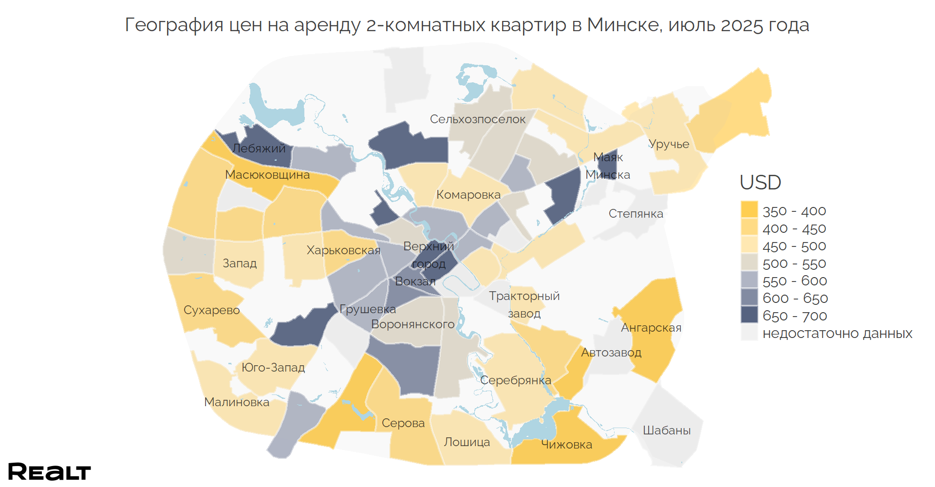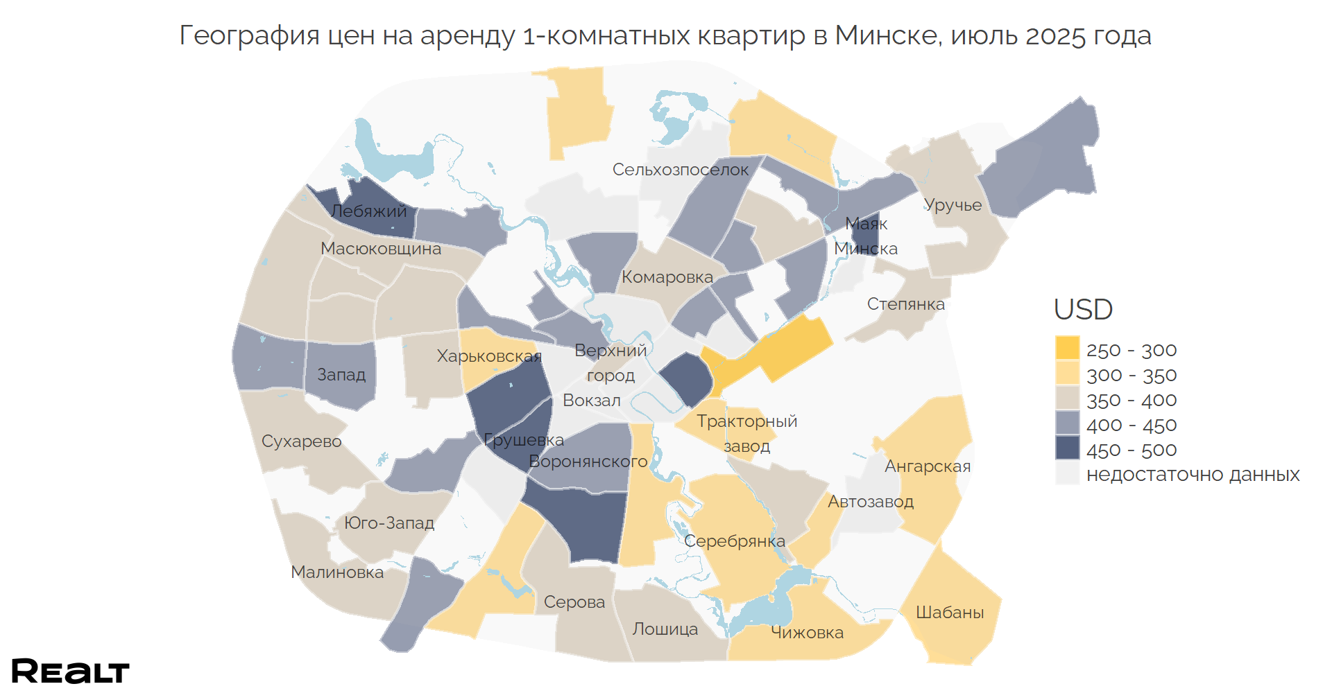 В июле наблюдался рост цен по всем сегментам. Наиболее выраженное изменение стоимости наблюдается у однушек (+4%). Таким образом на конец июля средние цены на аренду квартир в Минске выглядели следующим образом:
