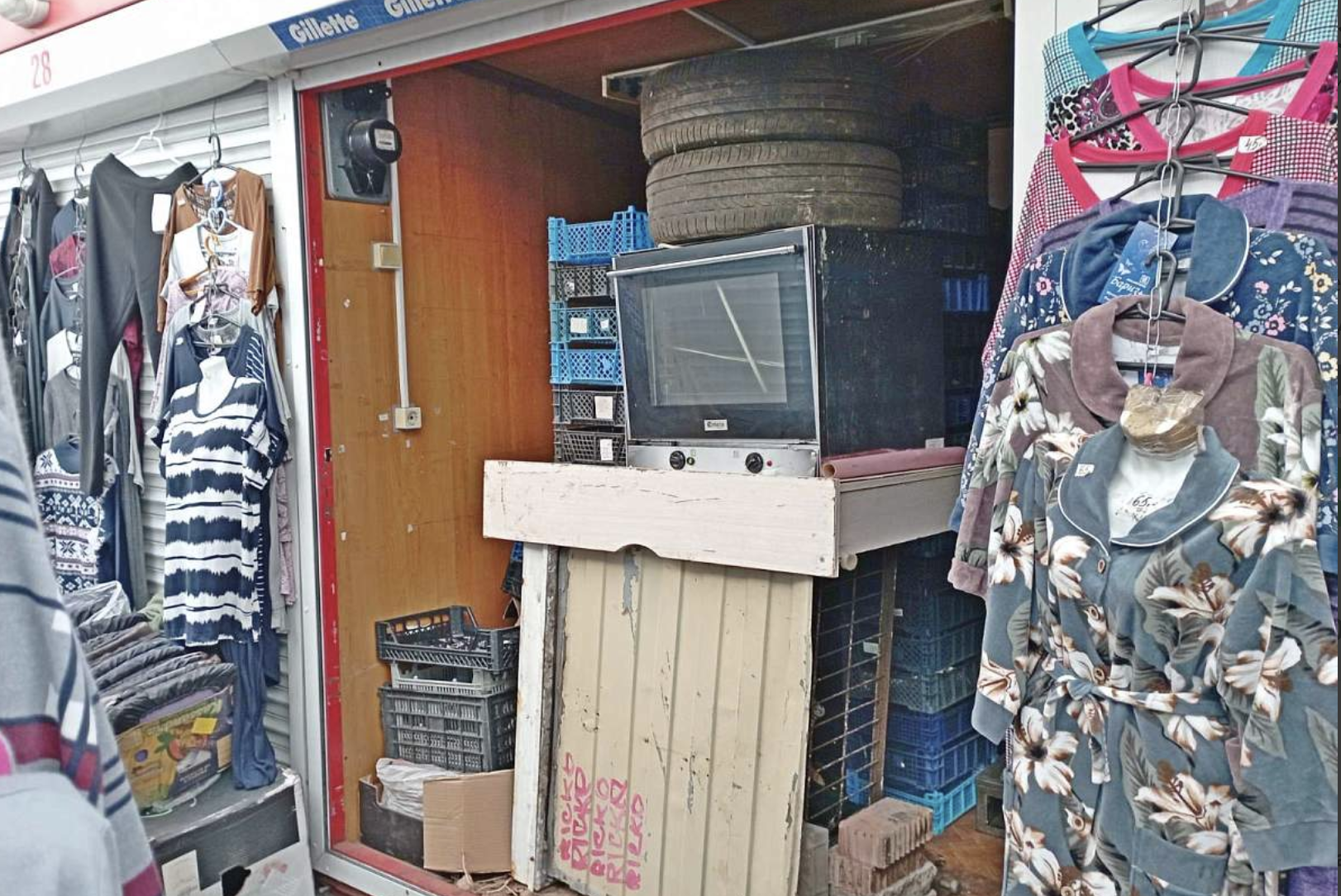 Торговый павильон находится на улице Славинского на рынке «Восток». Это в районе станции метро с таким же названием. Площадь помещения — 3,6 квадрата. Оно принадлежит должнику на праве собственности. Судя по фотографиям, бизнес в этом павильоне не вели. А использовали для хранения вещей.