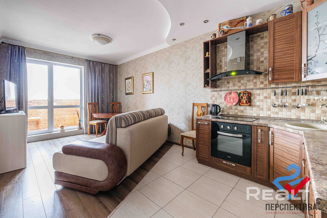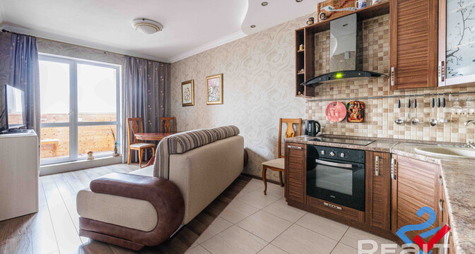 Кухня укомплектована всей необходимой техникой: варочной панелью, духовым шкафом, холодильником. Высота потолков достигает 2,75 метра. В окнах стоят стеклопакеты ПВХ, на полу — плитка и ламинат.