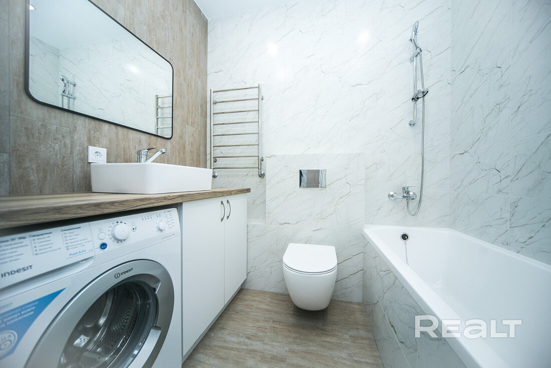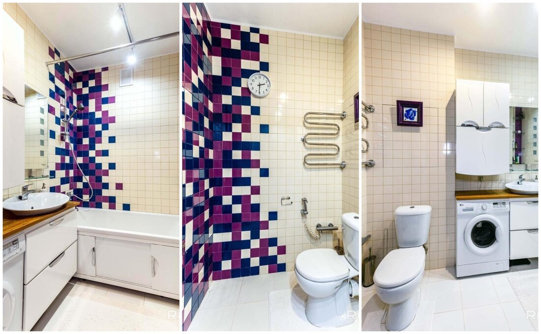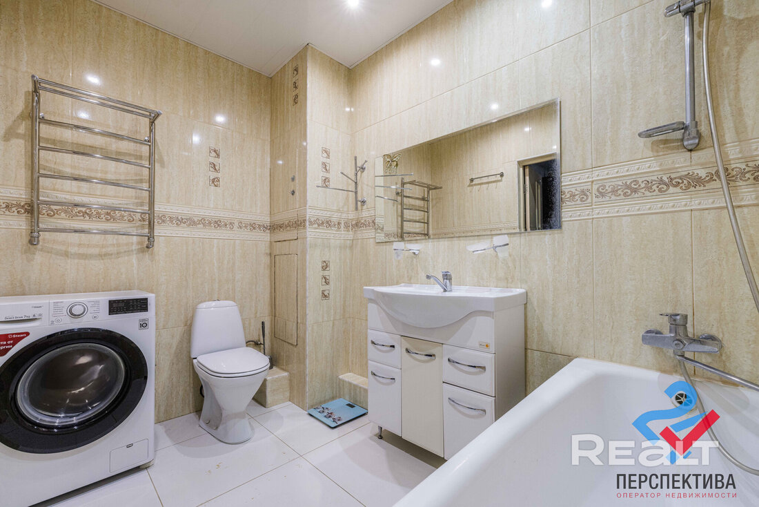 Тут совмещенный санузел, где установлена стиральная машина. Из совмещенной зоны есть выход на застекленную лоджию.