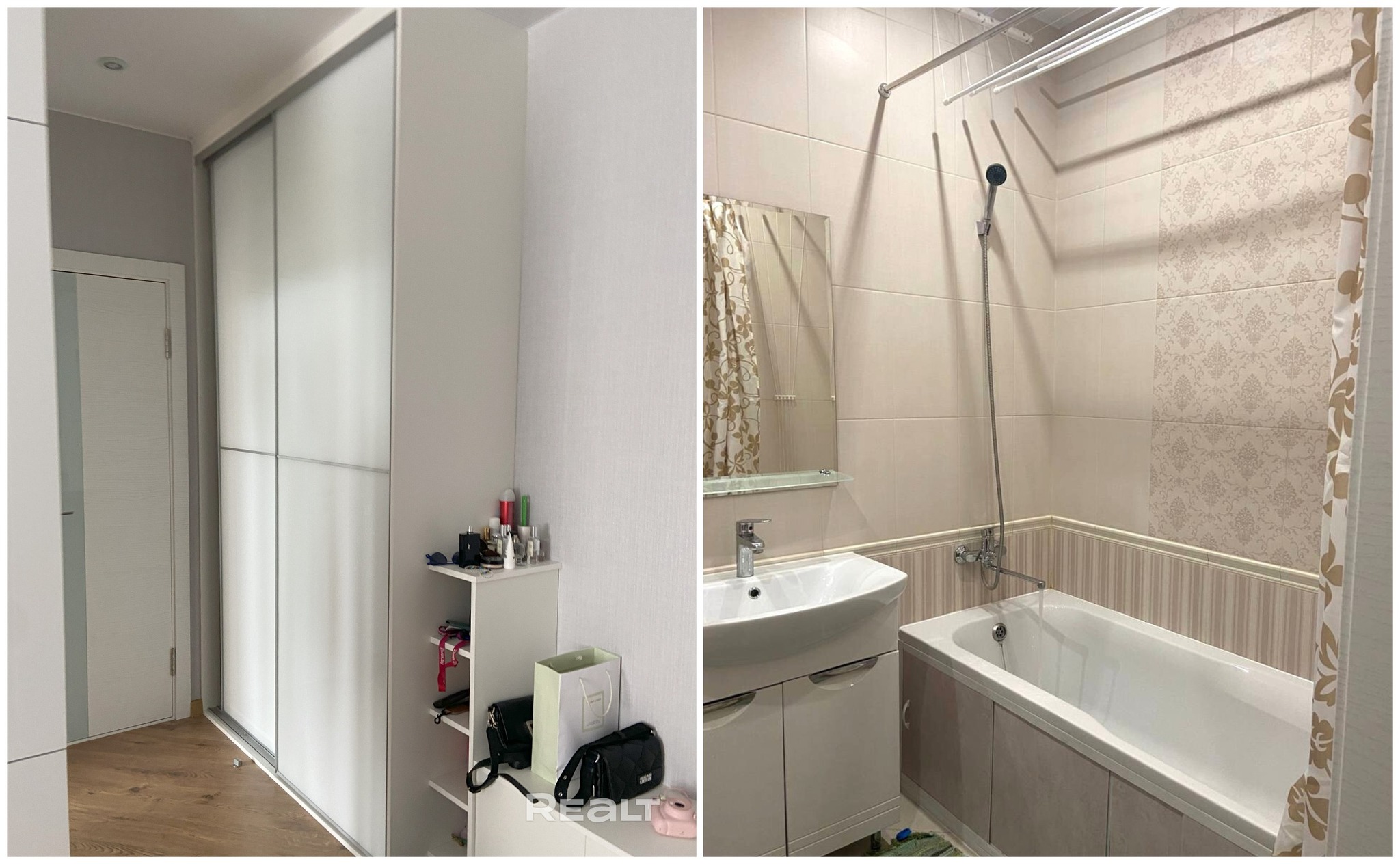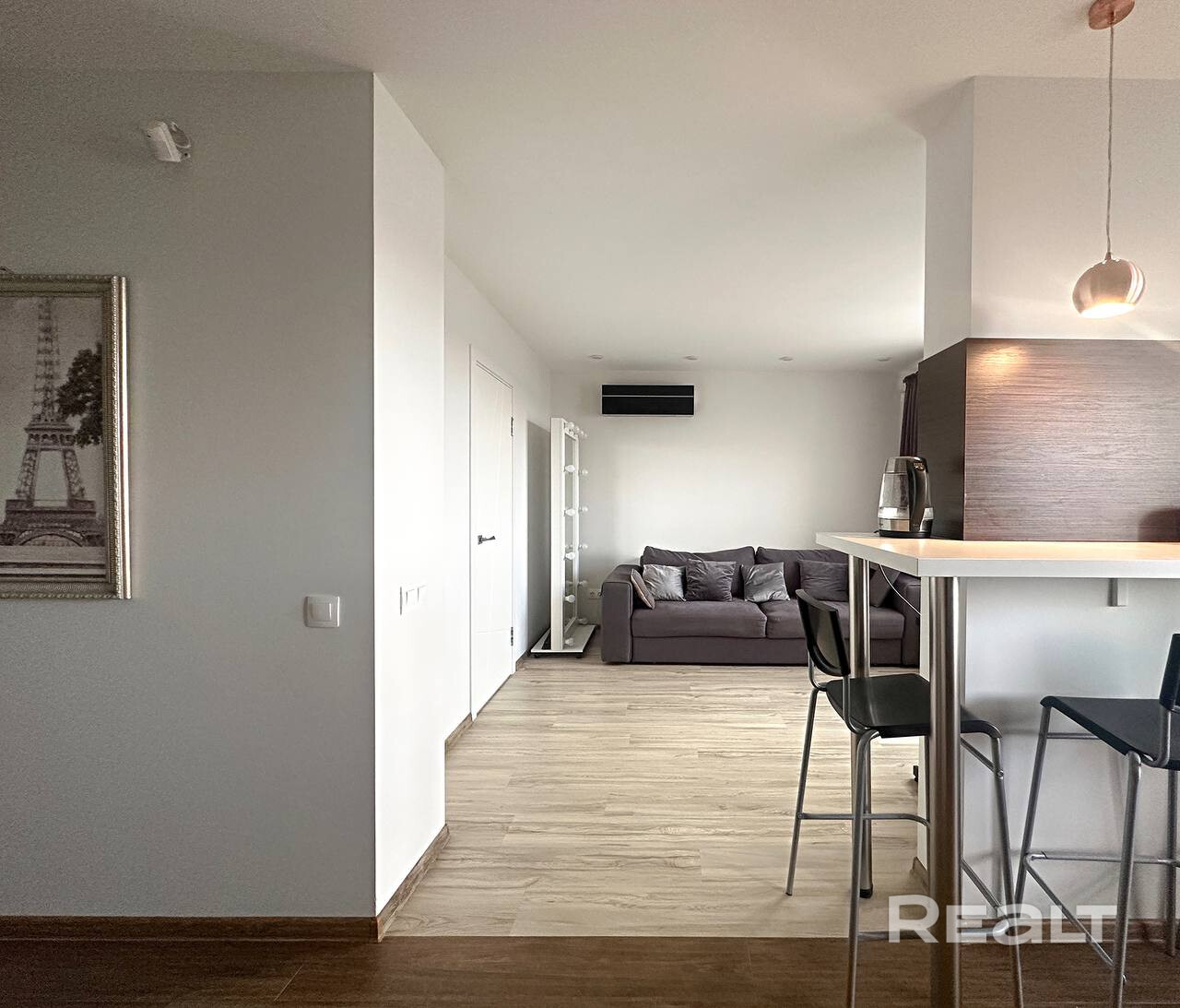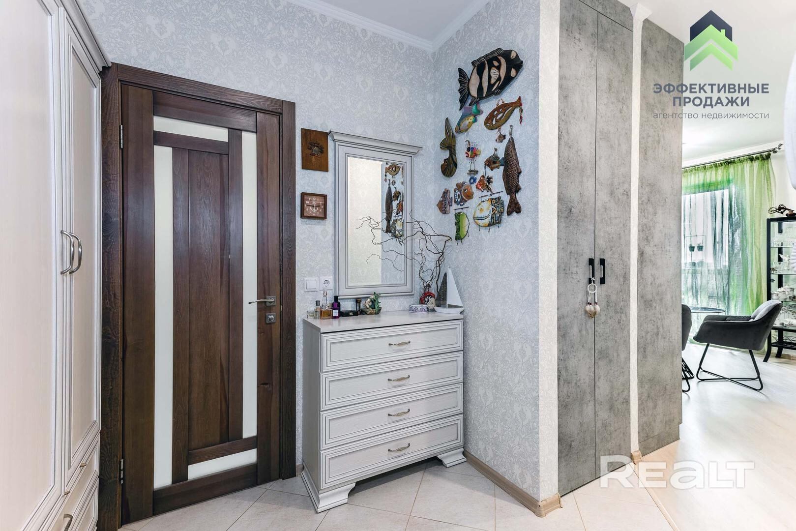 Жилье с ремонтом: на полу лежат кафель с подогревом и ламинат. Кухня обставлена техникой и мебелью. В коридоре стоит шкаф.
