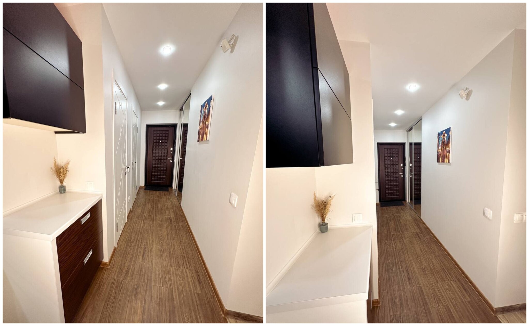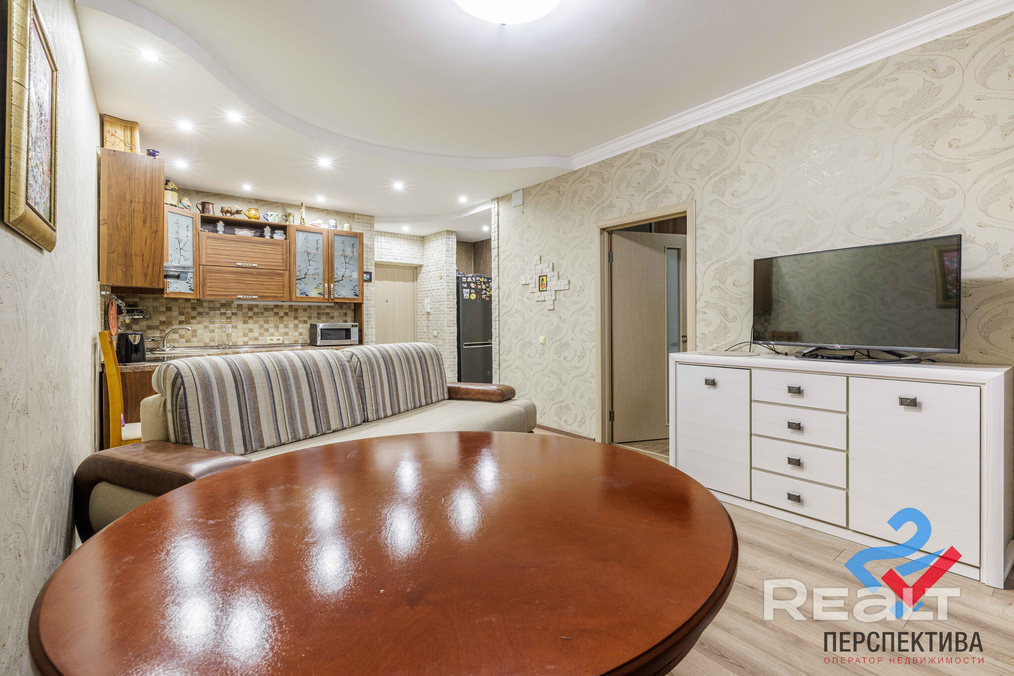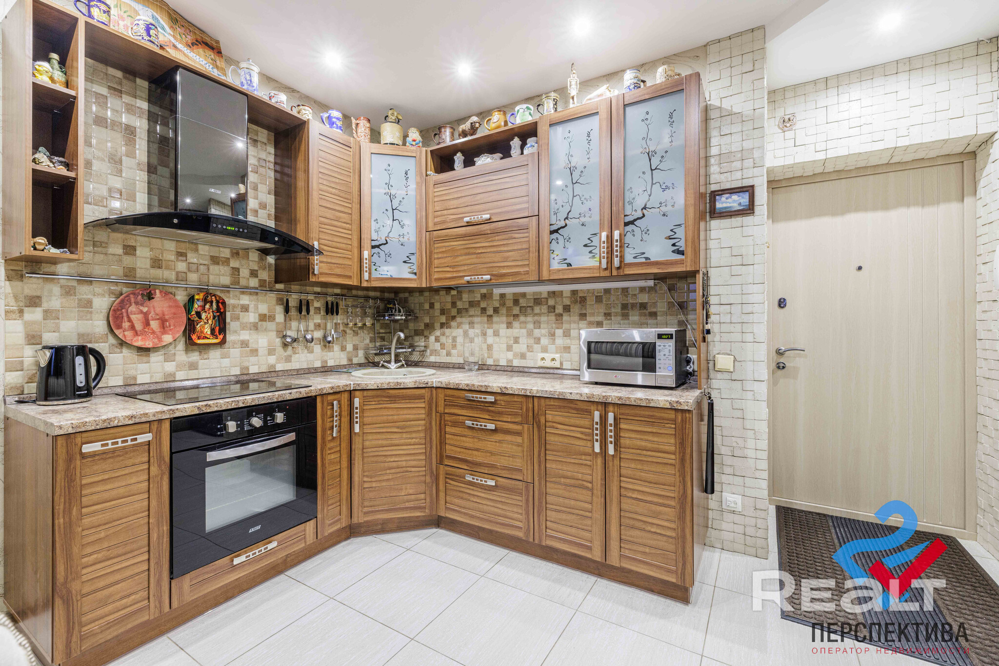 Жилье с ремонтом: на полу лежат кафель с подогревом и ламинат. Кухня обставлена техникой и мебелью. В коридоре стоит шкаф.