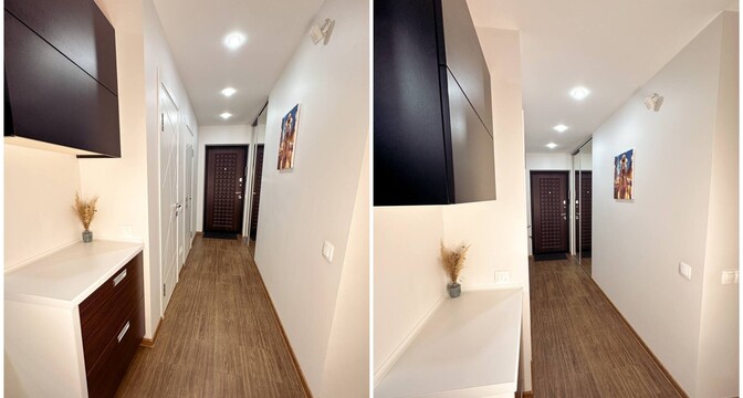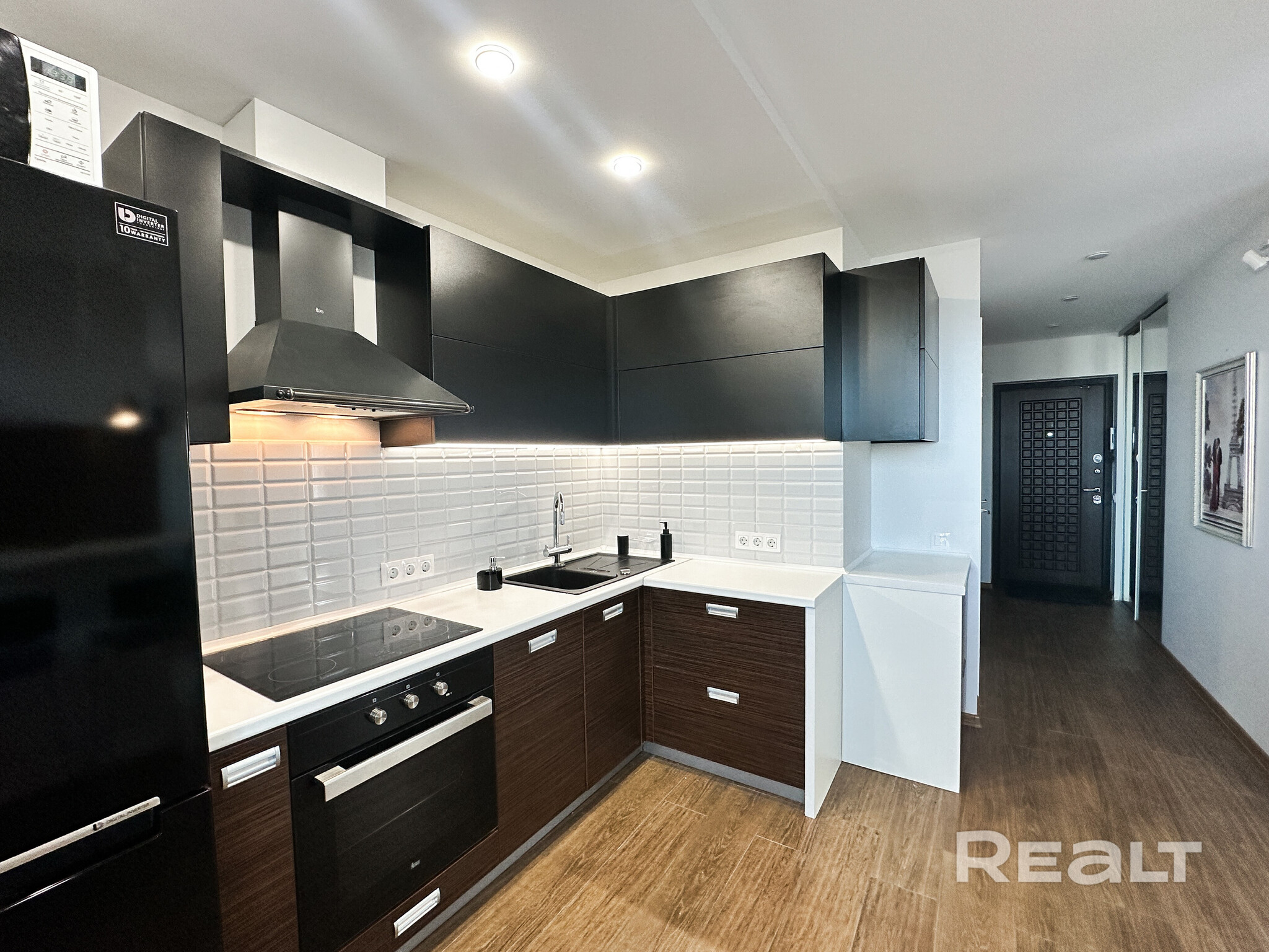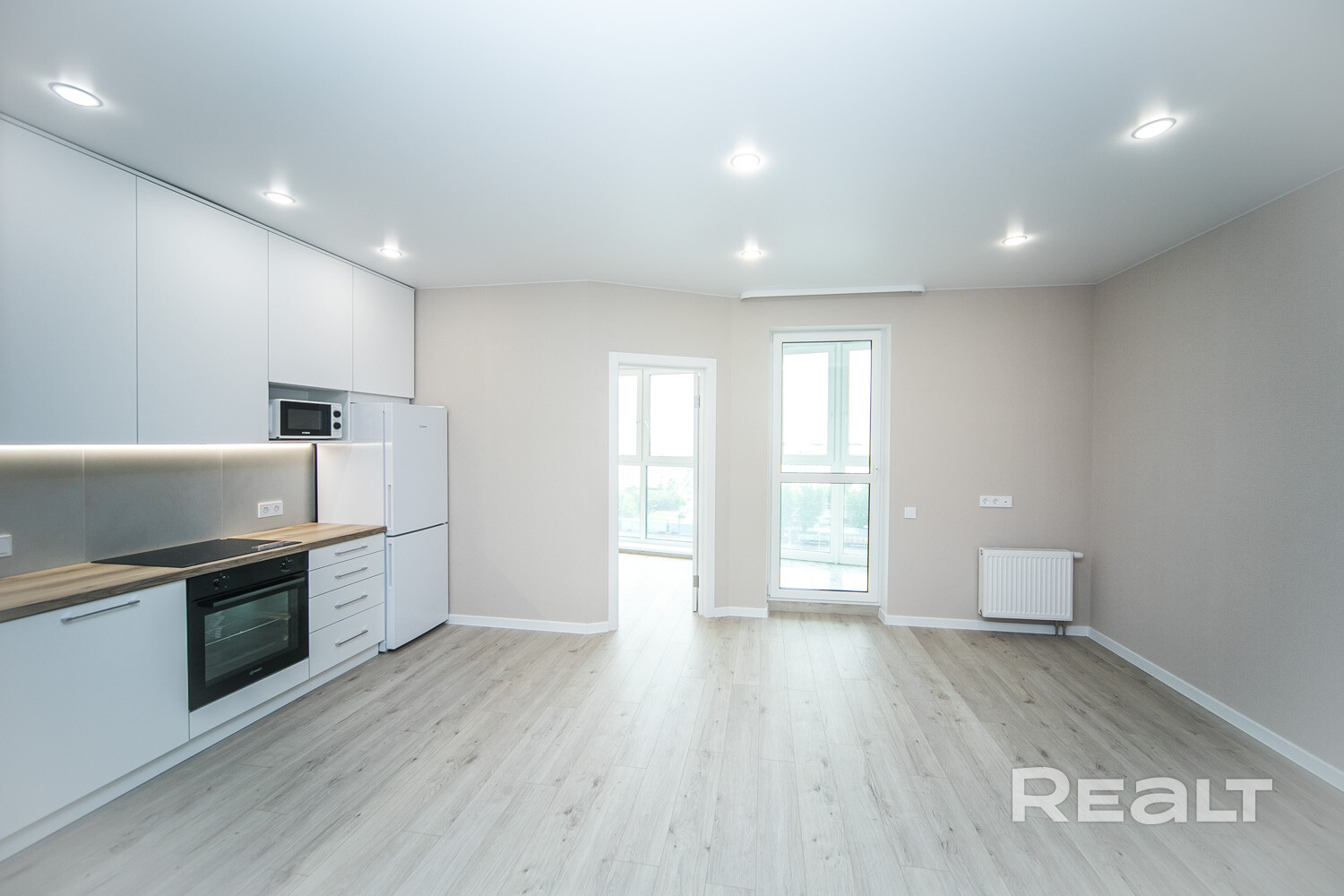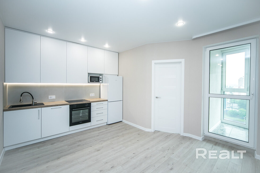 Евродвушка с новым ремонтом. Сюда осталось завезти лишь мебель и вещи. Но кое-что владельцы жилья уже предусмотрели. Например, установлен кухонный гарнитур с бытовой техникой: духовым шкафом, варочной панелью, микроволновой печкой и холодильником.