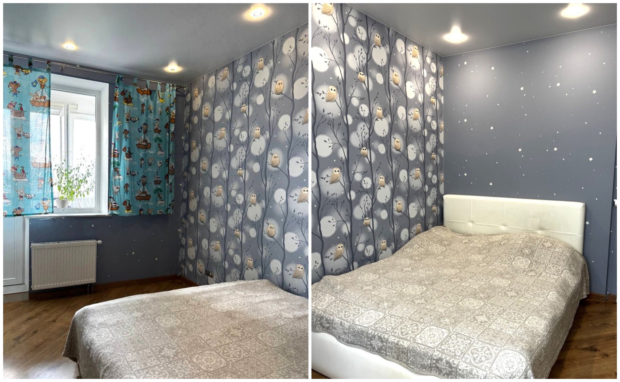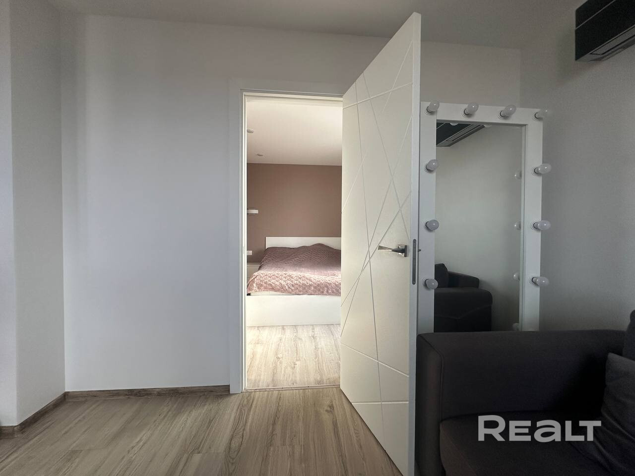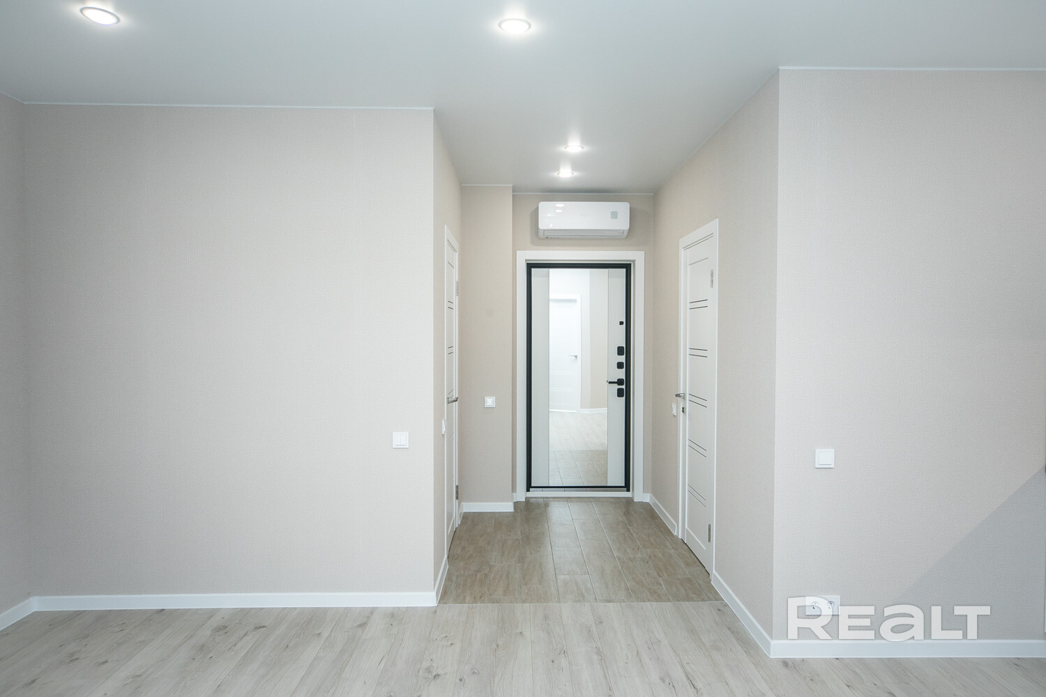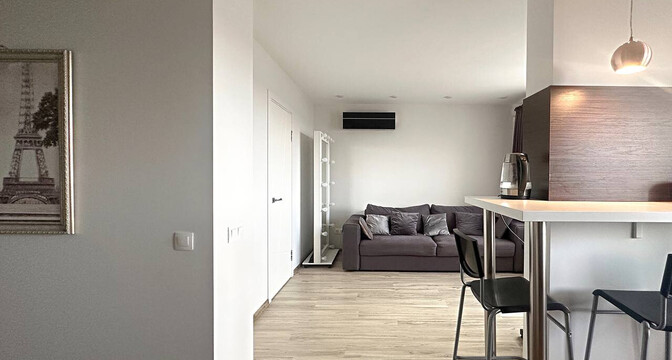 На полу лежат керамогранит и влагостойкий ламинат. По всей квартире сделаны матовые натяжные потолки с точечным освещением. Установлен кондиционер.