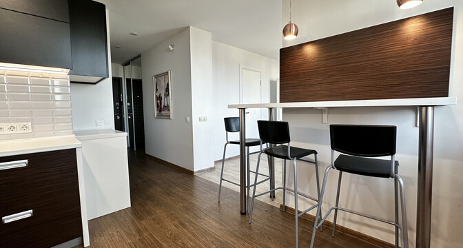 Жилье с ремонтом. Имеется встроенная кухня со всей необходимой техникой. На полу лежит ламинат. Стены оклеены обоями. Потолки тут натяжные. Их высота достигает 2,75 метра.
